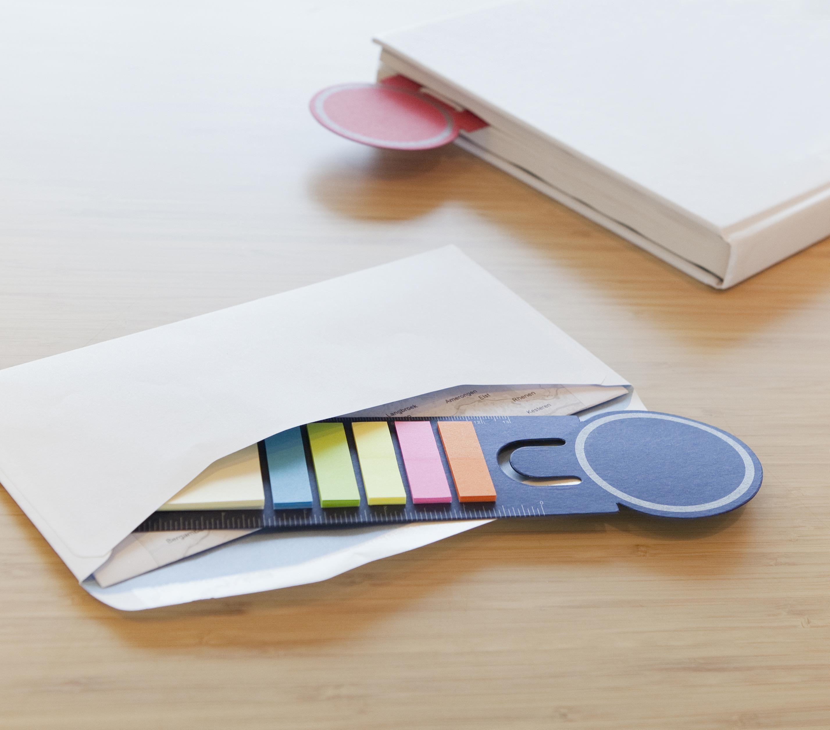 Estojo de cartao com regua de 12 cm e 175 notas.
