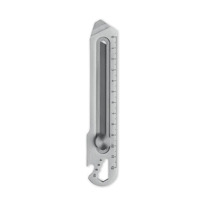 Faca retráctil em aço inoxidável com 8 lâminas em aço-carbono, abre-garrafas, chave inglesa e régua.