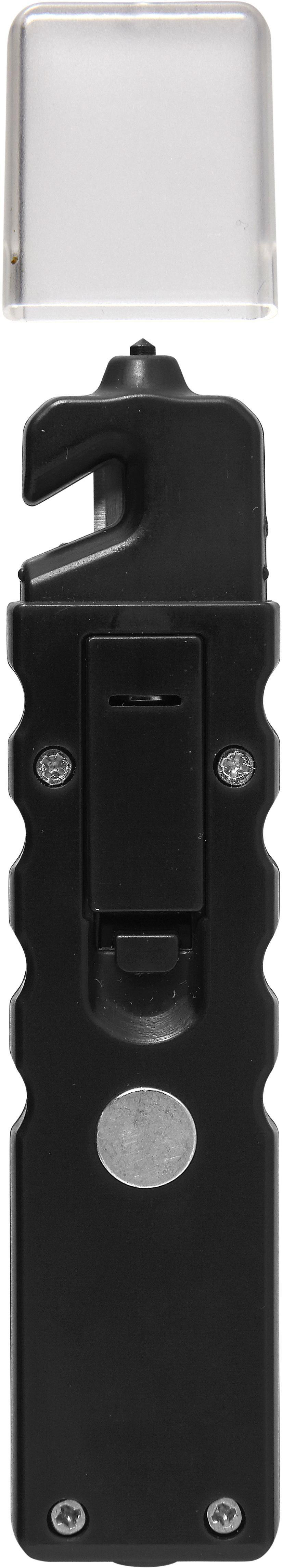 Ferramenta de segurança multifuncional. A ferramenta vem com uma luz COB com quatro LEDs (inclui opção intermitente) e corte de cinto de segurança/quebra de janelas. A ferramenta vem equipada com um íman e inclui 4 pilhas.