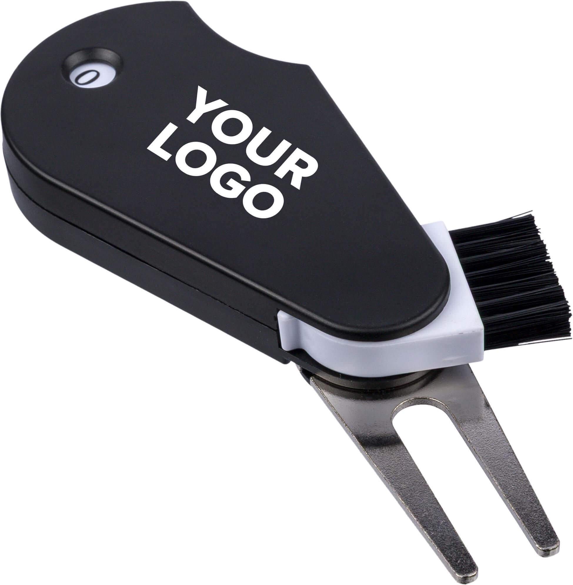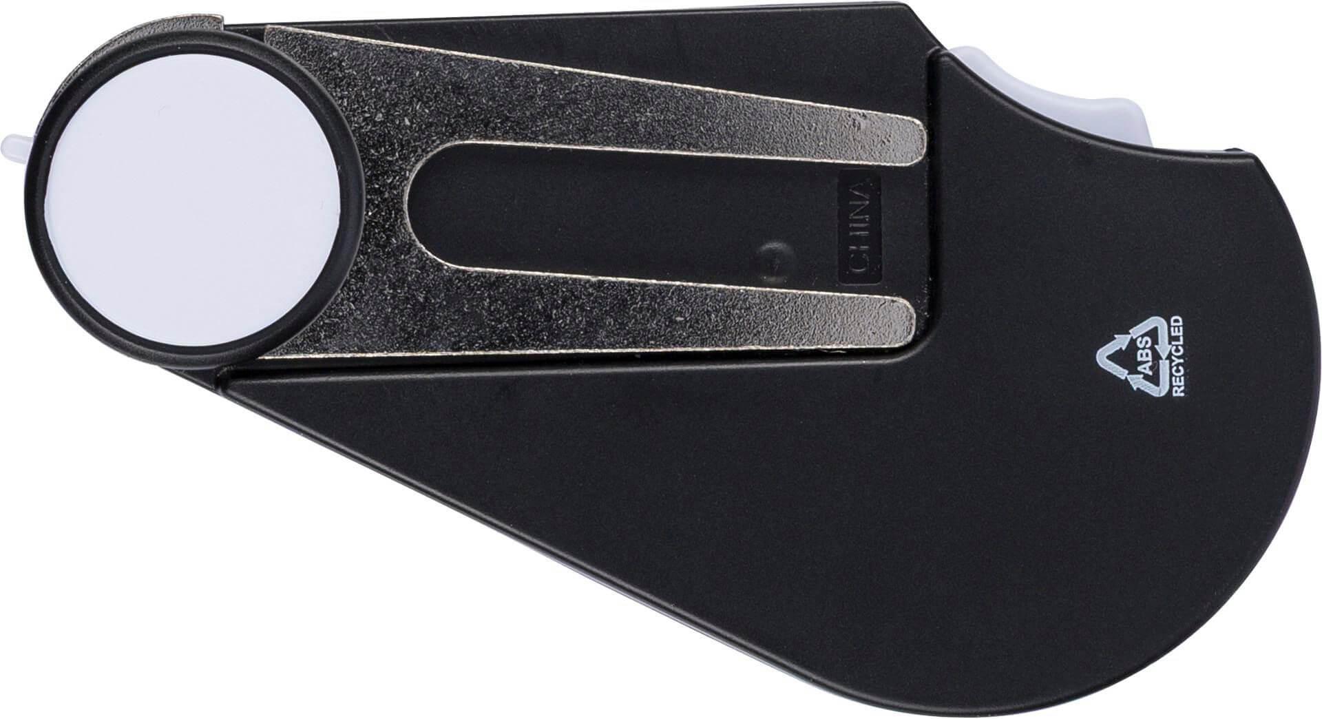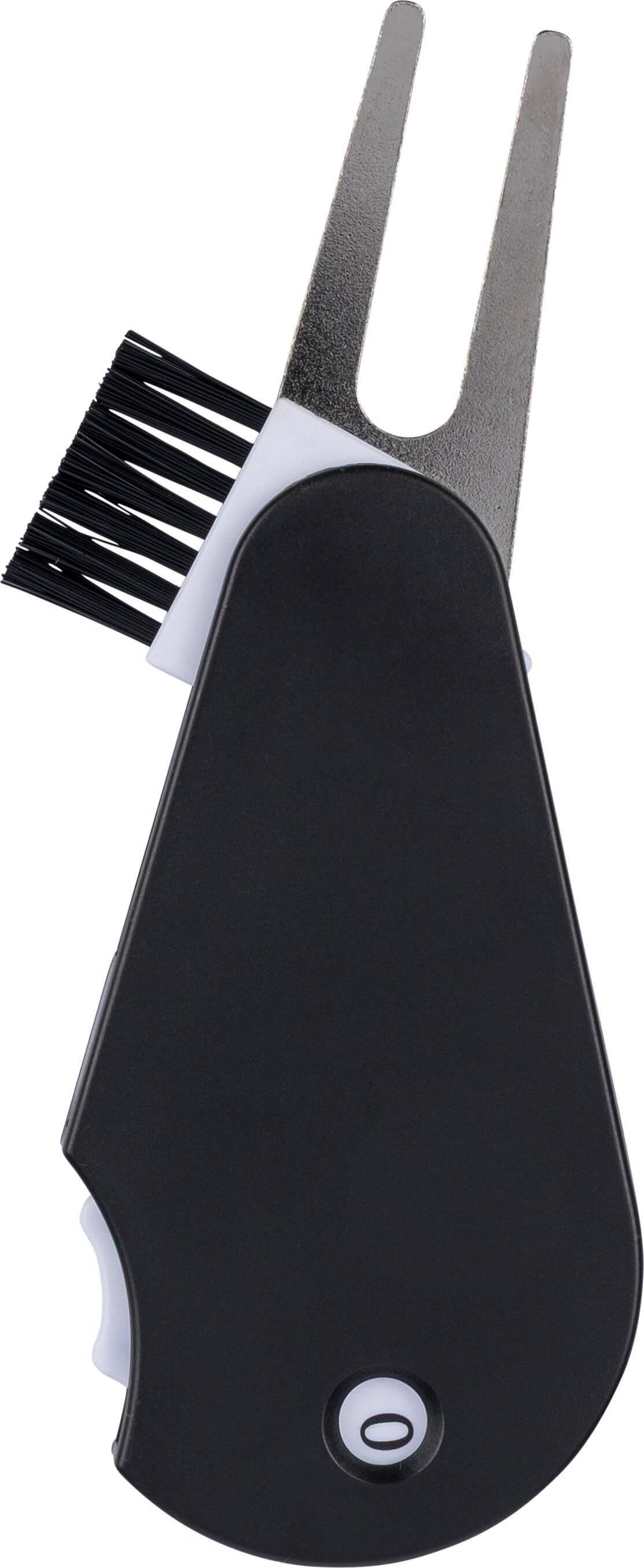 Ferramenta multifuncional para golfe em ABS reciclado com marcador integrado, garfo, escova de limpeza e contador de pontos. Apresenta um logótipo em ABS reciclado na parte de trás. Embalado num saco plástico reciclado.