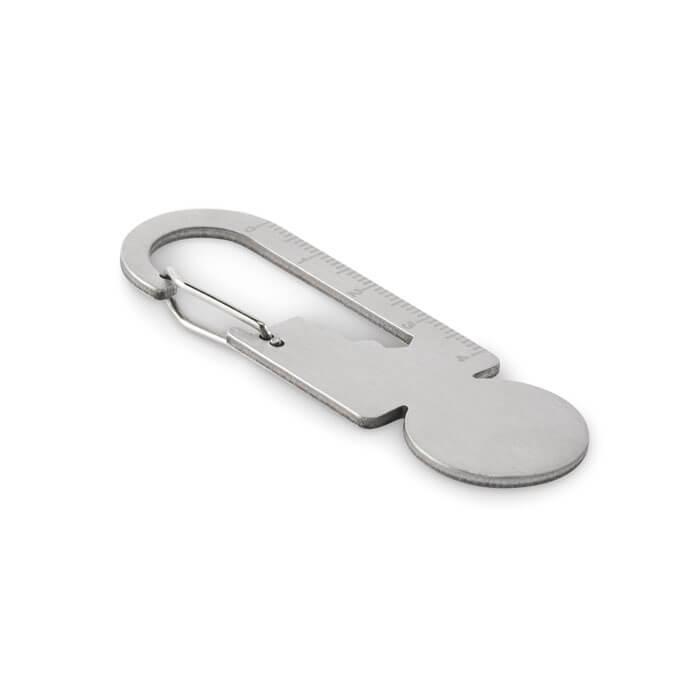 Ficha de carrinho com porta-chaves em aço inoxidável reciclado (90% aço inoxidável reciclado e 10% aço inoxidável) com ferramenta multifunções incluindo abre-garrafas, régua e chave hexagonal de 5,5 mm, 7 mm e 8 mm