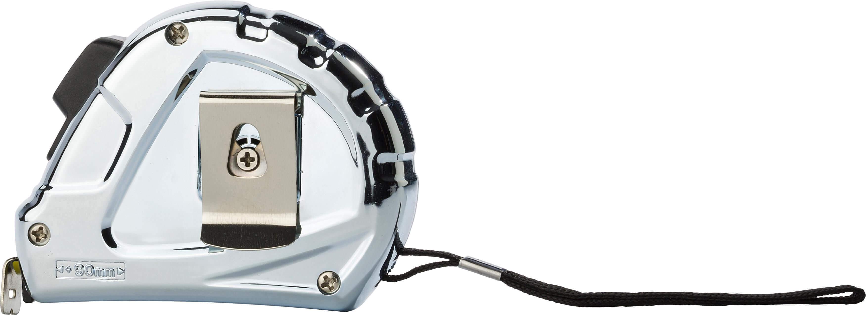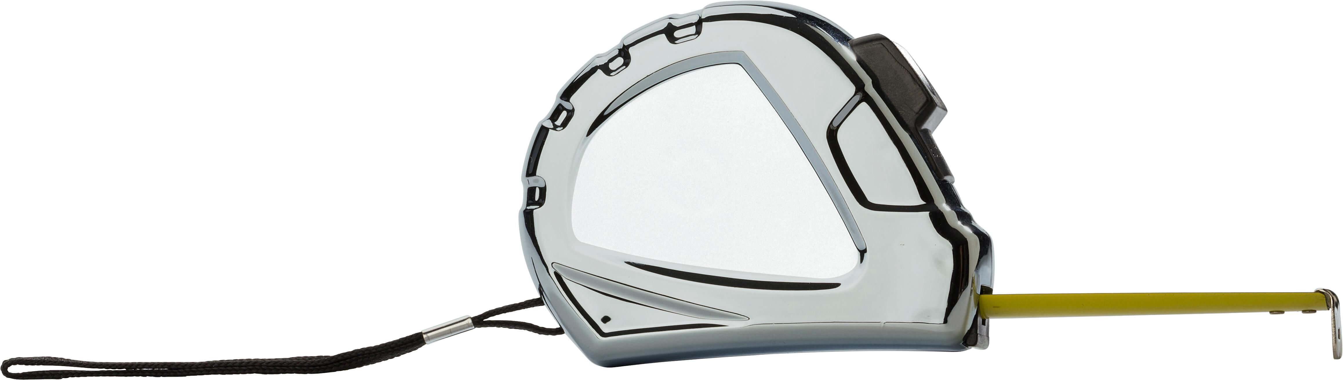 Fita métrica 5 metros, com revestimento plástico prata brilhante, com freio e clipe. Sistema métrico em centímetros