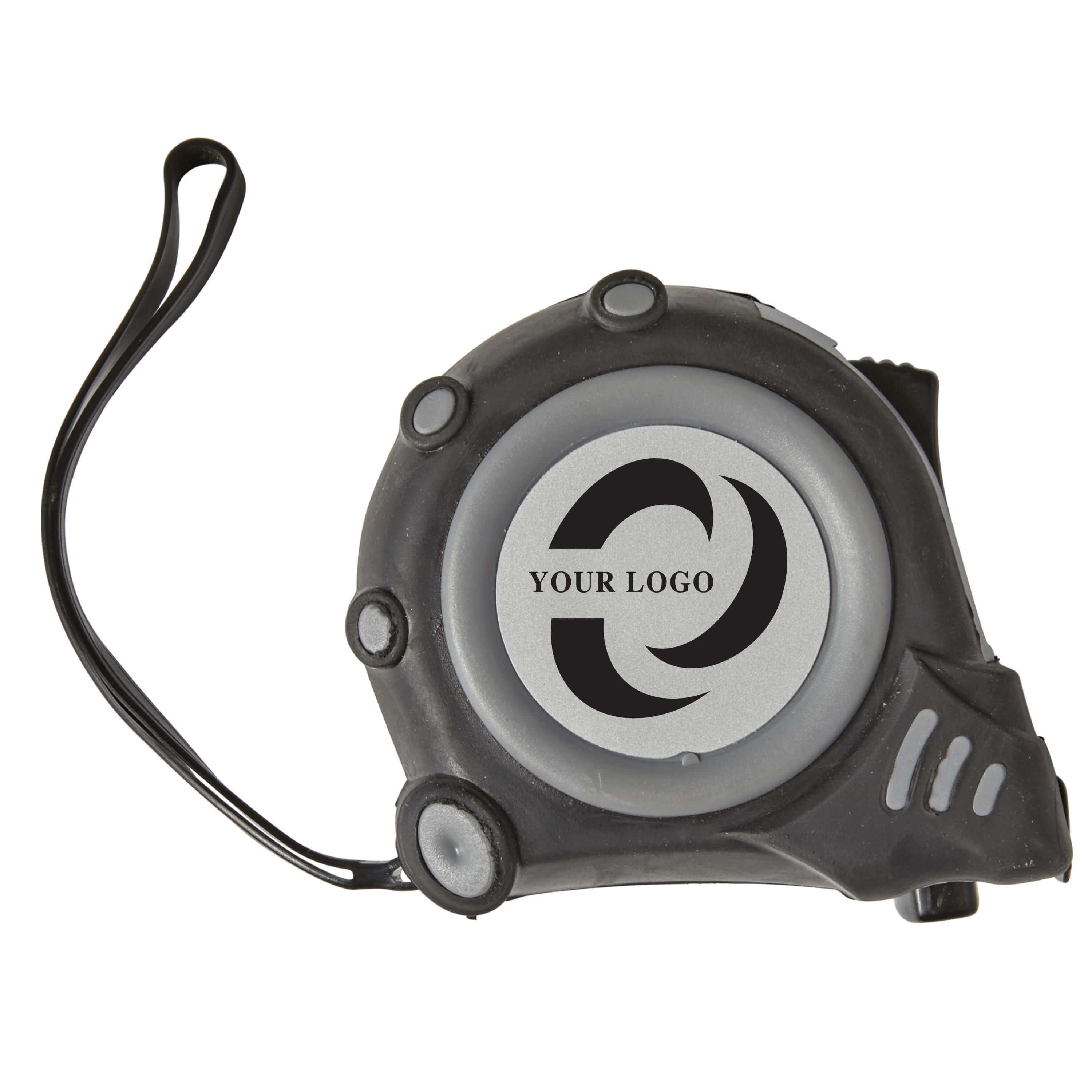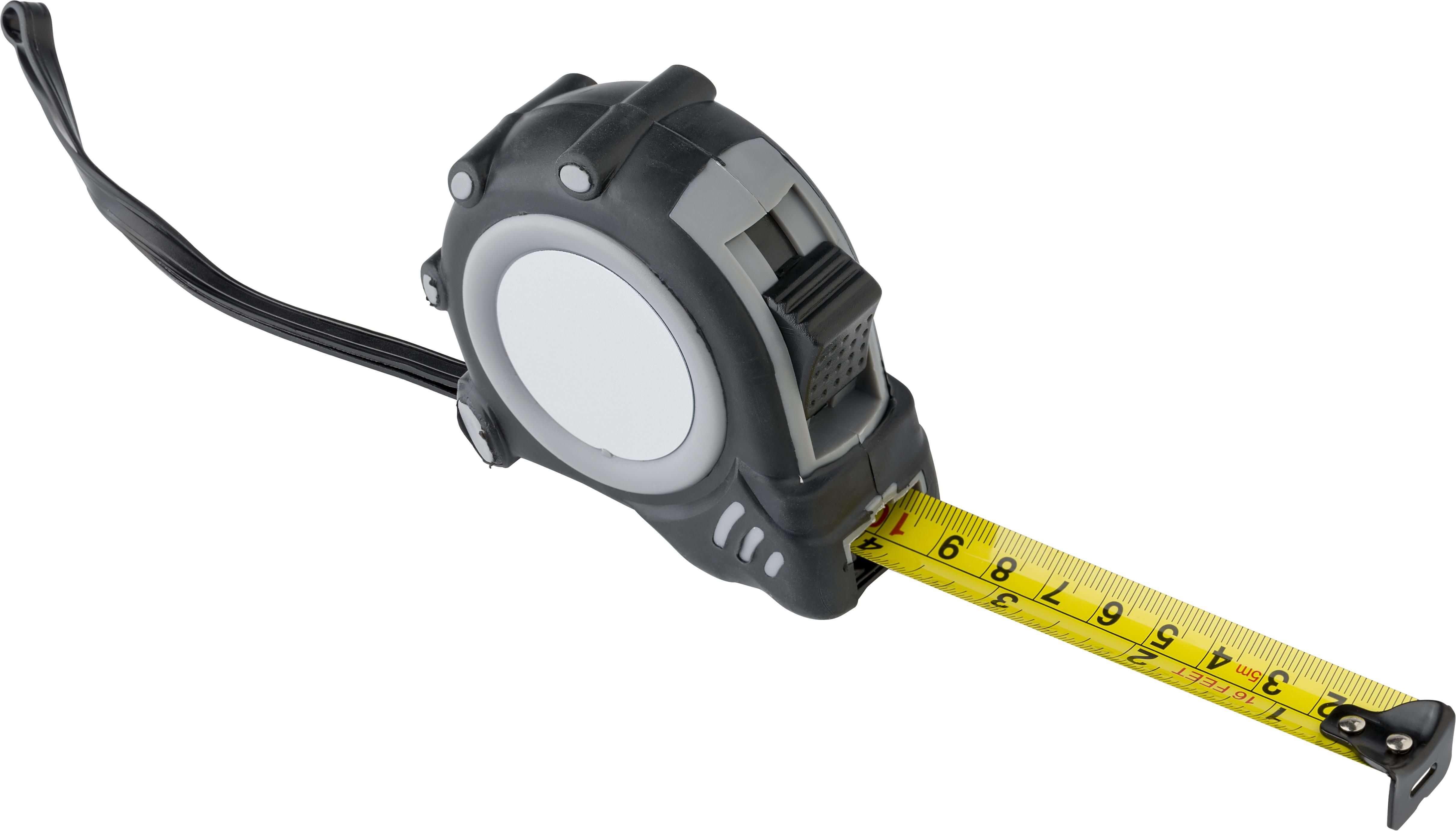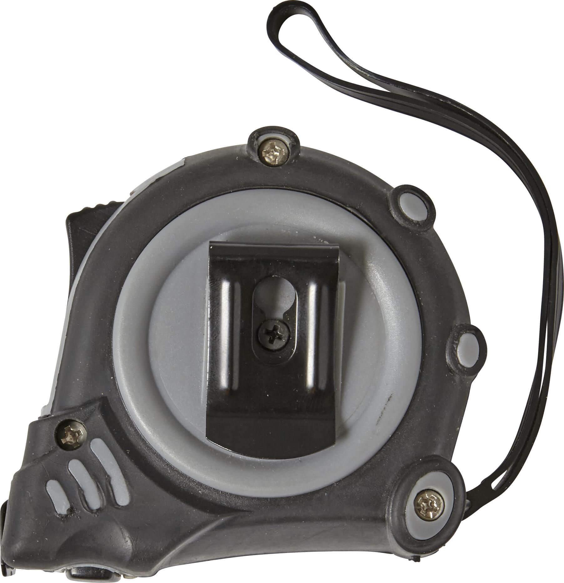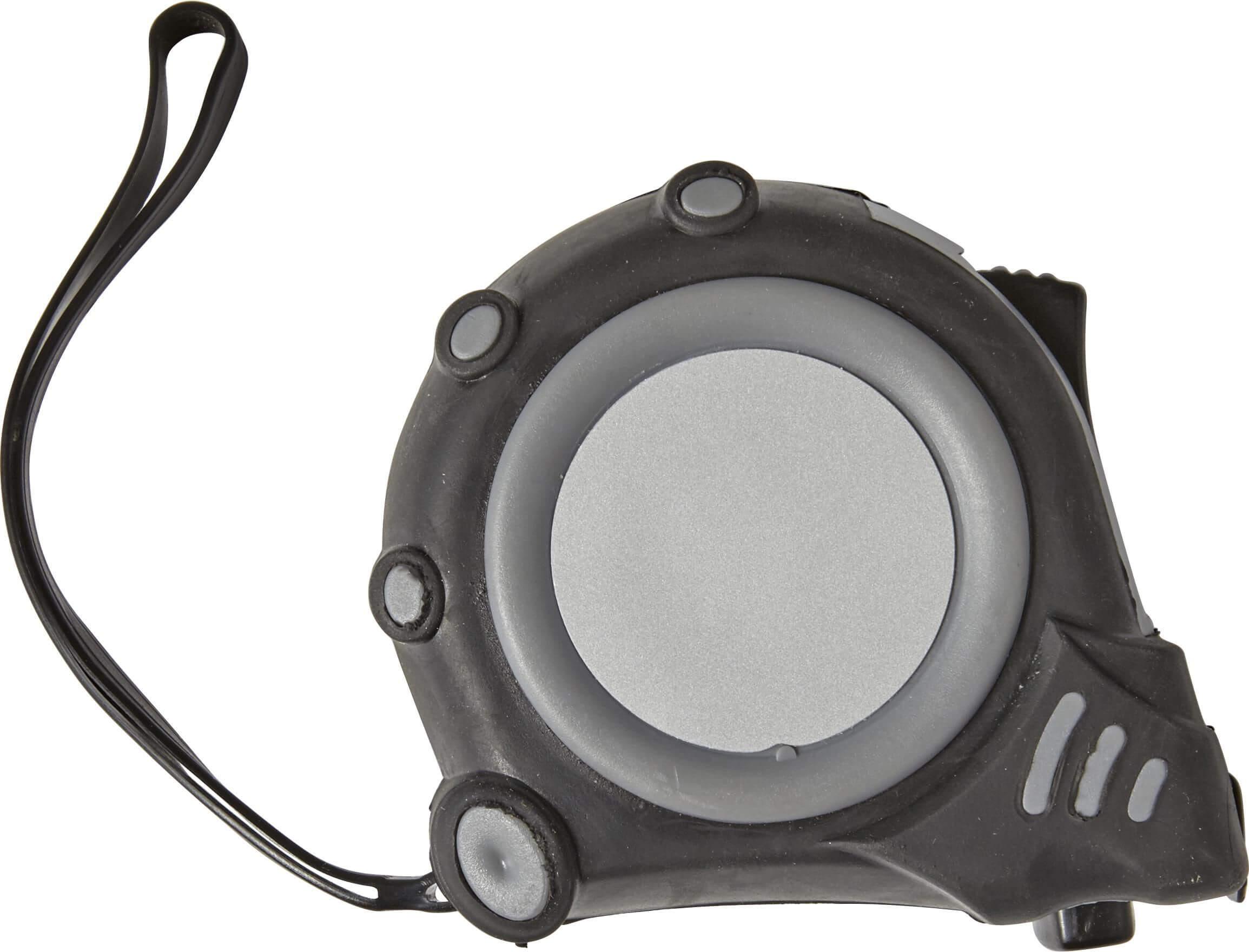 Fita métrica de plástico com 5 metros, com clipe para o cinto e corda. Sistema métrico em centímetros e polegadas.