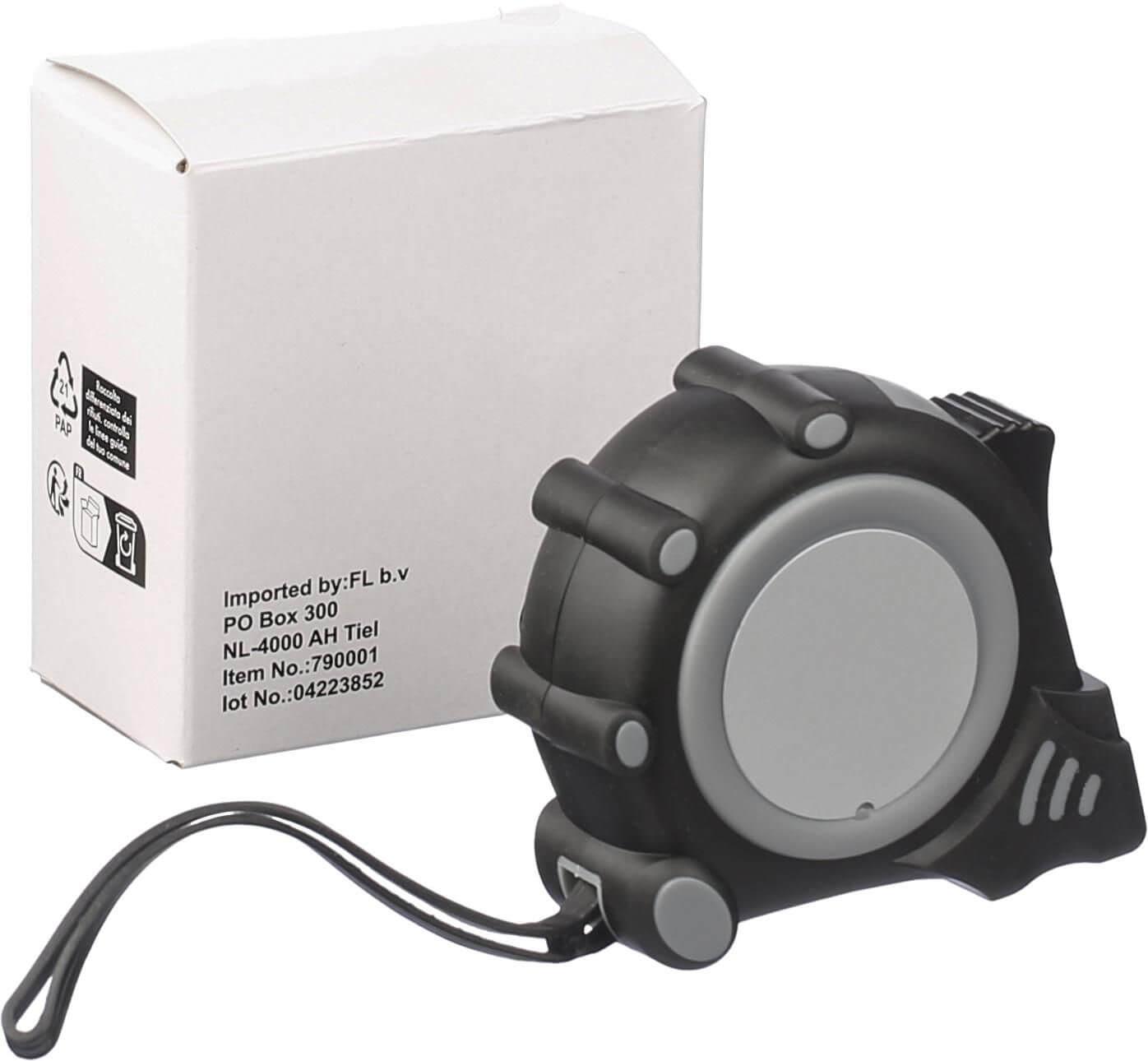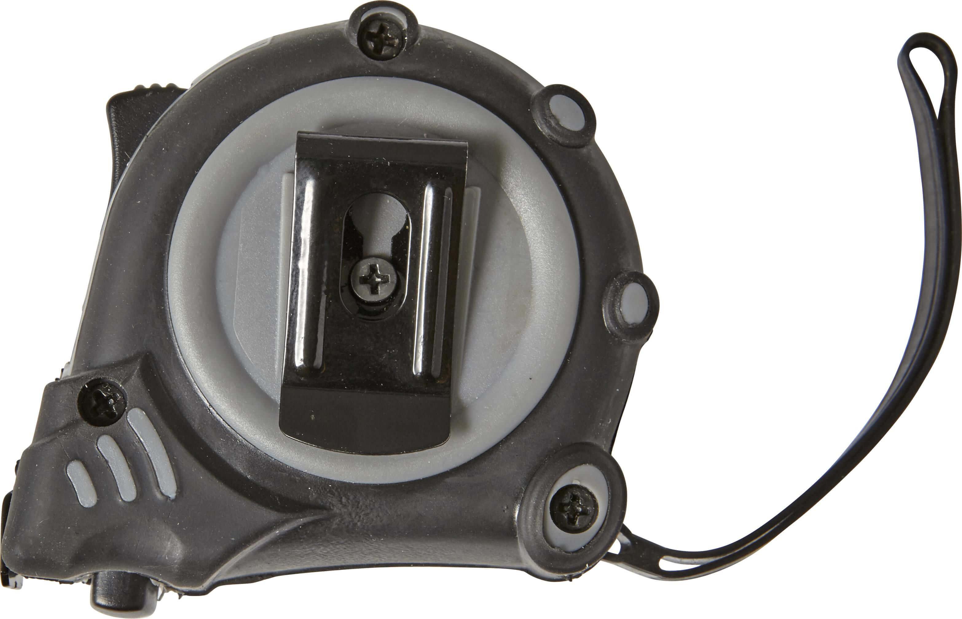 Fita métrica calibrada (3 metros) em plástico com polegadas e centímetros; com clipe de cinto e correia de pulso.