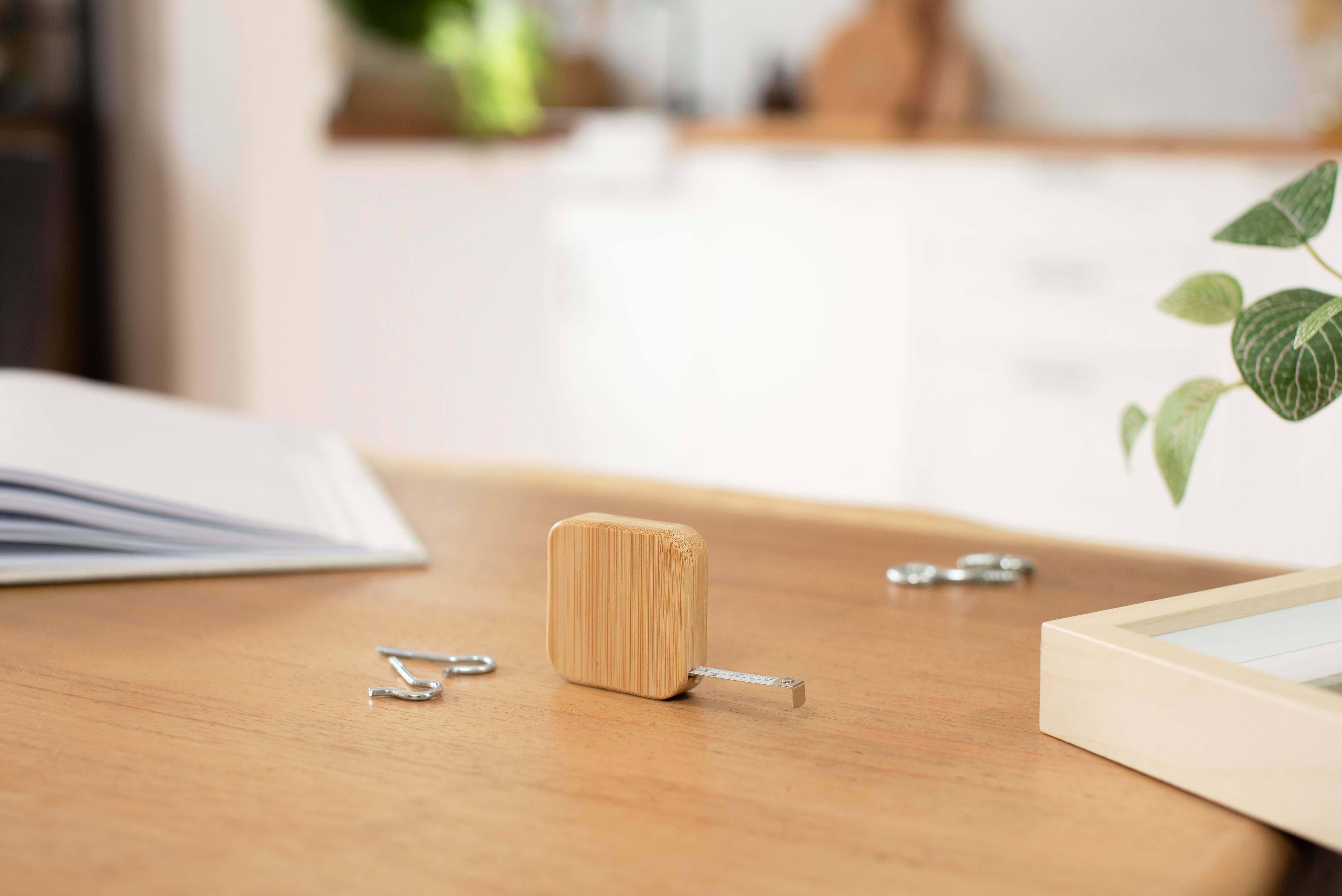 Fita métrica em bambu (1 metro). Apresentada numa caixa de oferta.