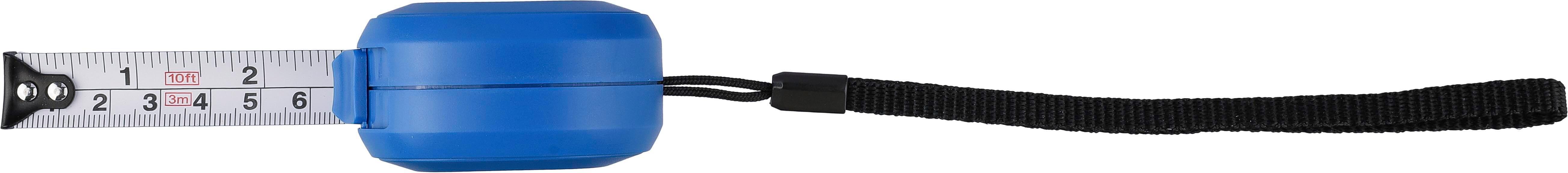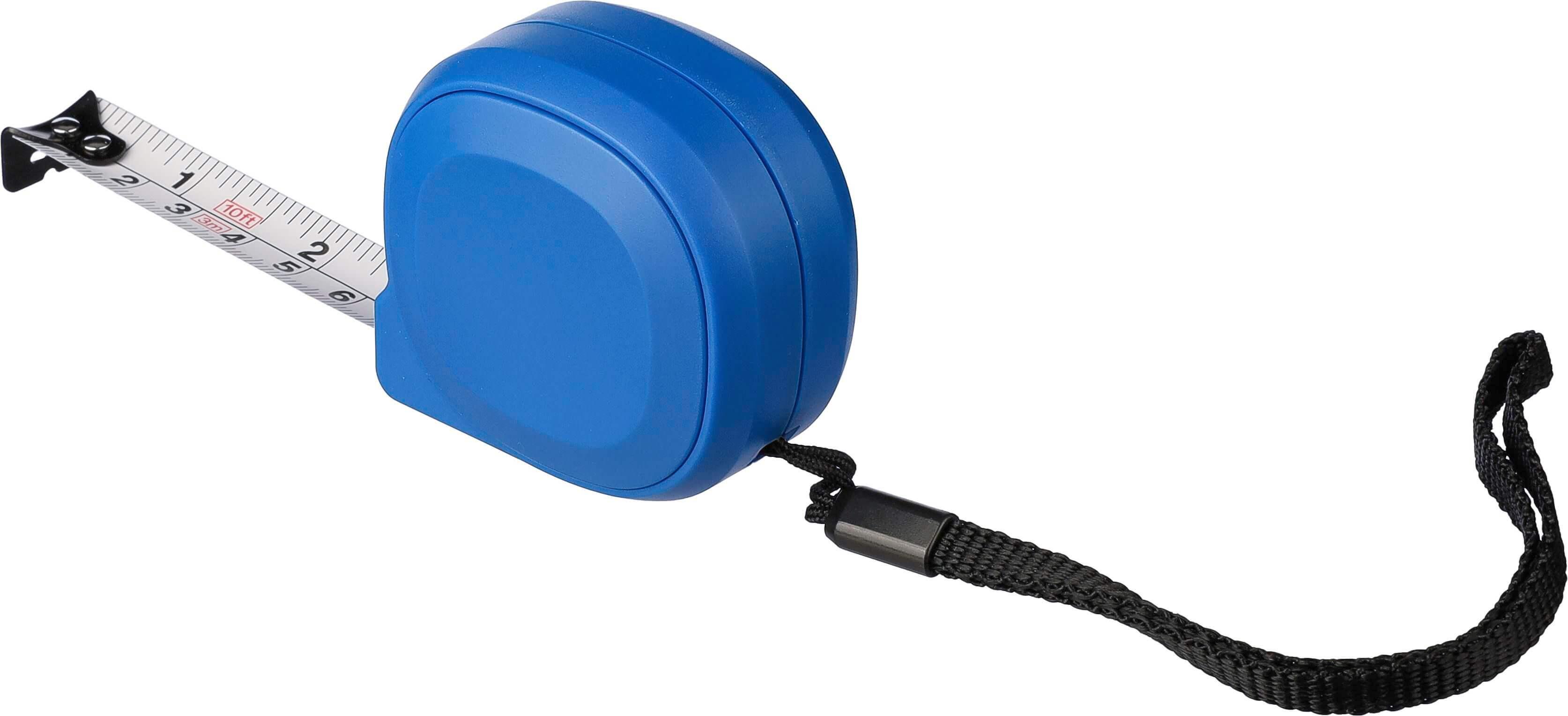 Fita métrica em ABS com bracelete em poliéster. 3 metros de comprimento. Fita metálica (16 mm), com impressão em centímetros e polegadas. Inclui um botão de pressão com um cadeado. Apresentada individualmente numa caixa de cartão castanha.