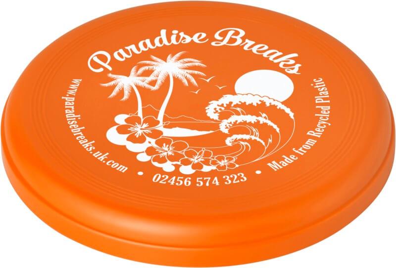 Frisbee sólido fabricado de plástico reciclado pós-consumo. O frisbee tem um acabamento salpicado devido à natureza do material reciclado. Em conformidade com a norma EN71. Não é adequado para crianças com menos de três anos. Diâmetro: 18 cm.