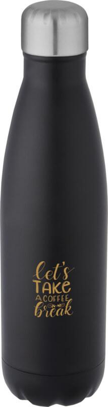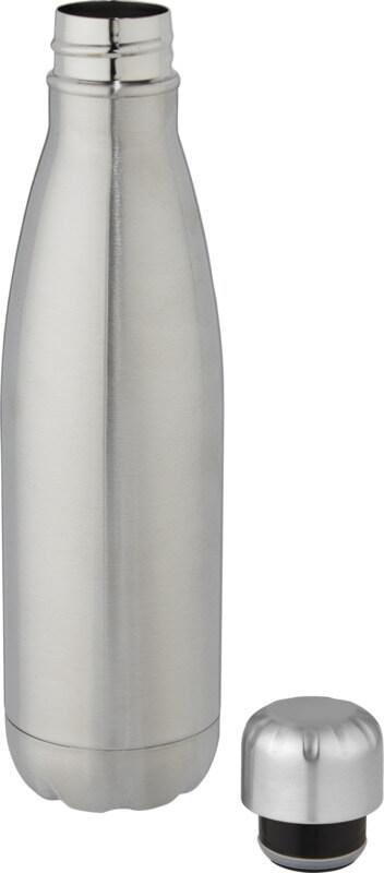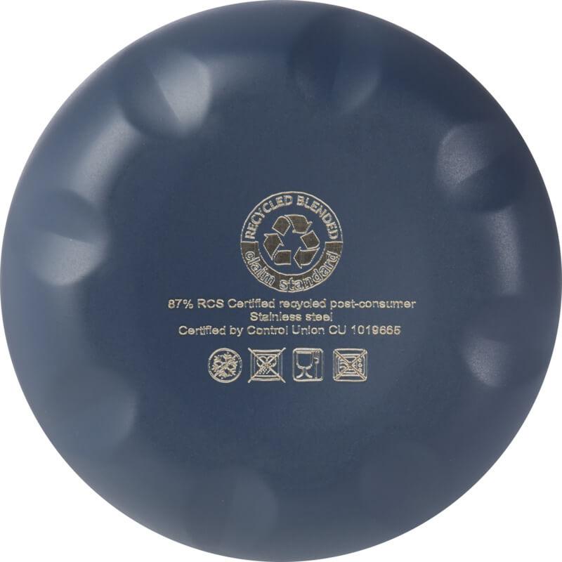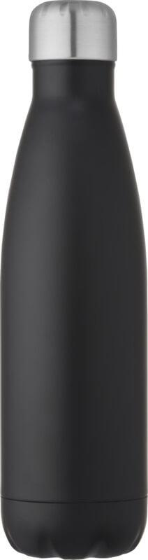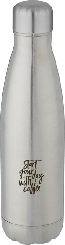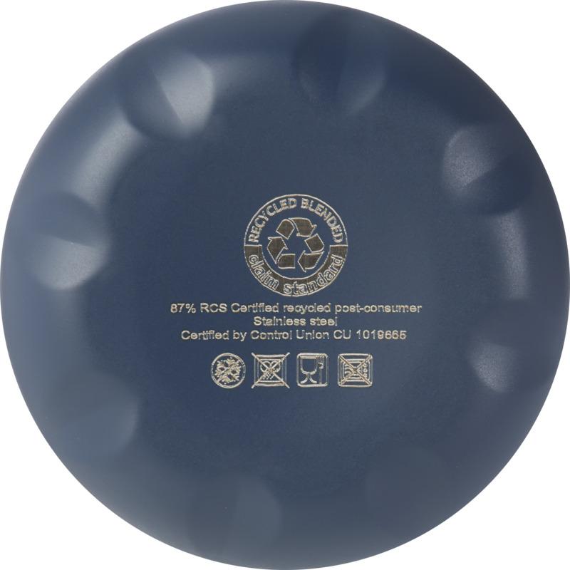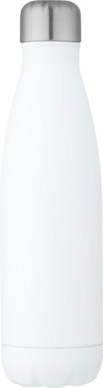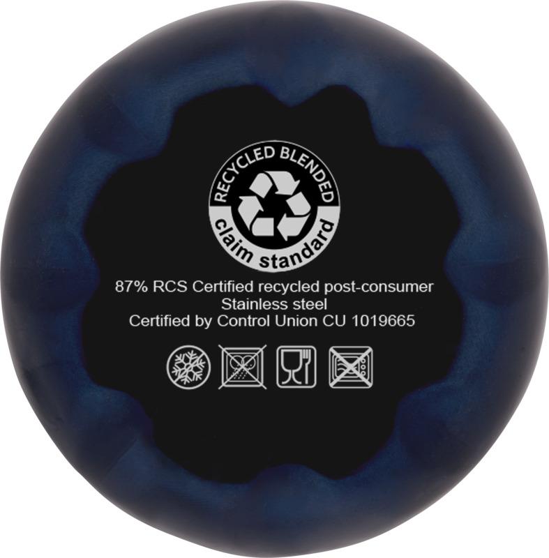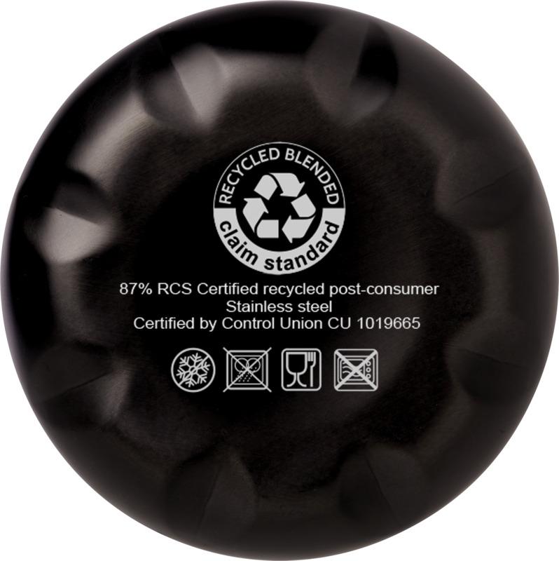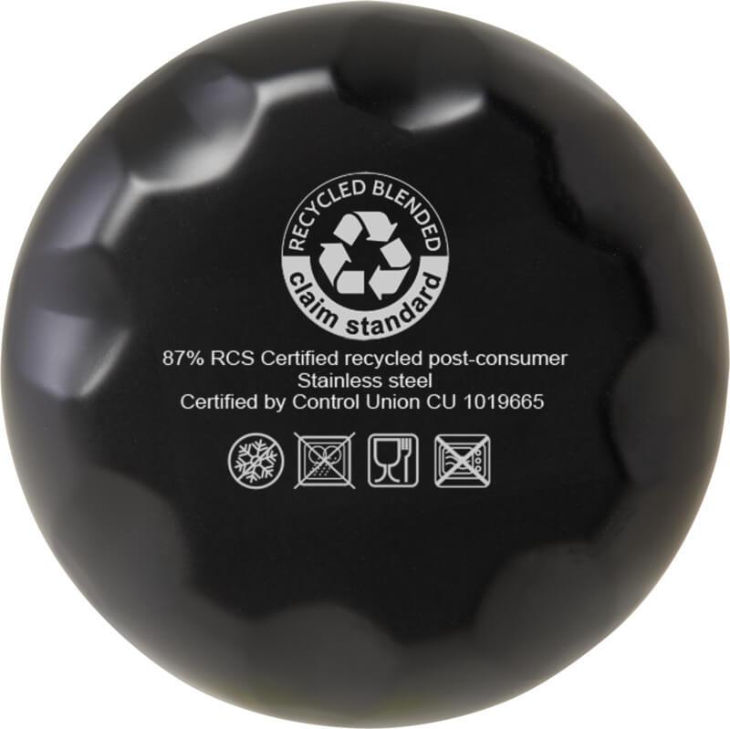 Garrafa de aço inoxidável reciclado com certificação RCS com isolamento a vácuo e um design icónico. Apresentando uma base que cabe na maioria dos porta-copos, esta garrafa de água elegante é um item promocional perfeito. Testado e aprovado sob a Legislação Alemã de Segurança Alimentar (LFGB), e testado para conteúdo de ftalatos de acordo com os regulamentos REACH. Capacidade volumétrica de 500 ml. Apresentada numa caixa de presente de cartão reciclado. Mantém as bebidas quentes durante 12 horas e frias durante 24 horas.
