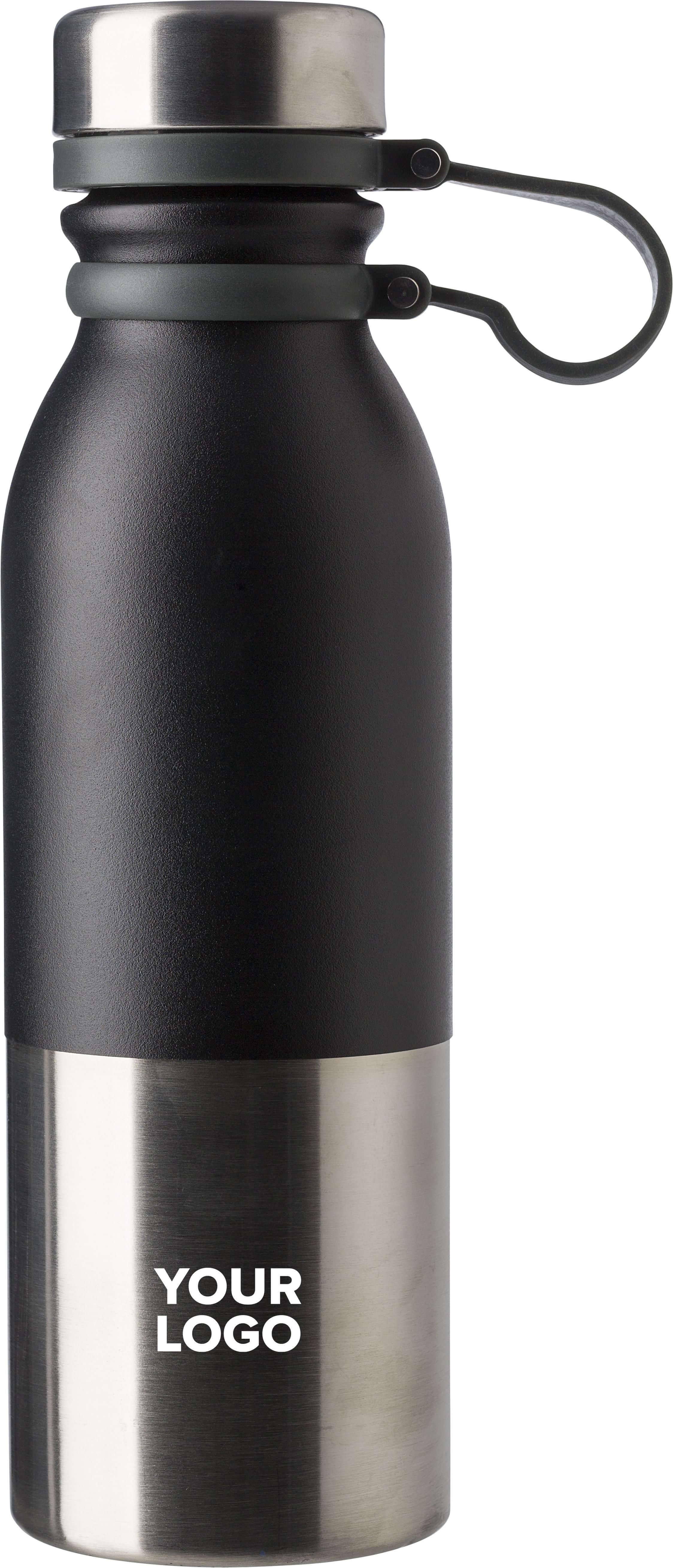 Garrafa de aço inoxidável, de parede dupla (600 ml). A fita de silicone mantém a tampa presa ao frasco. Embalado em caixa de oferta.