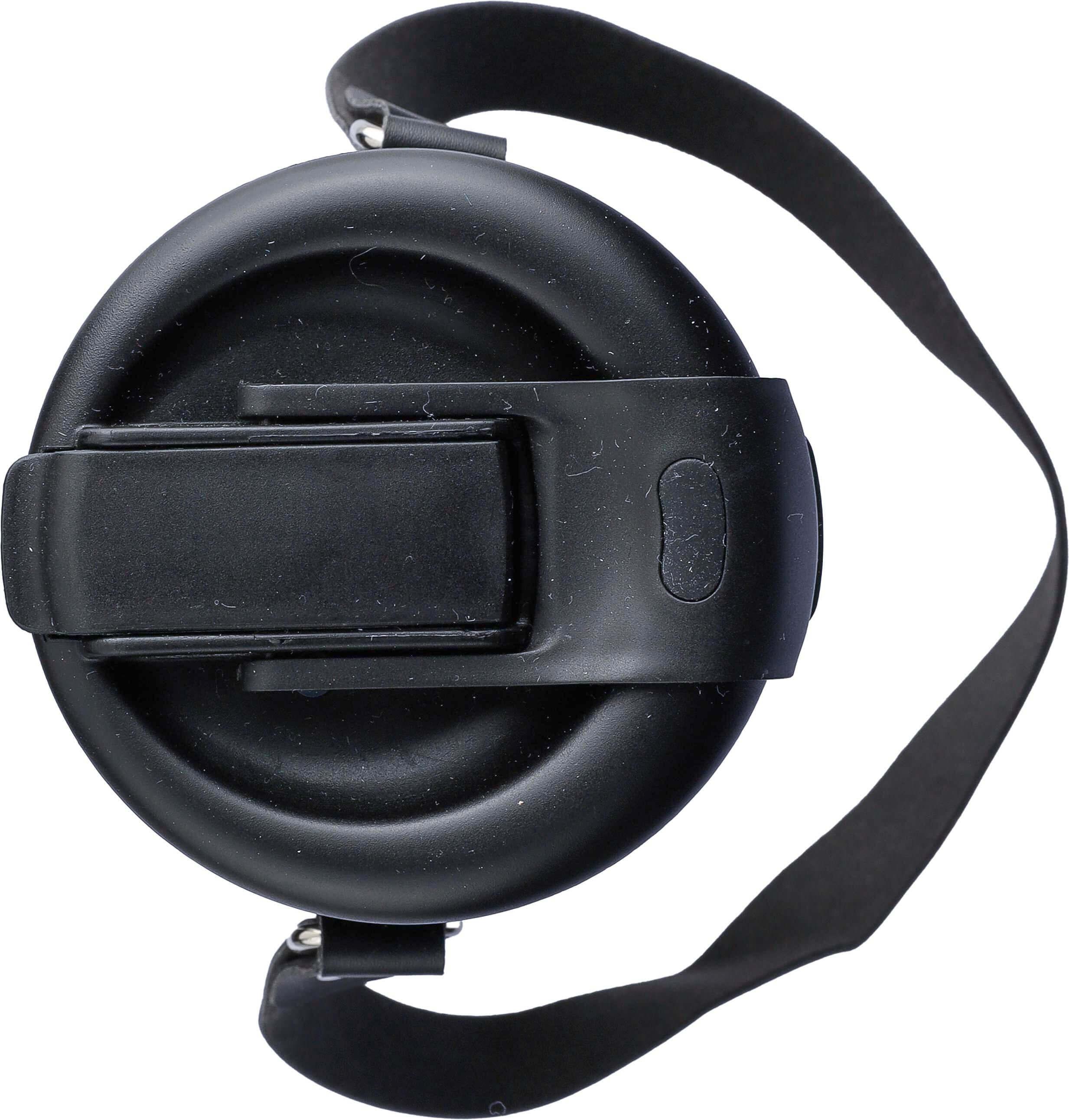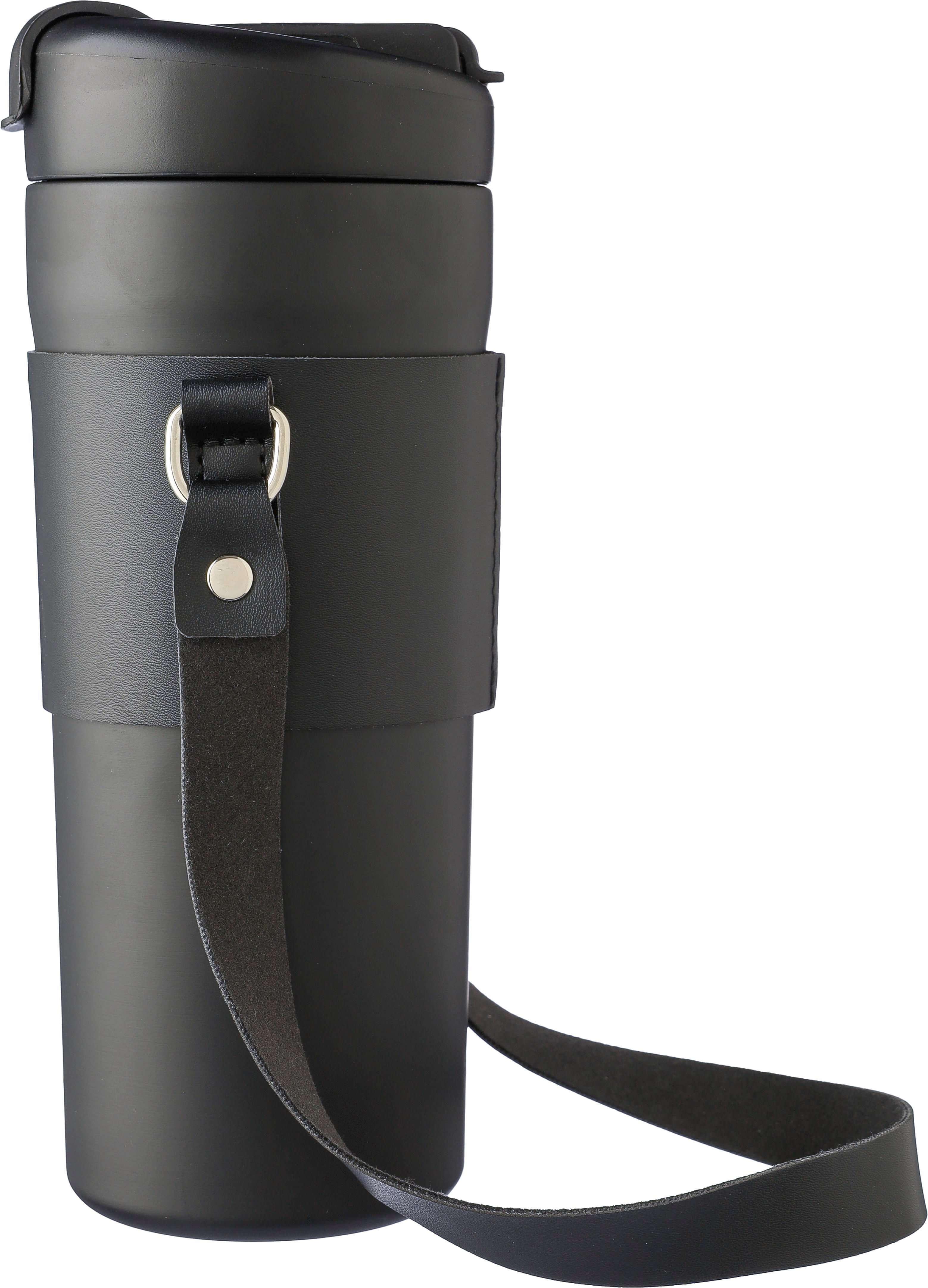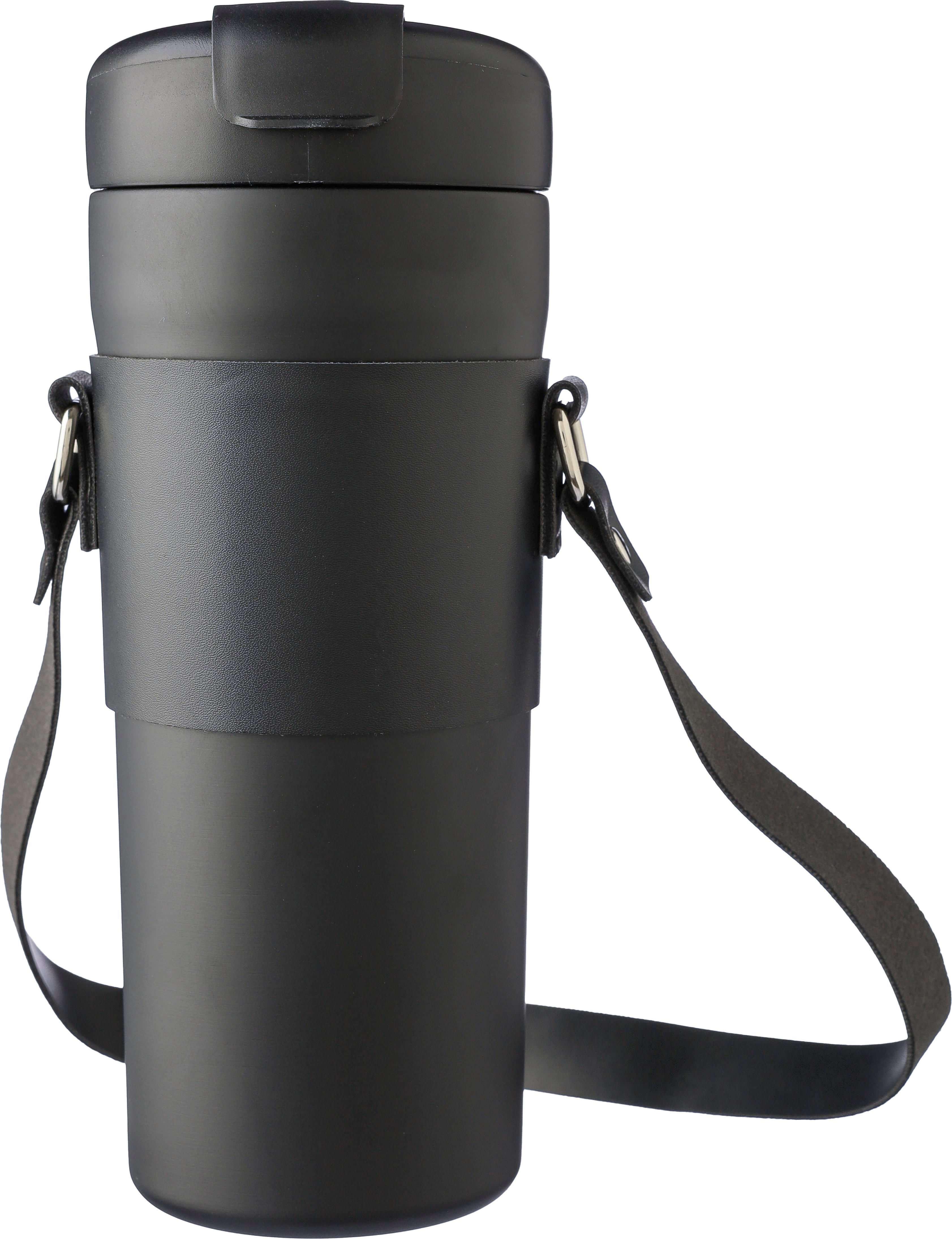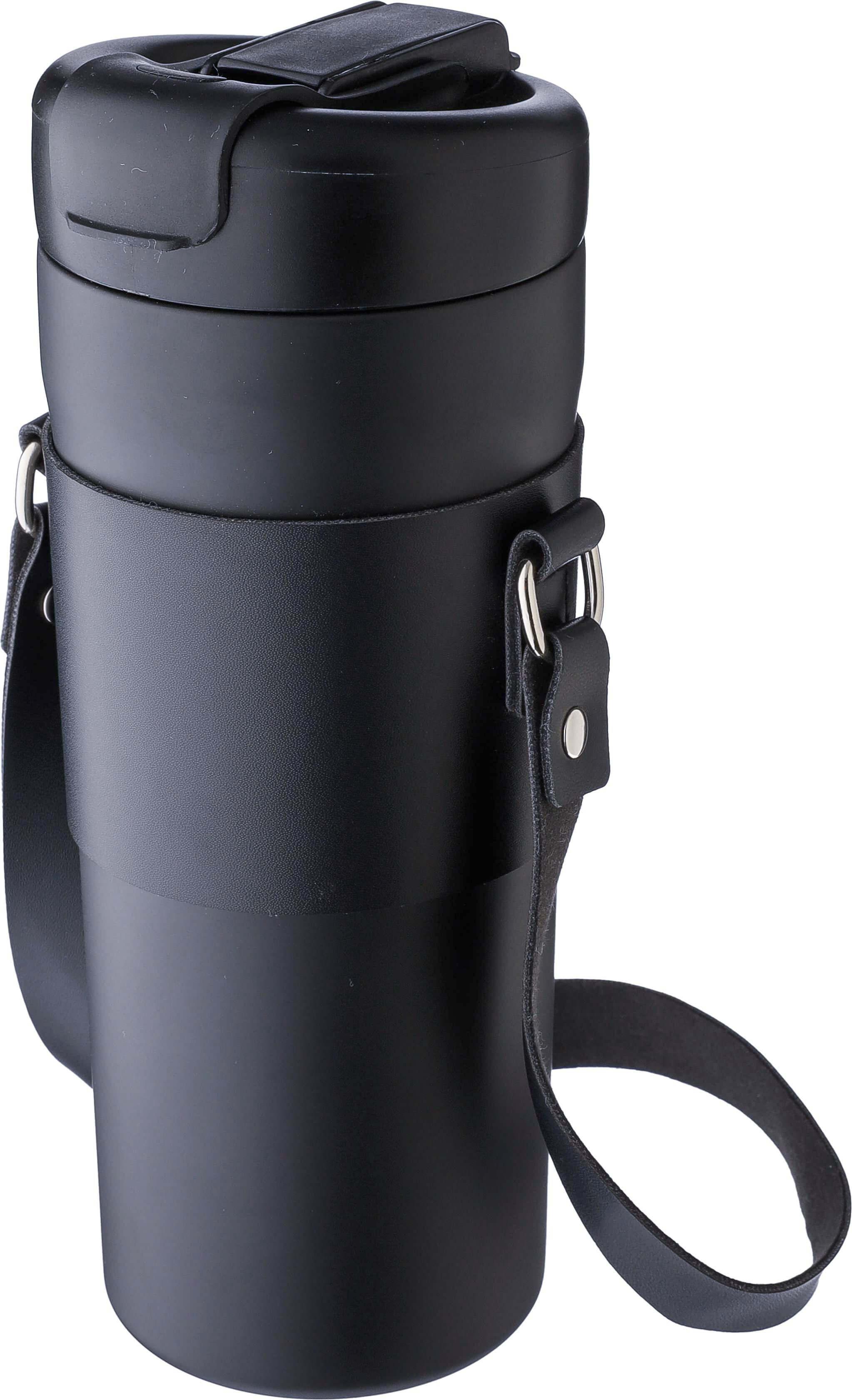 Garrafa de aço inoxidável de parede dupla (730 ml) com uma manga de transporte em PU, palhinha e alça. O interior é feito de aço inoxidável 304 e o exterior é de aço inoxidável 201. Tampa em PP com um botão de pressão para abrir ou fechar o bico e uma abertura separada para beber. Mantém o conteúdo quente durante 6 horas e frio durante 10 horas. Apresentada individualmente numa caixa de cartão castanha.