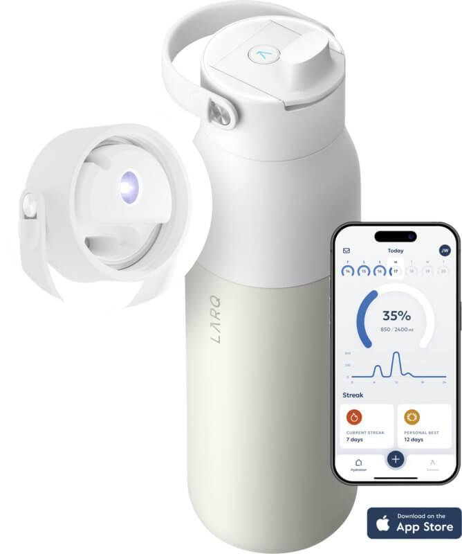 A garrafa de água “LARQ PureVis™ 2.0” é uma garrafa de 1000 ml multiusos, de autolimpeza e com filtro de água, com monitorização inteligente de hidratação. Melhora a qualidade da água através de um processo de filtragem de dois estágios e purificação UV-C, proporcionando uma água mais limpa e com melhor sabor. O LED UV-C na tampa é ativado automaticamente a cada duas horas para manter a garrafa limpa e sem odores, ou pode iniciar manualmente um ciclo PureVis™ com o toque de um botão. Com uma bateria de longa duração, a garrafa dura até 2-3 semanas com carga completa através da porta USB-C. A tampa possui uma pega integrada, removível e macia ao toque para um transporte prático. Os sensores inteligentes monitorizam a sua ingestão de água automaticamente, enquanto a aplicação LARQ fornece perspetivas e progresso. Os filtros devem ser substituídos regularmente para um desempenho ideal.