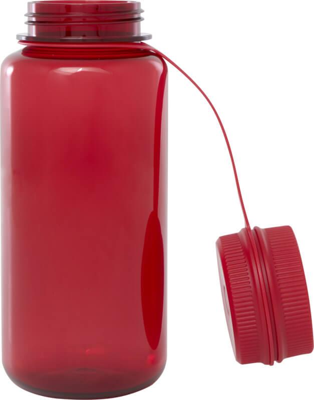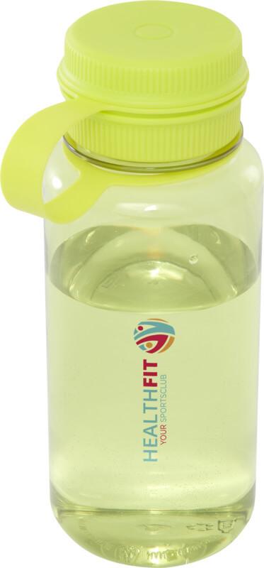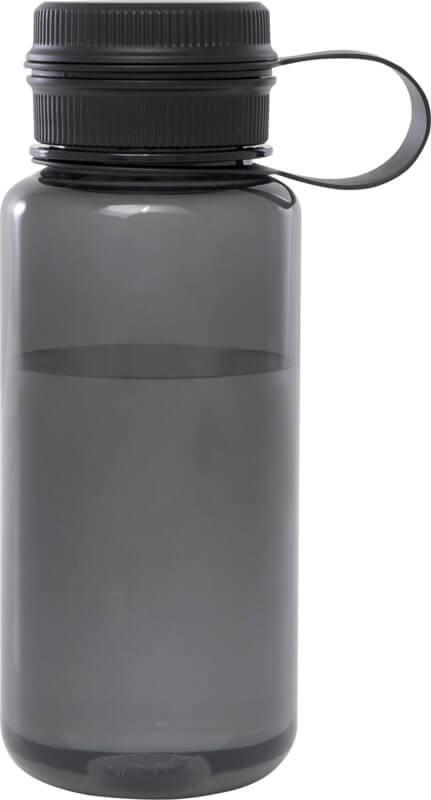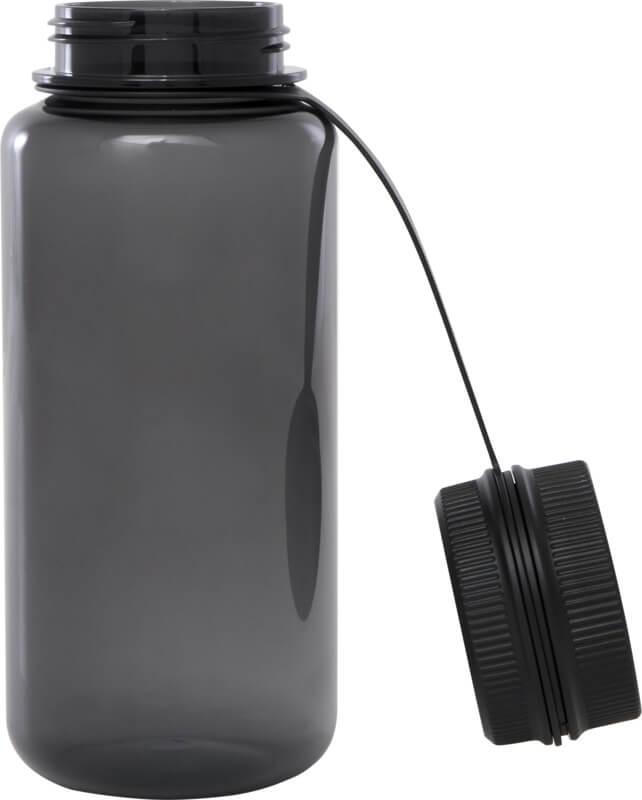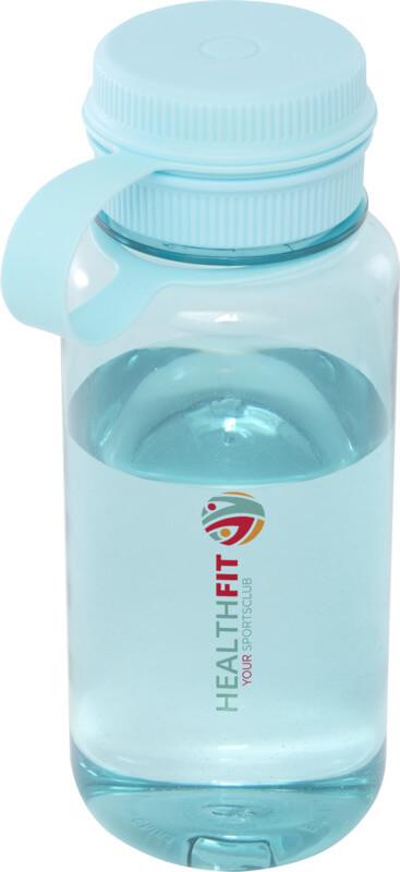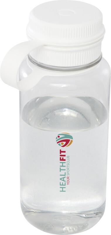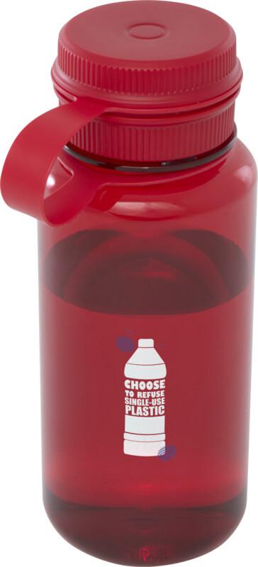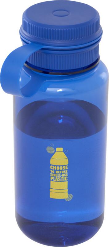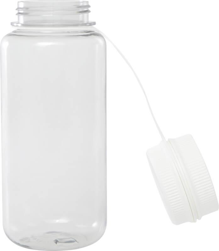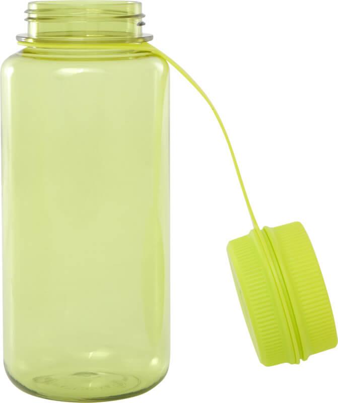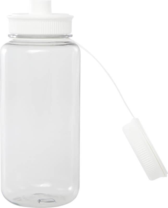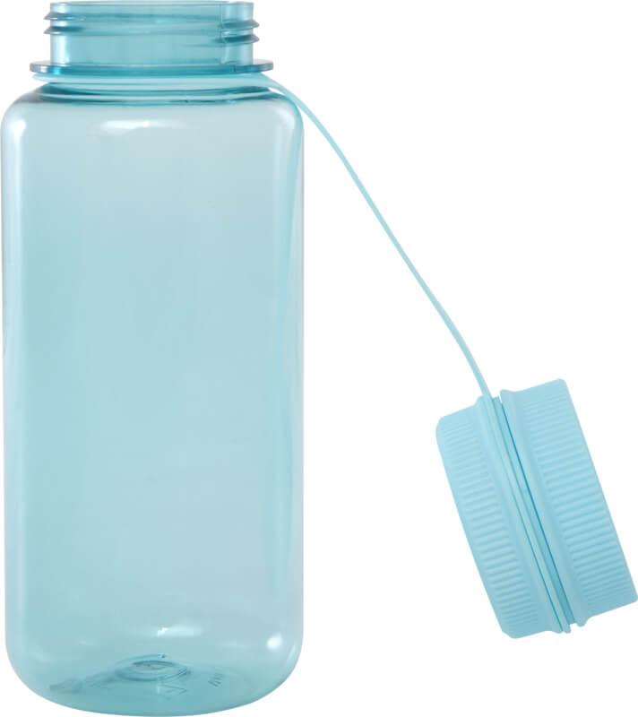 Garrafa de desporto de parede única feita de RPET com certificação RCS, com tampa de rosca e à prova de fugas, com uma pega prática integrada à tampa para transporte. Construção com abertura dupla para facilitar a limpeza e o enchimento. Em conformidade com o processo de reciclagem PET aprovado pela EFSA (Autoridade Europeia para a Segurança dos Alimentos). Capacidade volumétrica: 900 ml.