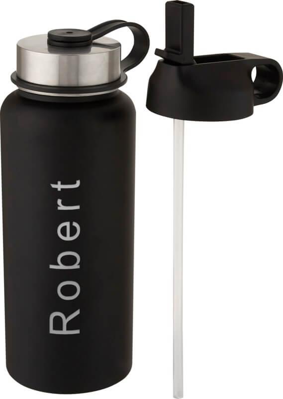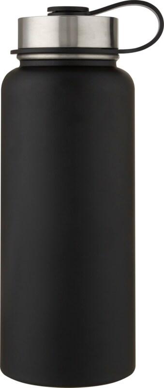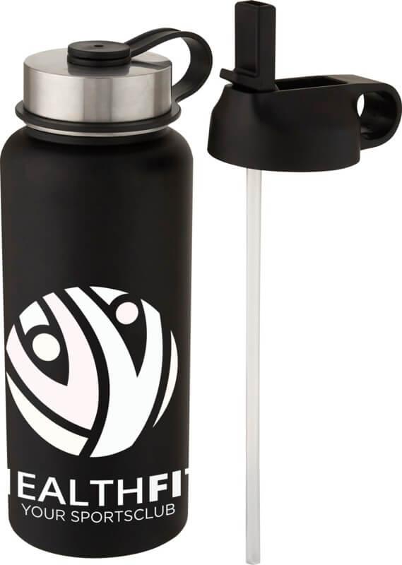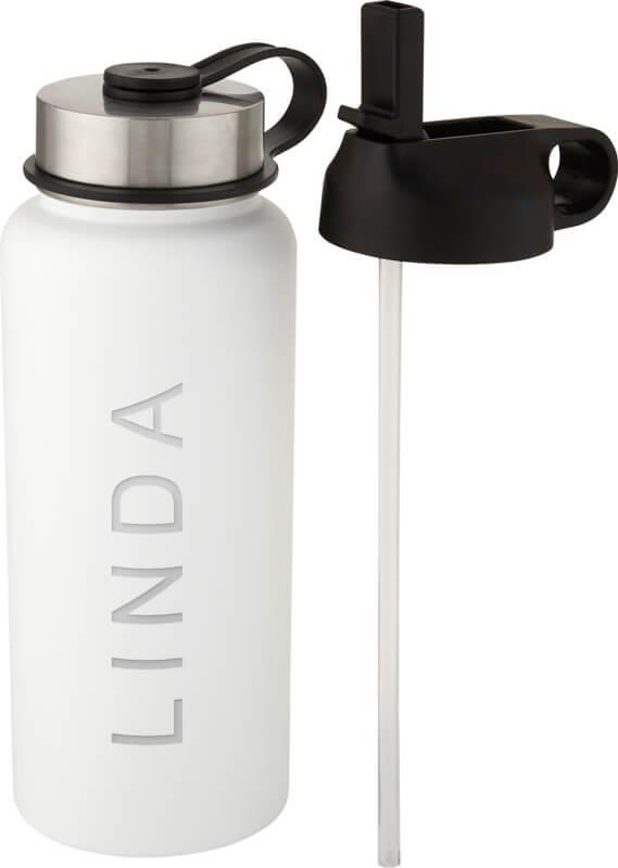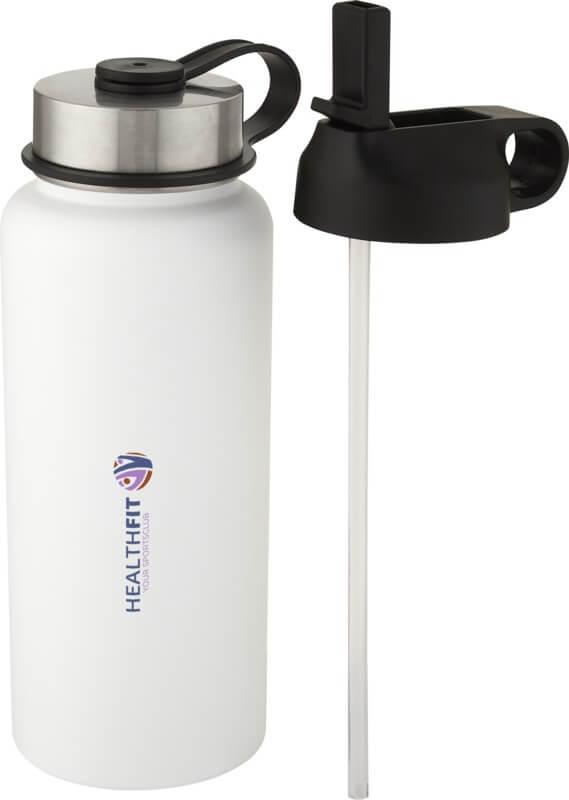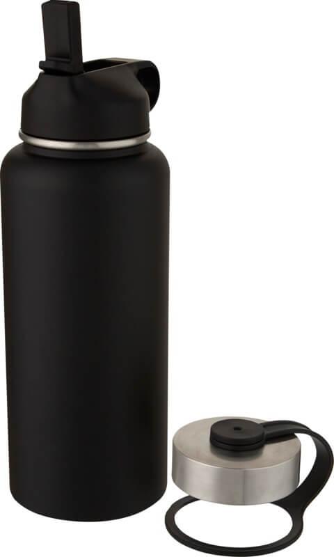Garrafa desportiva de aço inoxidável de parede dupla com isolamento de cobre a vácuo com 2 tampas: uma tampa com canudo para uma bebida fácil e uma tampa de rosca à prova de fugas com alça de manuseamento. A construção isolada em aço inoxidável 18/8 evita a formação de condensação do lado de fora da garrafa e o acabamento em voga do revestimento em pó torna-a mais duradoura. Boca de abertura larga para fácil enchimento, despejo e limpeza. Sem BPA, testado e aprovado segundo a Legislação Alemã de Segurança Alimentar (LFGB). Testado e aprovado relativamente ao teor de ftalatos de acordo com os regulamentos REACH. Perfeito para cubos de gelo. A capacidade do volume é de 1 litro. Recomenda-se a lavagem à mão. Apresentada numa caixa de presente de cartão reciclado.