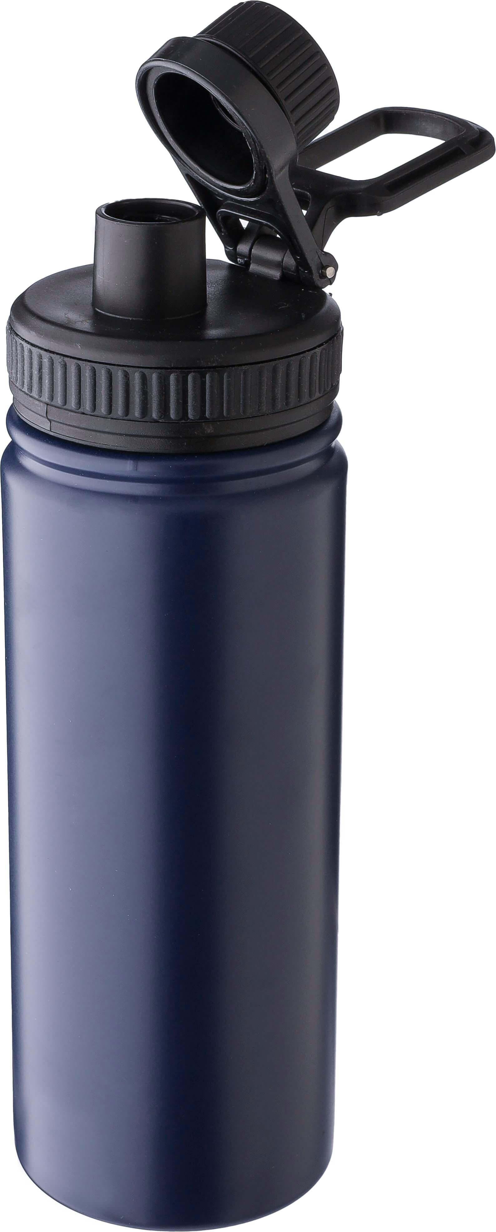 Garrafa em aço inoxidável de parede dupla (500 ml) com tampa PP, bico de rosca PP e pega de transporte. O interior é feito de aço inoxidável 304 e o exterior é de aço inoxidável 201. Apresentada individualmente numa caixa de cartão castanha.
