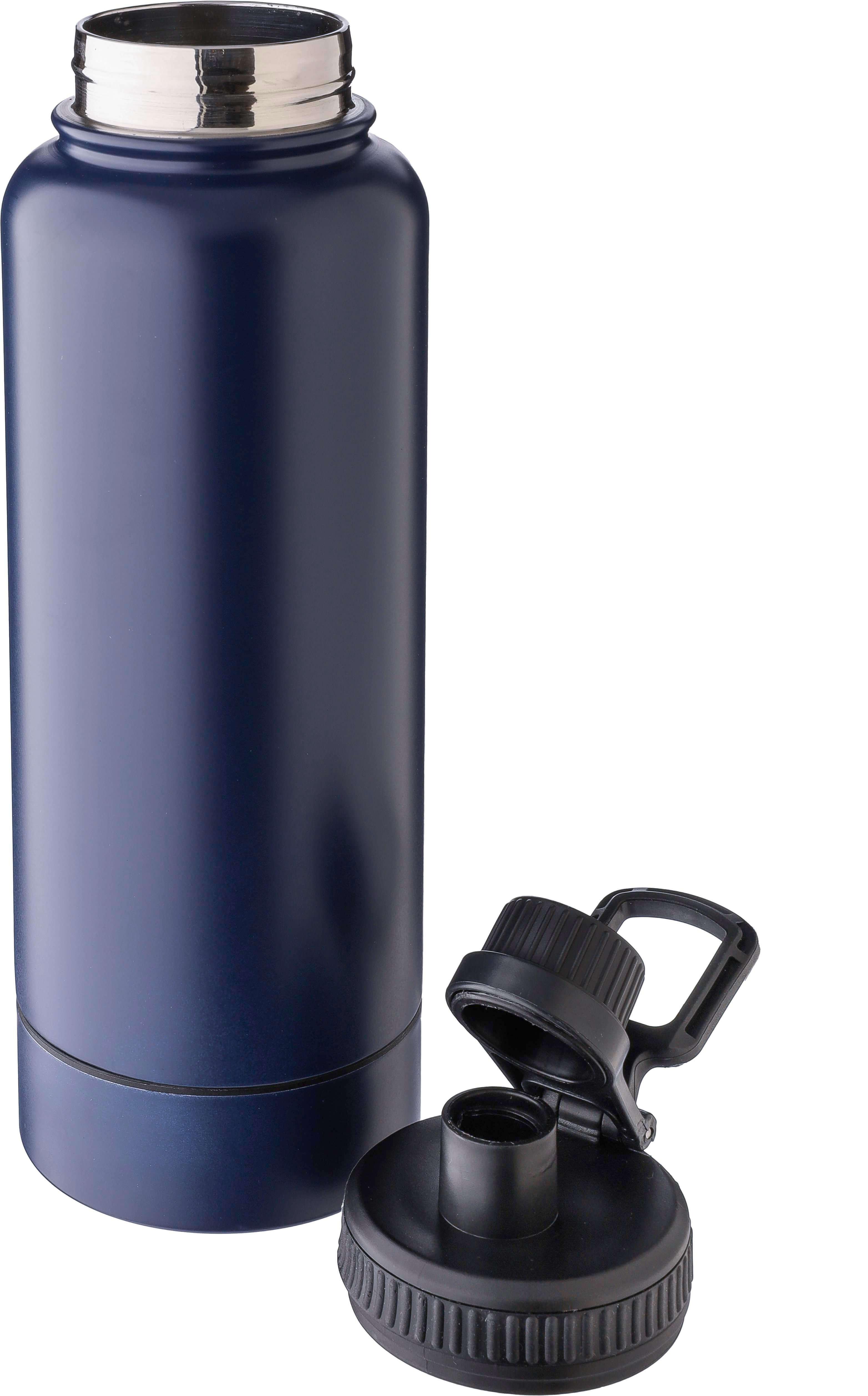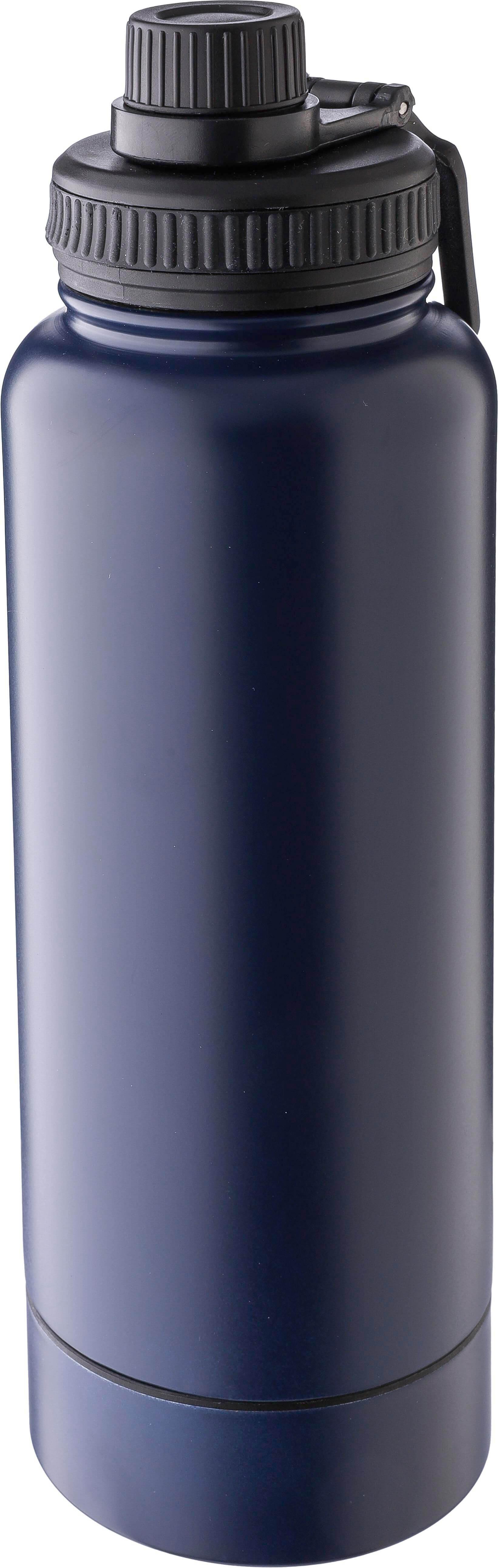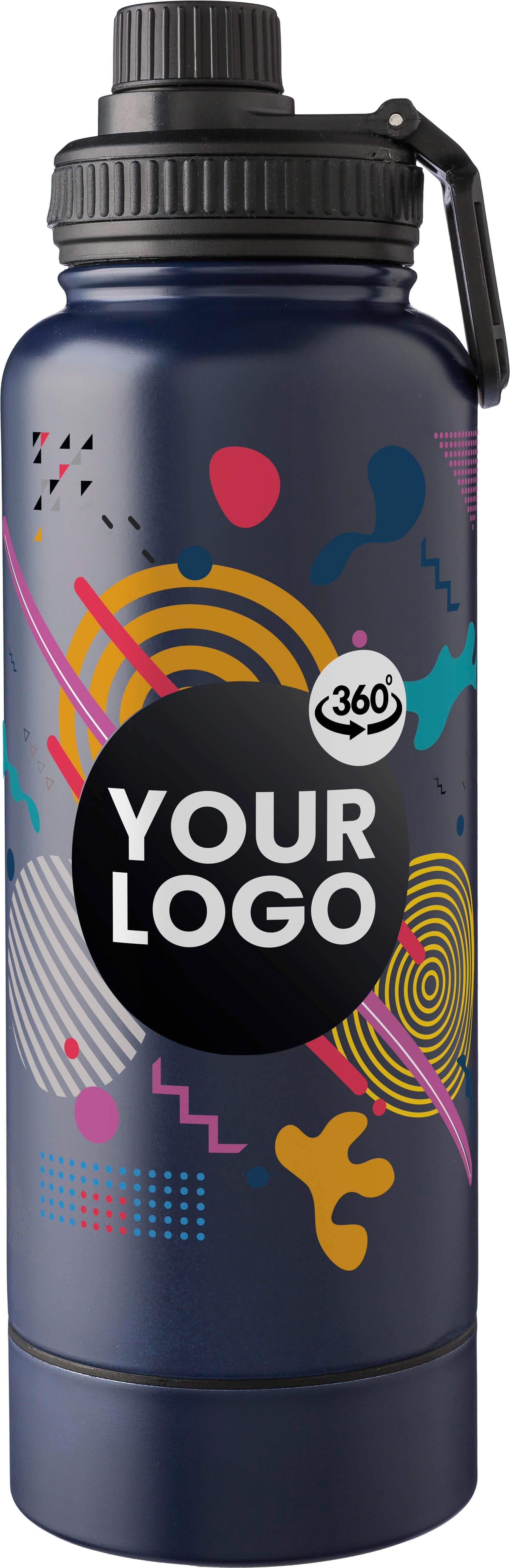 Garrafa em aço inoxidável com parede dupla (1000 ml). Possui uma tampa em PP com um dispensador de rosca e uma alça de transporte. O fundo inclui um pequeno compartimento de rosca para armazenagem. O interior é feito de aço inoxidável 304 e o exterior é de aço inoxidável 201. Apresentada individualmente numa caixa de cartão castanha.