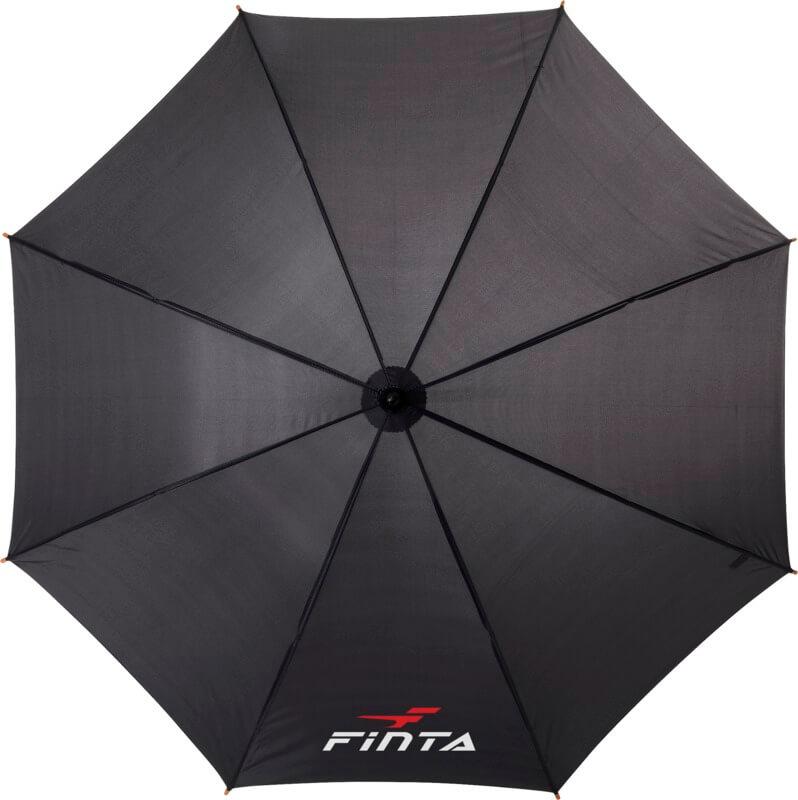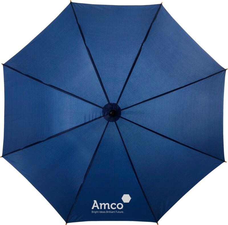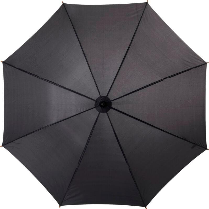 Guarda-chuva de 23″ com pega de madeira, haste de madeira e varetas de metal.