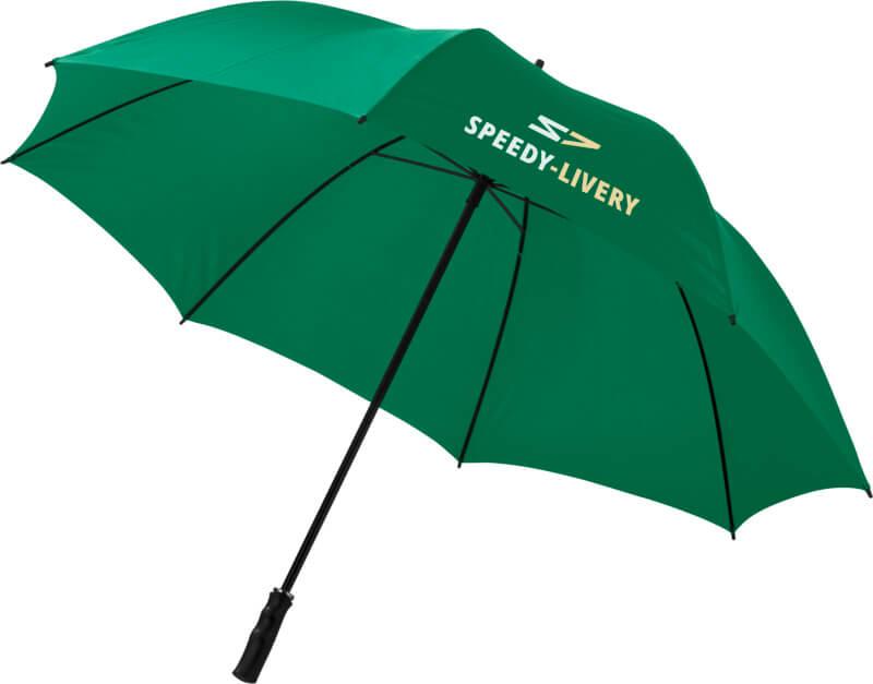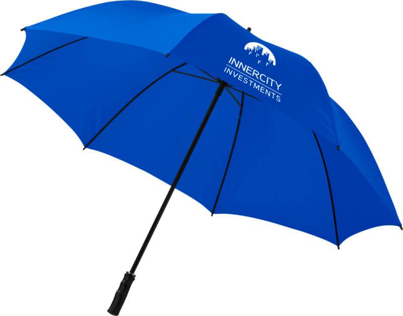 Os passeios secos à chuva são possíveis através do grande guarda-chuva Zeke de 30″. O guarda-chuva Zeke tem espaço suficiente para manter 2 pessoas secas e é fácil de abrir utilizando um sistema manual. Além disso, o guarda-chuva é composto por uma haste e varetas metálicas, e um cabo de plástico leve. O guarda-chuva Zeke tem várias opções para colocar um logótipo ou outras mensagens da empresa e está disponível em diferentes cores.