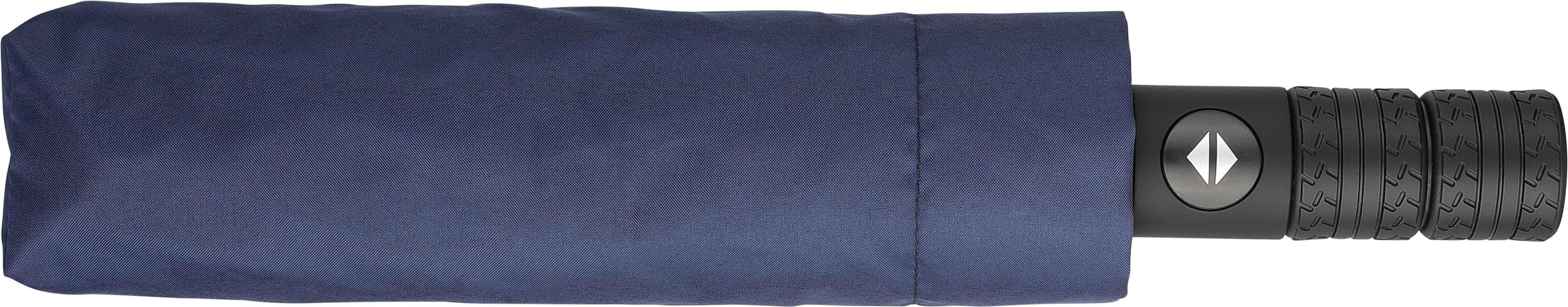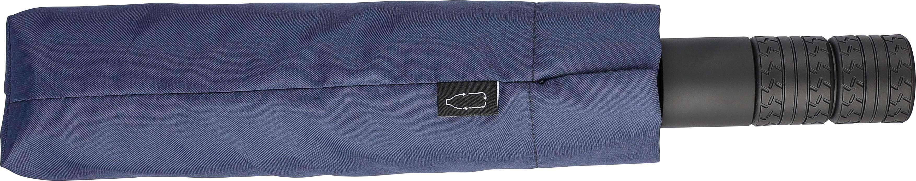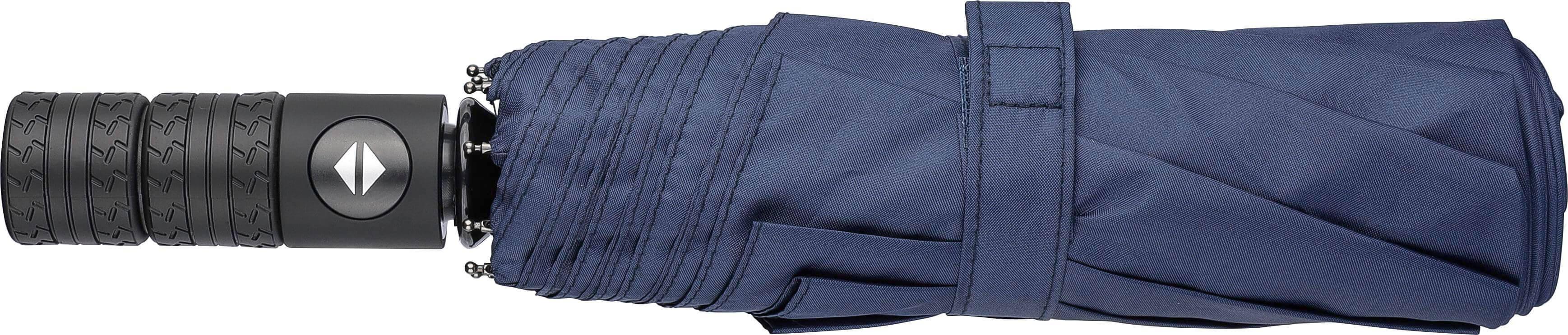 Guarda-chuva dobrável com 8 painéis em rPET 190T, com botão de pressão para abertura e fecho automáticos. Pega em borracha.