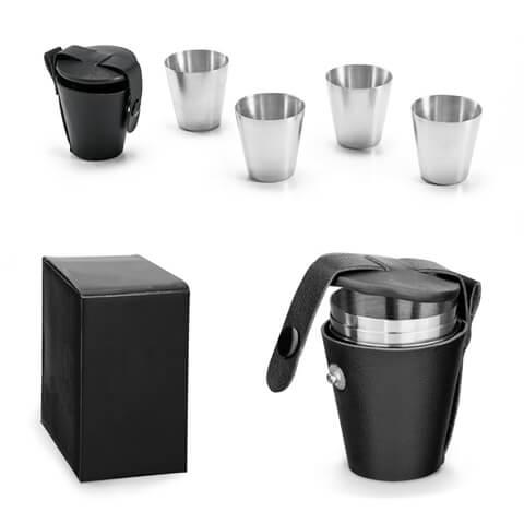 Conjunto de 4 copos em aço inoxidável com bolsa para transporte em PU e com capacidade até 25 mL. Fornecido em caixa de oferta.