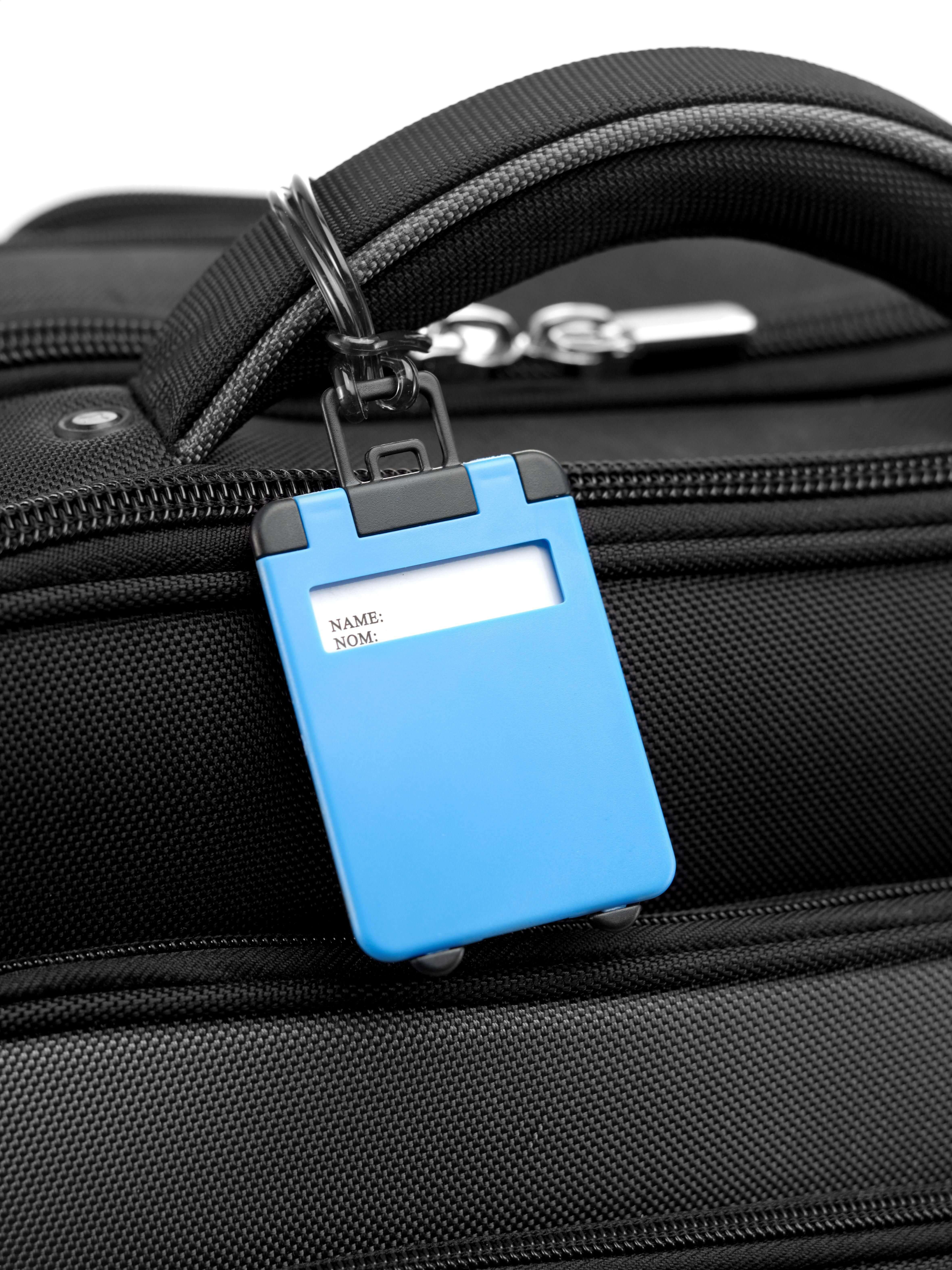 Identificador de bagagem em plástico, com forma de trolley.