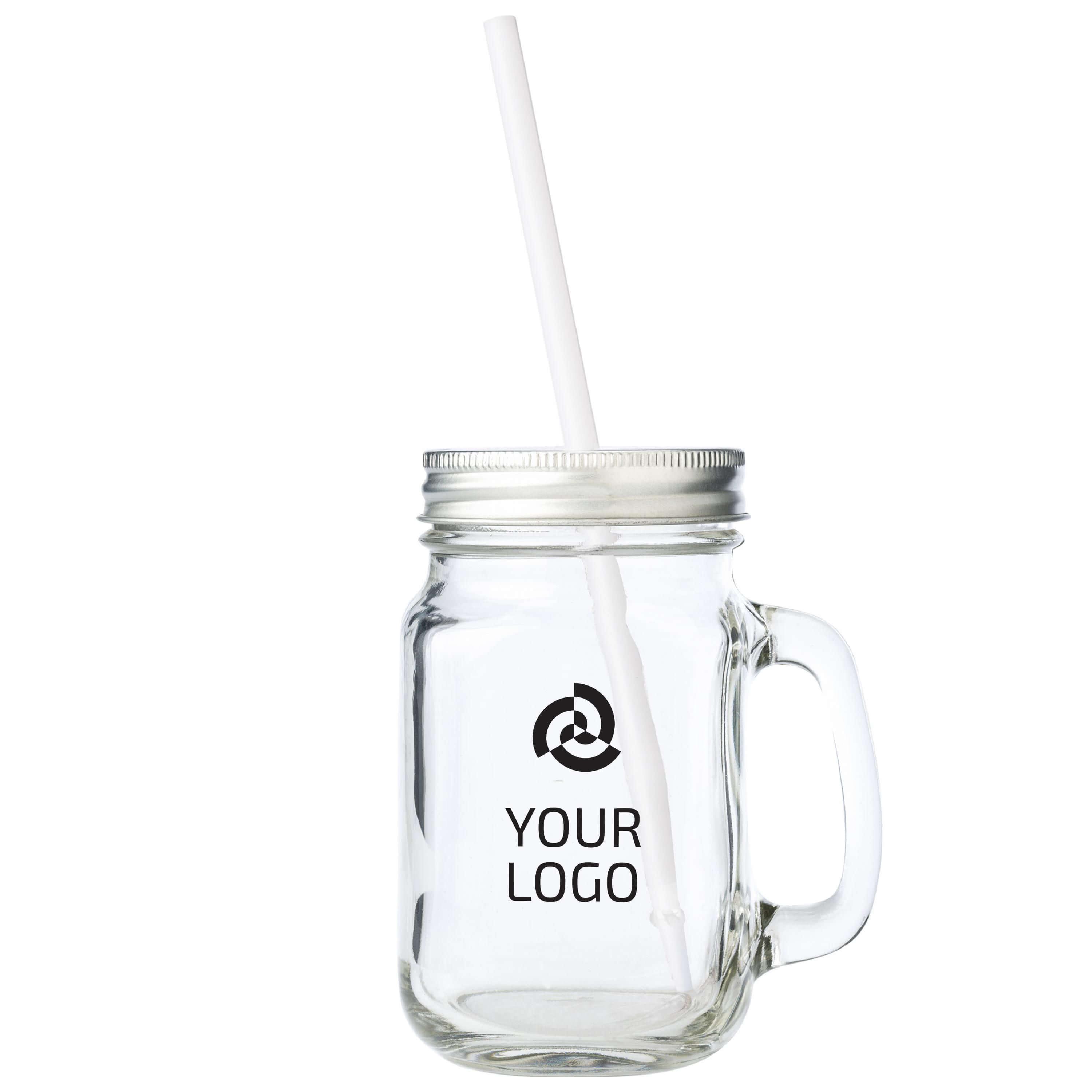 Jarra em vidro para beber (480 ml) com alça e tampa em cor prateado. Inclui um buraco no meio para colocar a palhinha de plástico. Venda em múltiplo de 32 unidades.