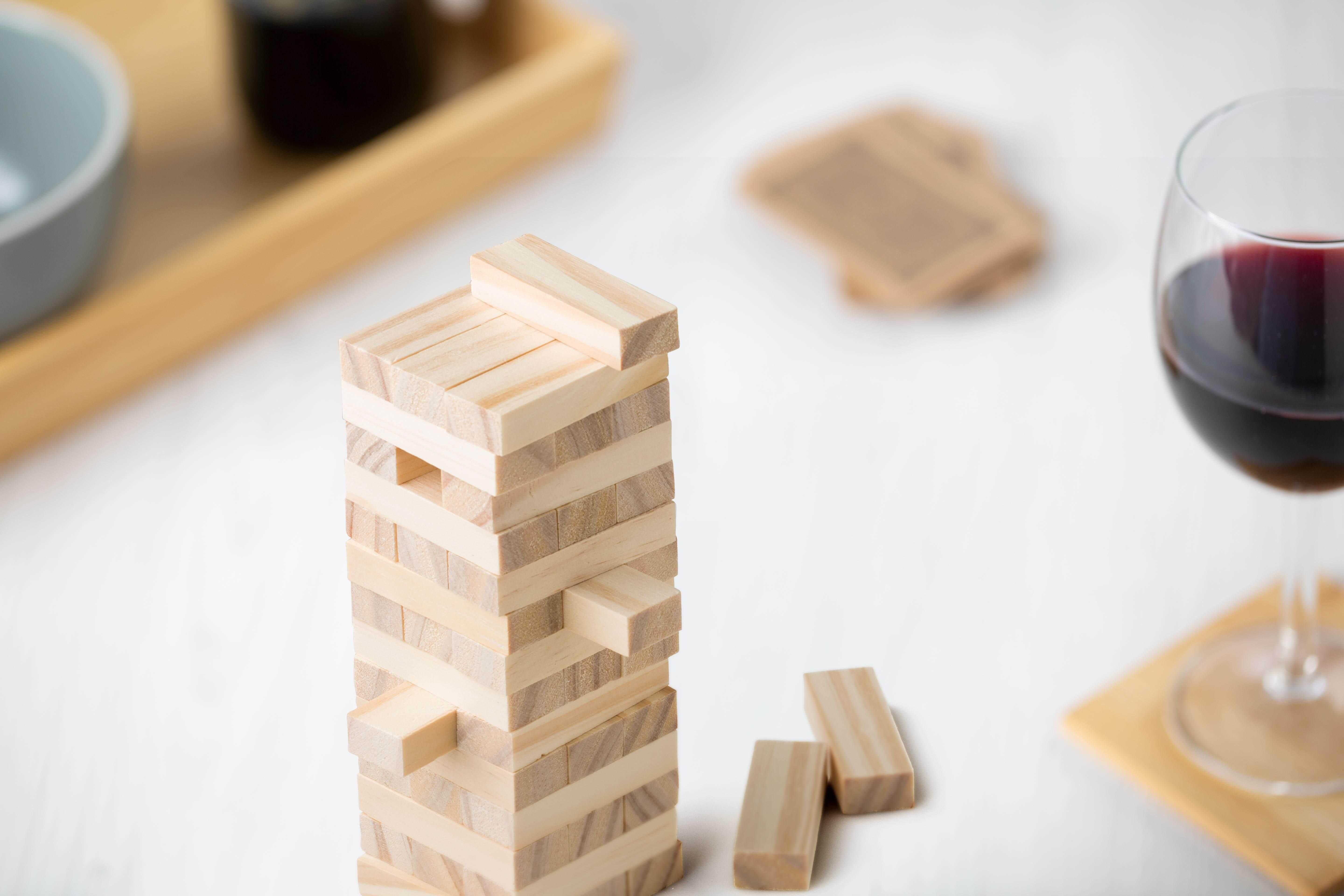Jogo de habilidades em torres de blocos de madeira de pinho. Os blocos de madeira são certificados FSC® 100%. Embalado em bolsa de algodão.