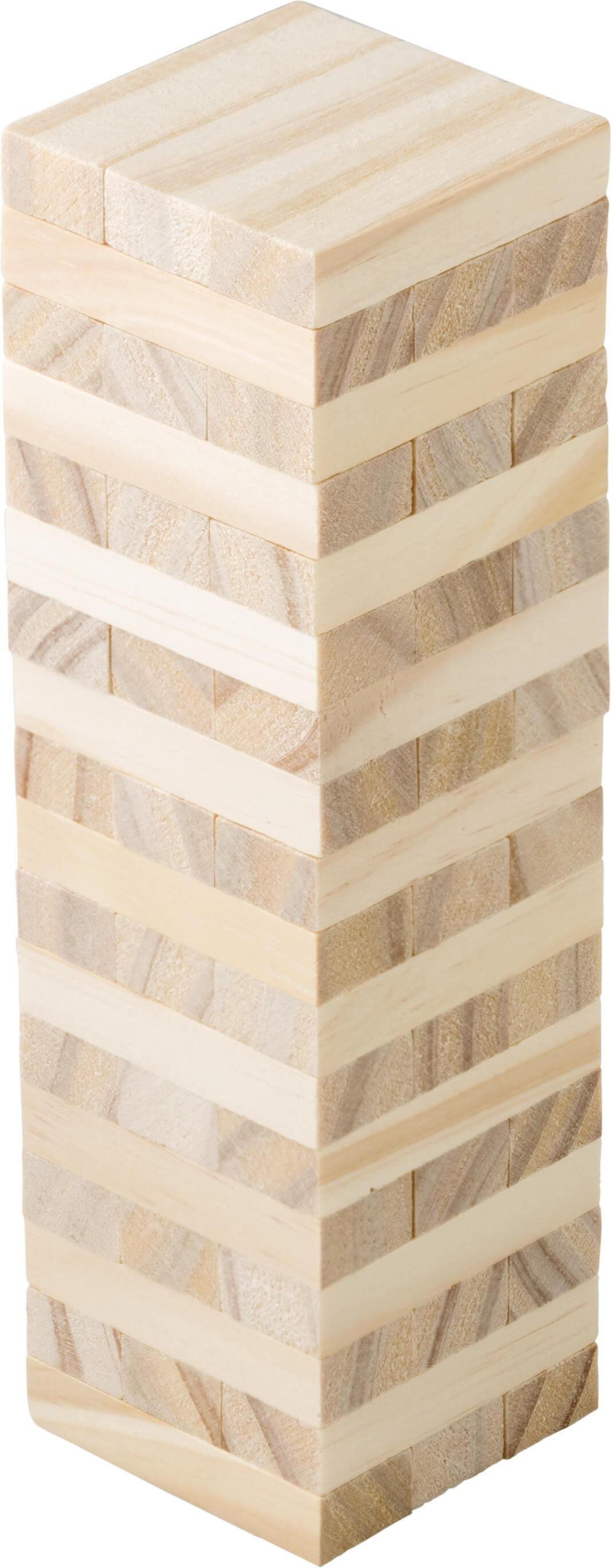 Jogo de habilidades em torres de blocos de madeira de pinho . Embalado em bolsa de algodão.