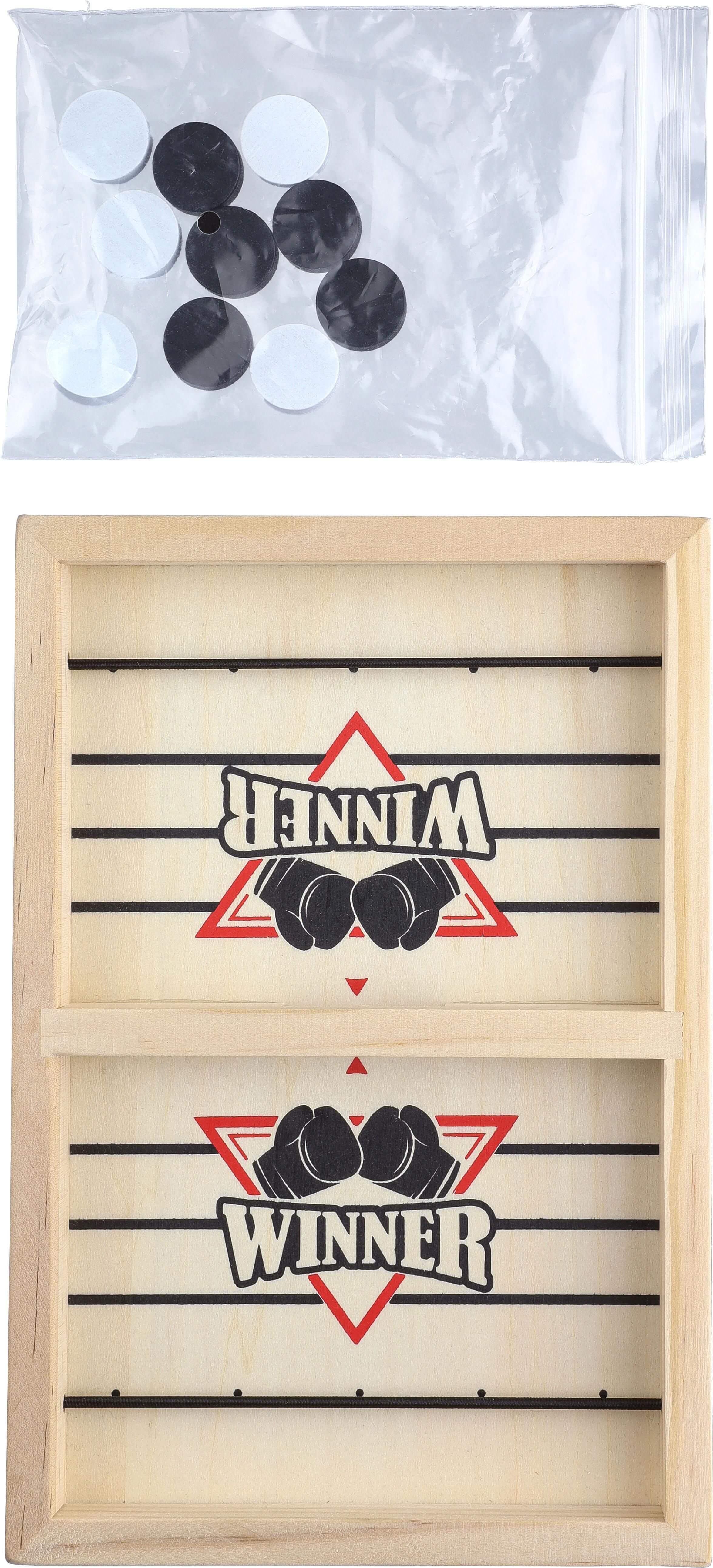 Jogo de lançamento em madeira. Inclui 10 fichas de xadrez (5 brancas e 5 pretas) e um manual para facilitar a montagem e o jogo. Um jogo de habilidade rápido para adultos com um total de 11 peças. Embalado individualmente numa caixa de cartão castanha com uma frente ilustrada.