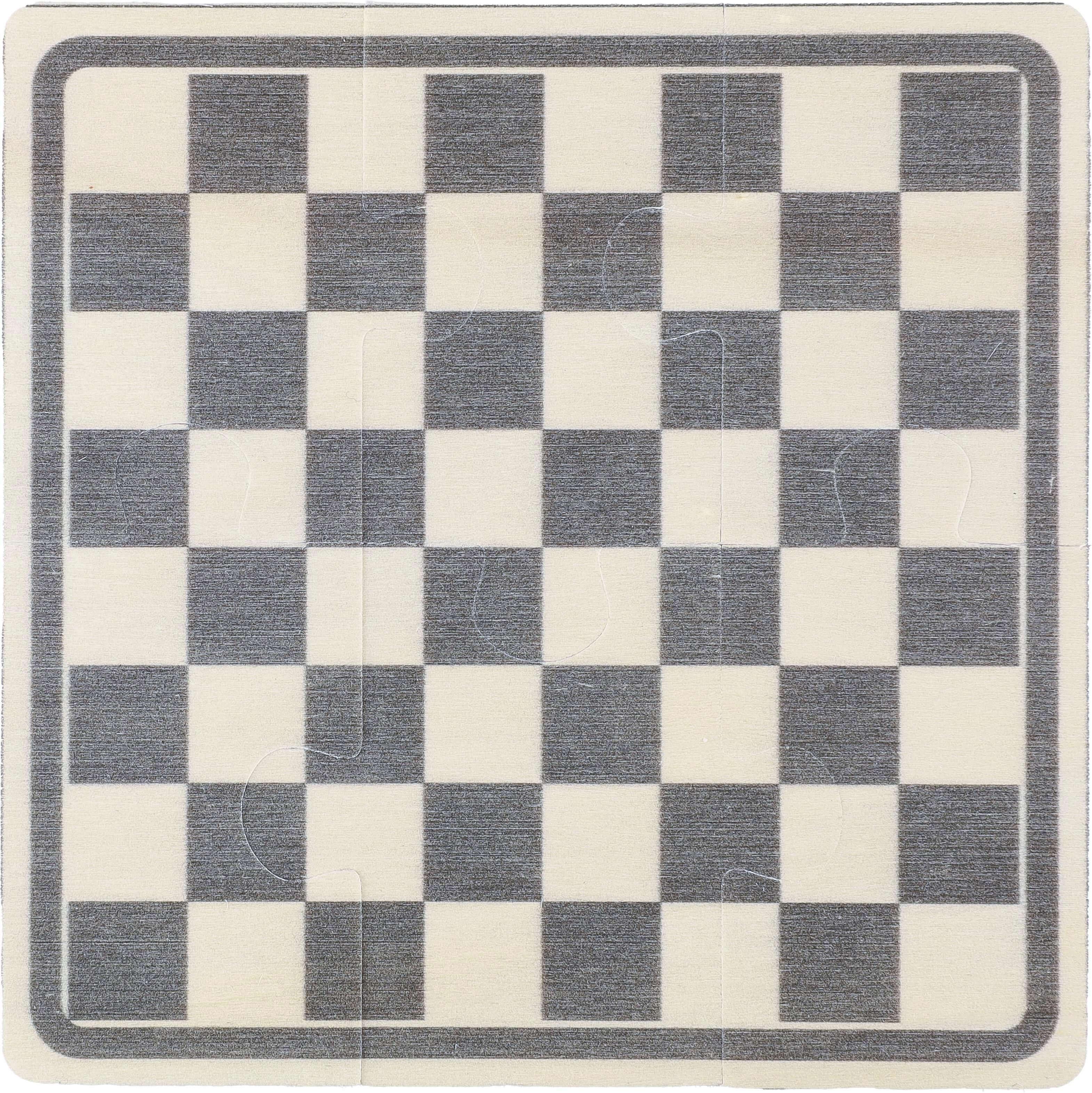 Jogo de xadrez e damas em madeira numa bolsa de algodão com cordão. Inclui um puzzle impresso de 6 peças (campo de jogo preto/natural) para montar os tabuleiros de jogo e 16 fichas de madeira impressas com desenhos de jogadores de xadrez. As fichas de madeira estão disponíveis em cores naturais e pretas. Inclui instruções de jogo. Etiqueta no interior da bolsa. O campo de jogo é feito de madeira de poliéster e as fichas são feitas de madeira de pinho.