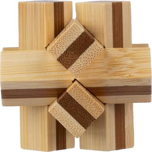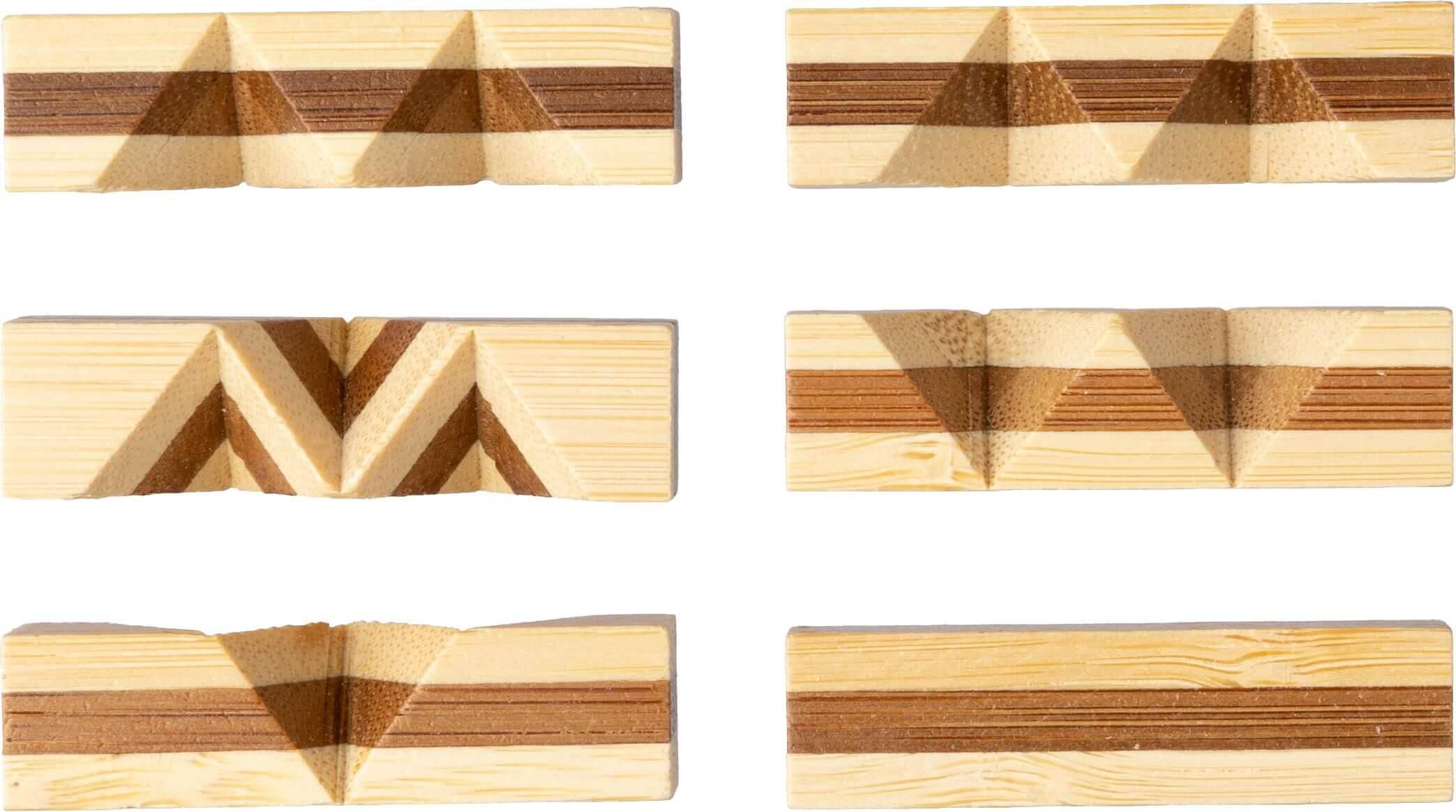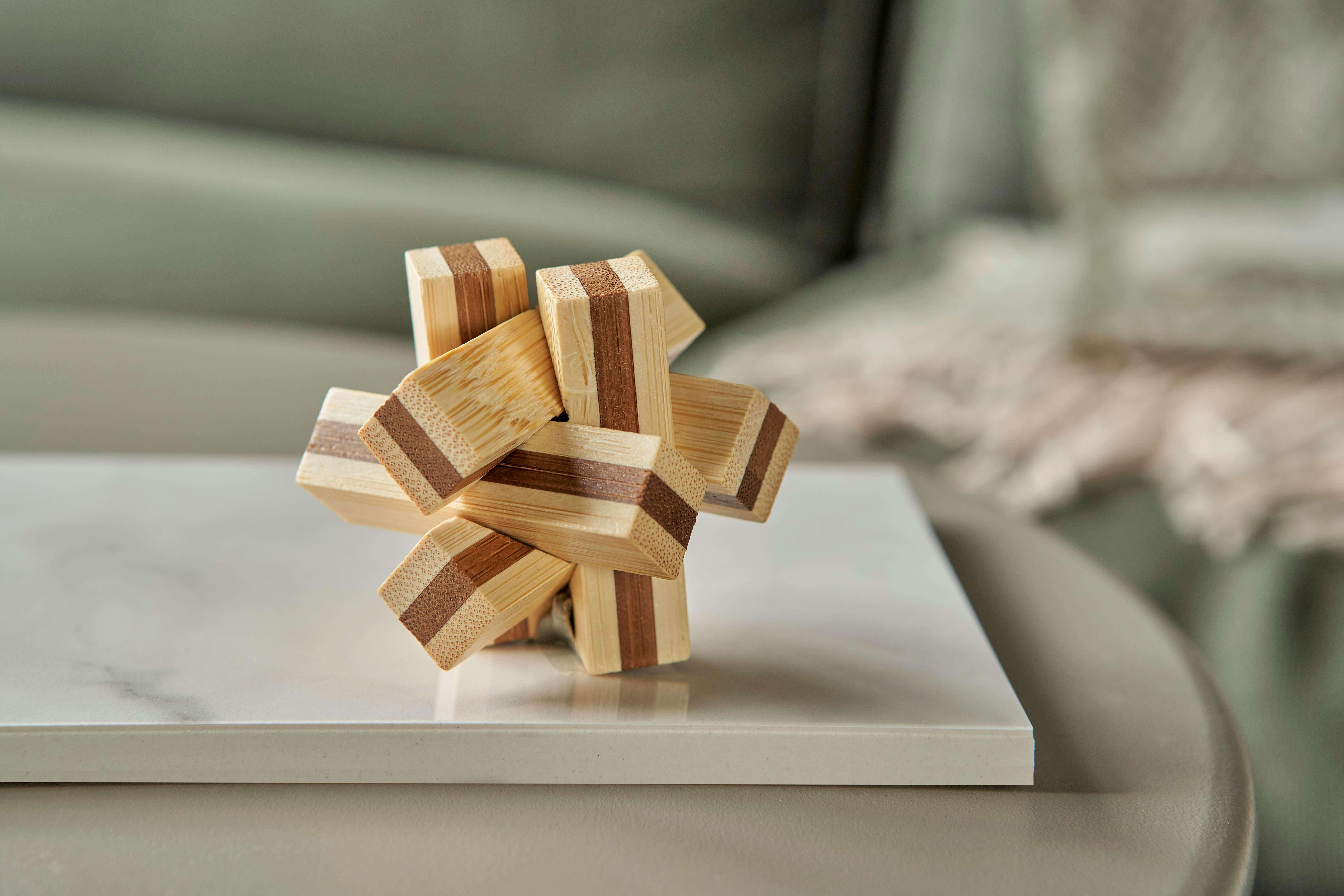 Jogo de paciência de madeira. Embalado individualmente em uma caixa de papelão marrom.