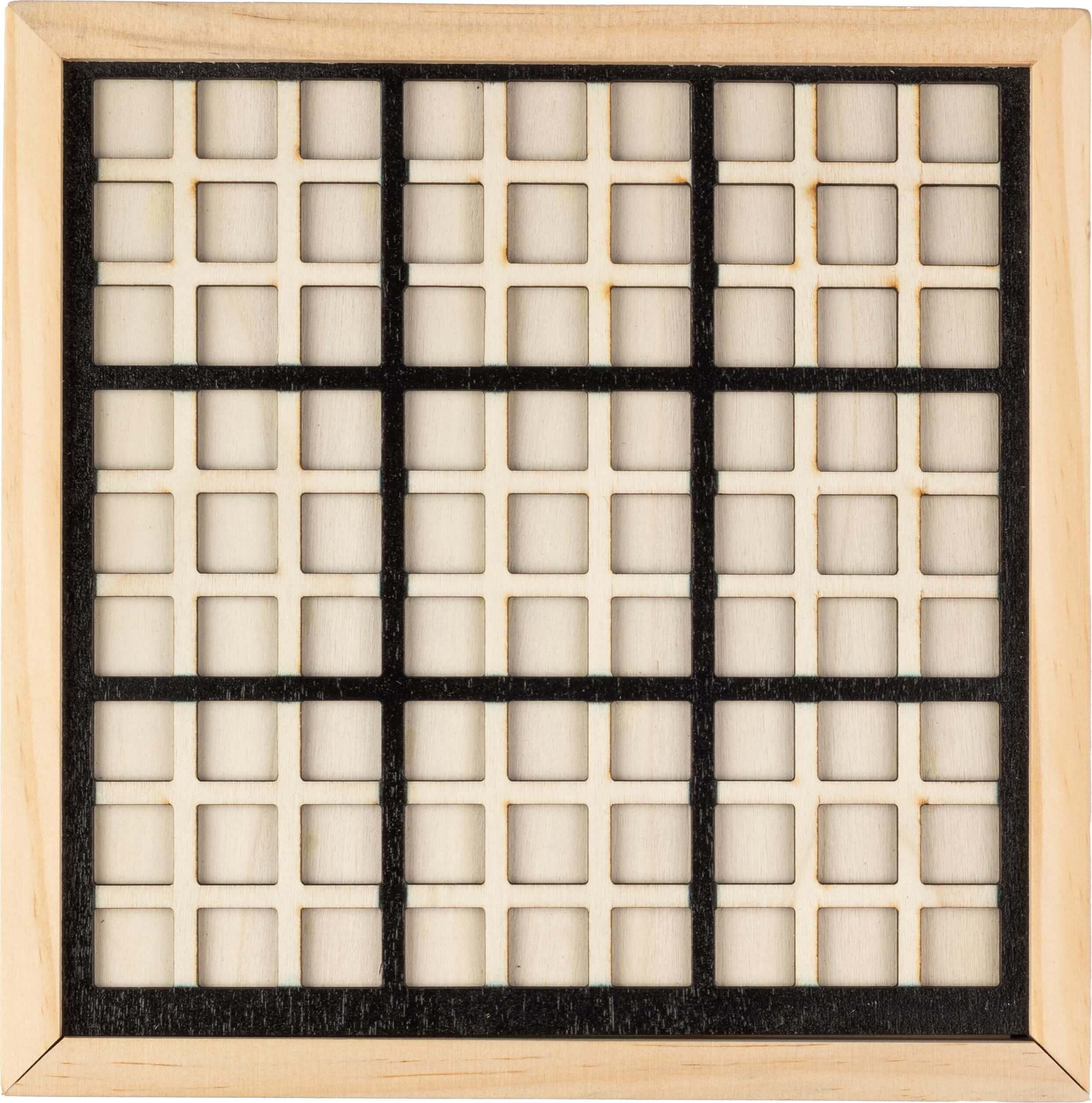 Jogo de Sudoku de madeira. Inclui 99 fragmentos de madeira numeradas e um manual de instruções e soluções de reprodução. Embalado individualmente em uma caixa de papelão marrom.