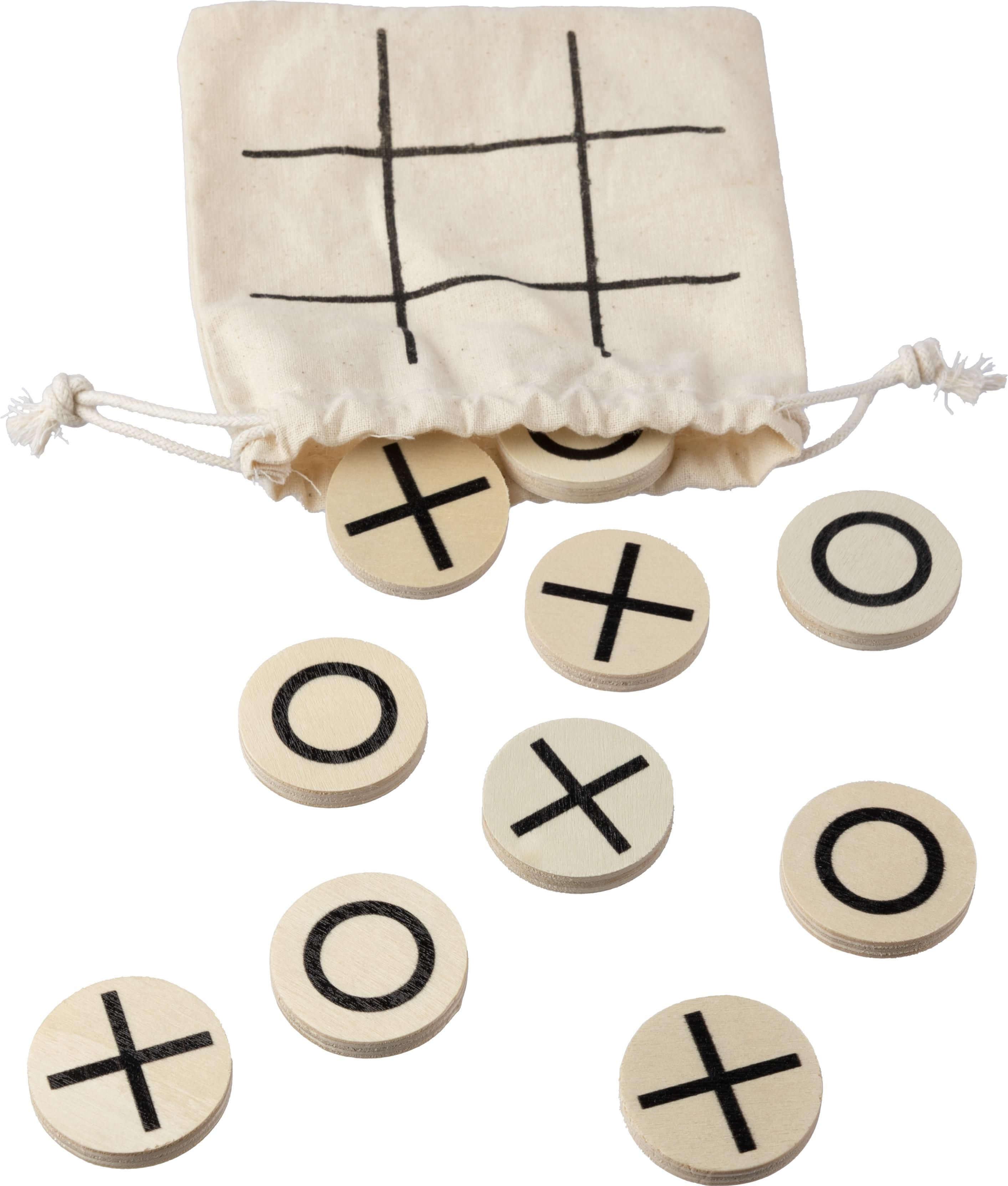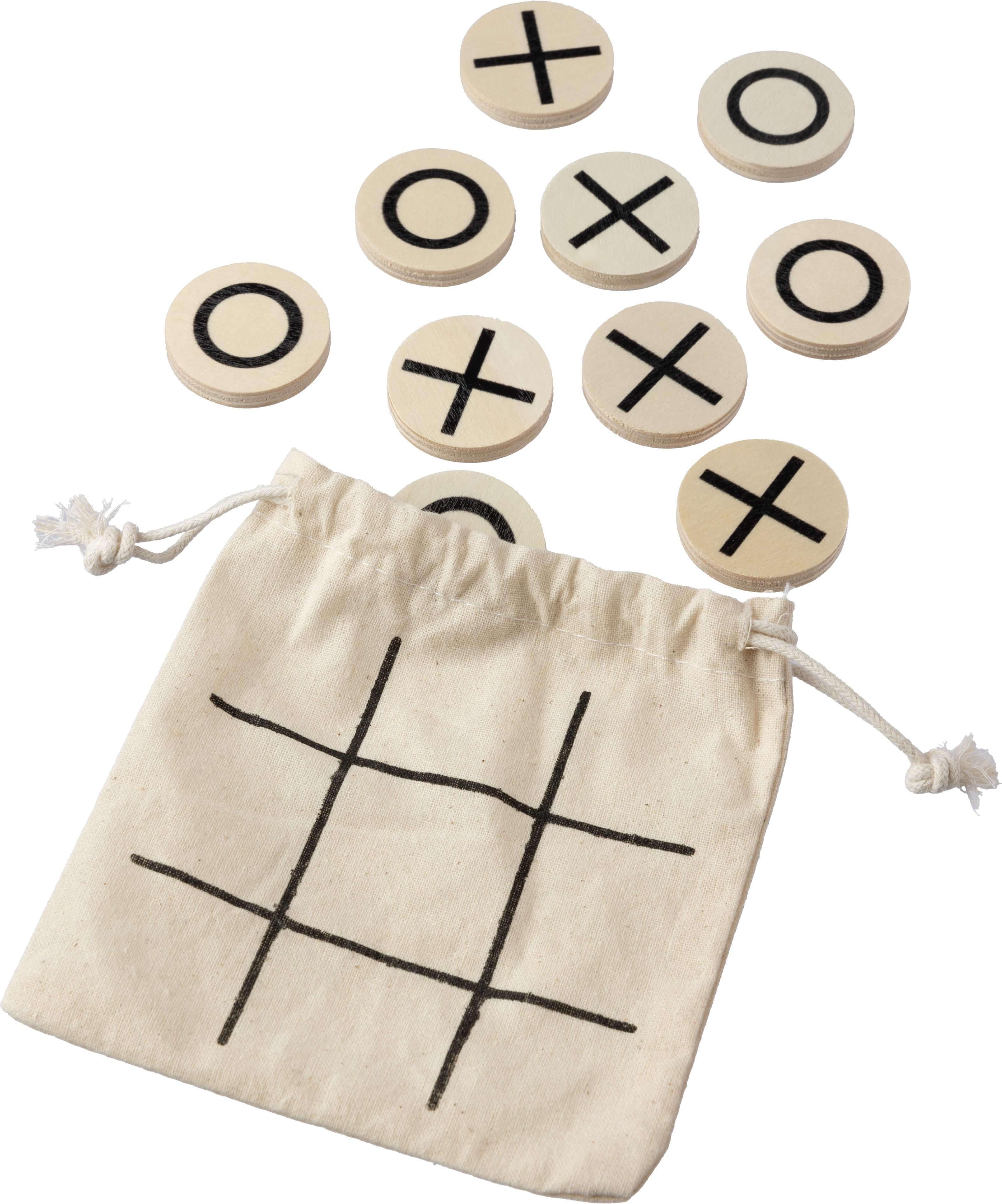 Jogo tique-taque de madeira natural, incluindo pequenas fichas de madeira embalados em uma bolsa de algodão.
