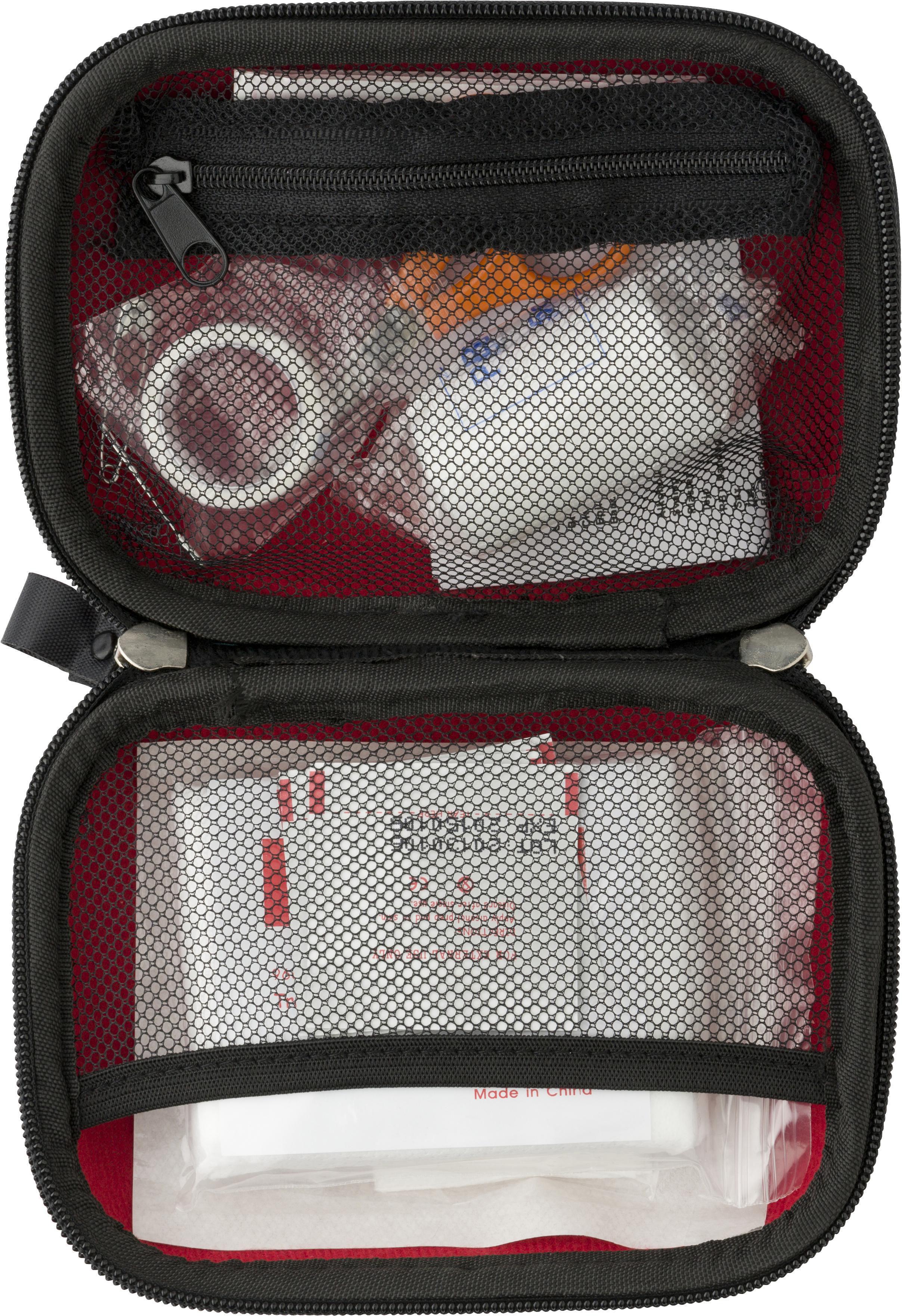 Estojo de primeros socorros em cor vermelho. Contém uma gaze, um pacote de curativos, uma bandagem triangular, dois alfinetes de segurança, tesoura, 4 toalhetes com álcool, 5 tiras e 1 rolo de fita. Este produto só pode ser vendido e entregue dentro da União Europeia.