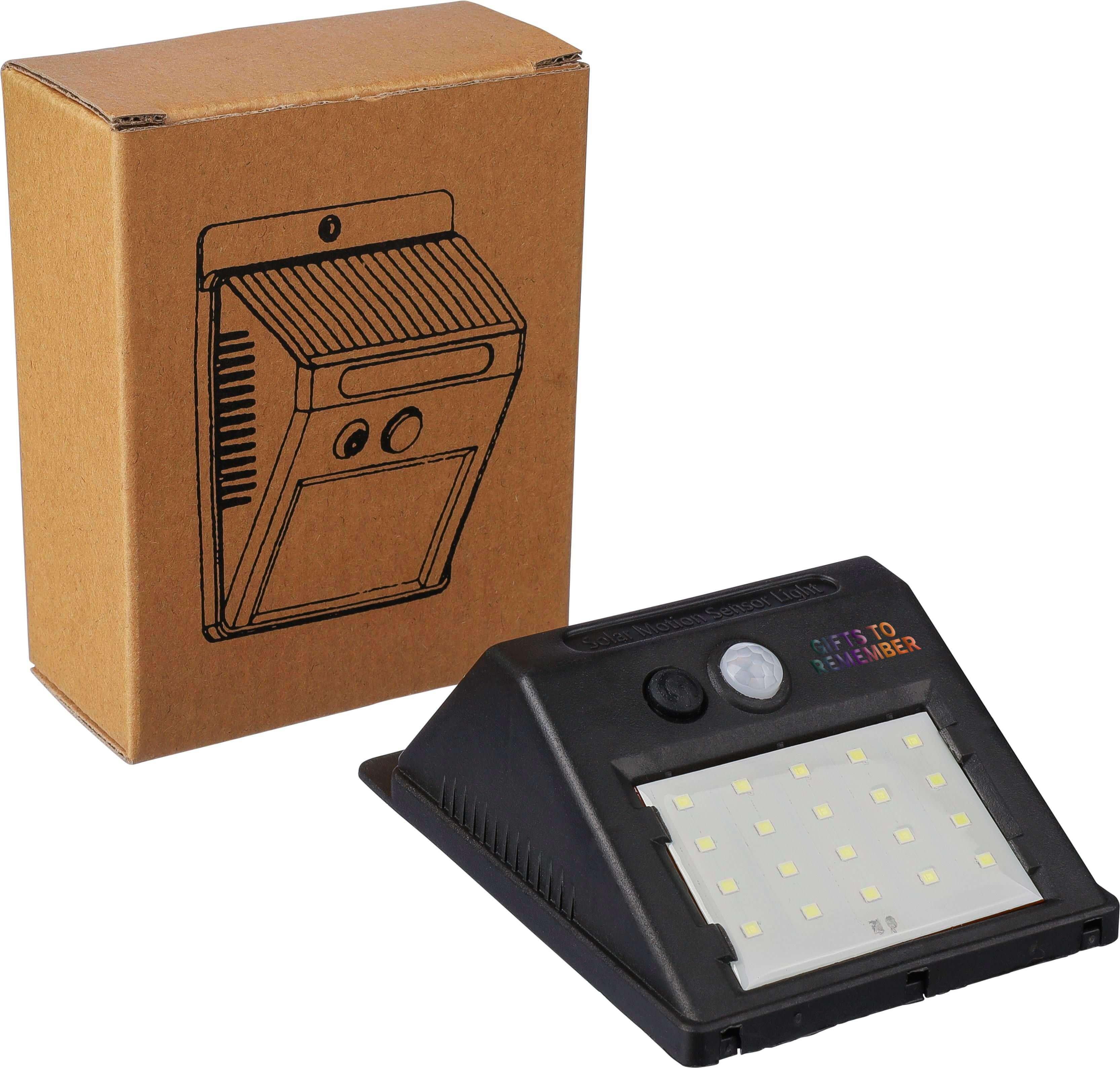 Lâmpada solar PP com LED 20-COB. Dispõe de um sensor noturno (CDS) e de um sensor de movimento (PIR). Inclui uma bateria com capacidade de 800 mAh, um cabo de carregamento, classificação IP44 e funções de luz constante ou intermitente. Embalado individualmente numa caixa de cartão castanha.