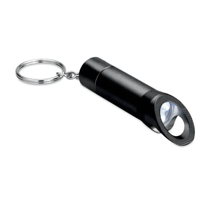 Lanterna LED com porta chaves, em metal com descapsulador. Pilha incluída.