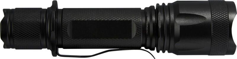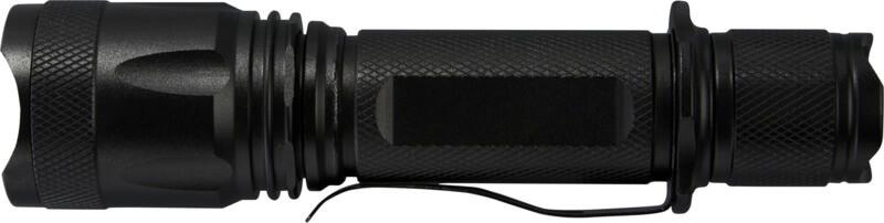 Nunca fique sem bateria com esta lanterna de alumínio tática recarregável de alta potência. A sólida caixa em liga de alumínio preta oferece um aspeto tático, com uma resistência ao impacto de 1 metro. A lanterna possui um clipe para cinto para facilitar o transporte e é à prova de salpicos com uma classificação IPX4. O LED de 5 W gera 300 lúmenes por até 3 horas, e tem uma distância de feixe de 200 metros com 5 modos de luz diferentes: alto, médio, baixo, estroboscópico e SOS. A alta potência vem de uma bateria de lítio incorporada com uma capacidade de 2000 mAh. A lanterna tem um tamanho de 14,5 x 3,4 cm e pesa apenas 170 gramas. Vem com um manual de instruções e é embalada numa caixa de presente de cartão reciclado com um tamanho de 17,5 x 6 x 4 cm. É recomendada a gravação laser no corpo de alumínio.