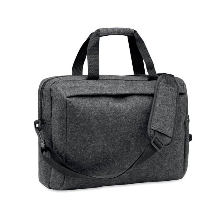Mala para computador portátil de 15″” em feltro RPET com compartimento interior principal e bolso frontal com fecho de correr. Inclui uma alça de ombro amovível e ajustável. Fixação para trolley.