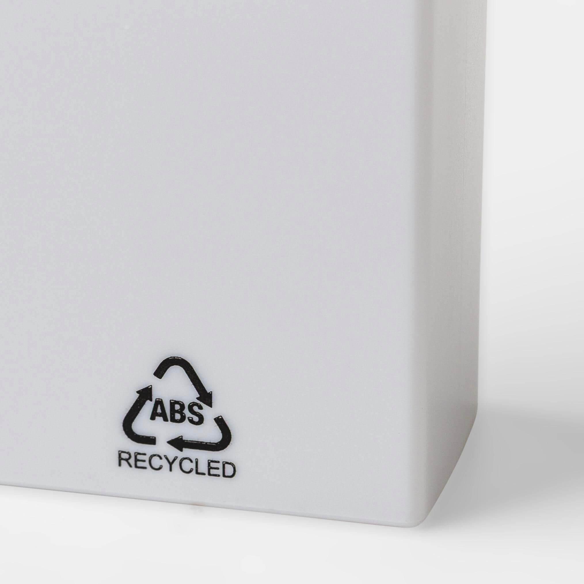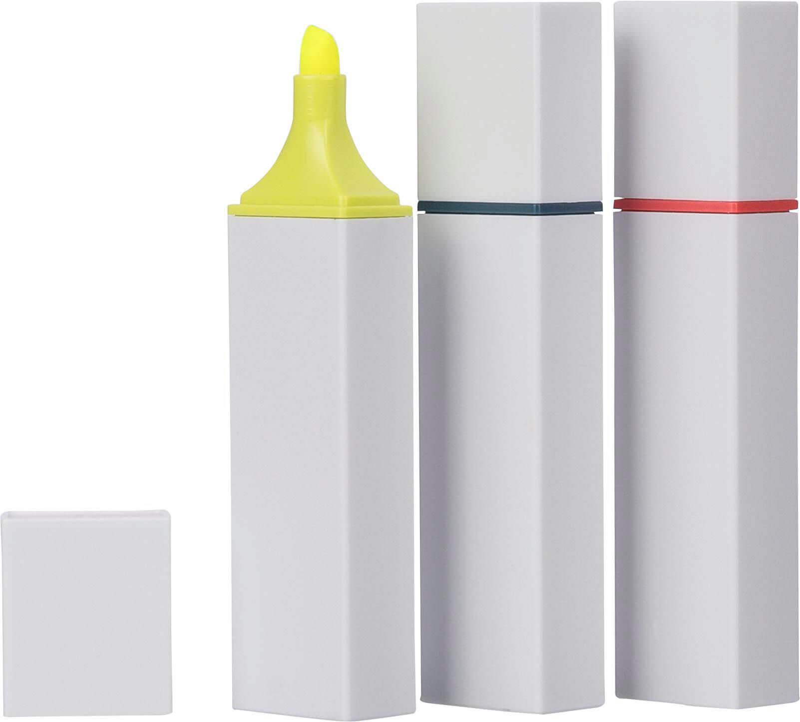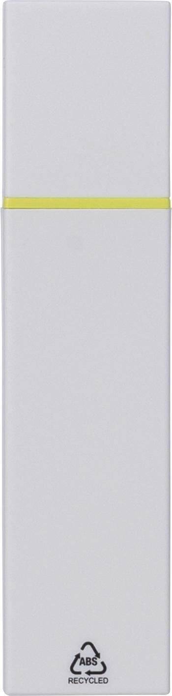 Marcador de texto em ABS reciclado com corpo branco e detalhes coloridos. Possui fecho de clique e inclui uma garantia de 2 anos contra o ressecamento. Marcado com o logótipo ABS reciclado.