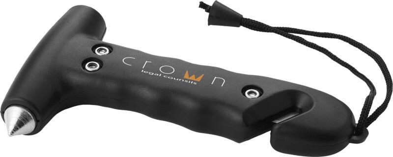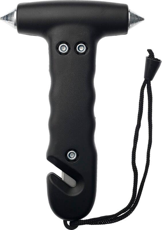 Martelo de emergência com alça de pulso e cortador de cinto embutido na pega. Dois quebra-janelas de aço temperado afiado e um cortador de cinto que podem ser utilizados para escapar em caso de acidente.