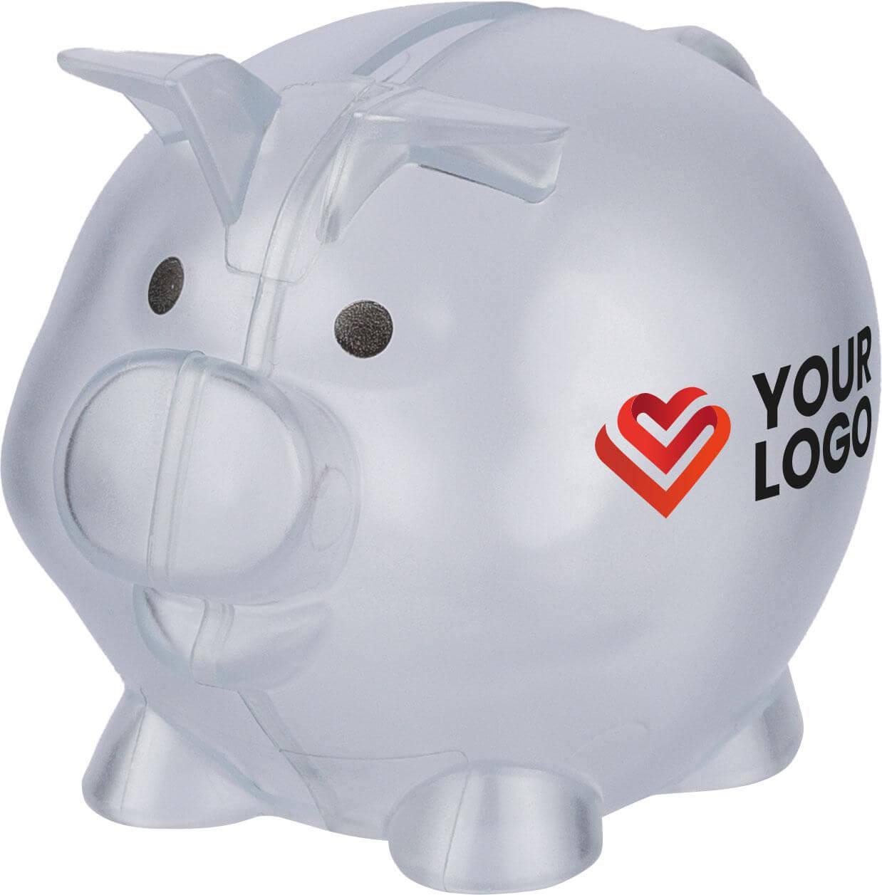 Mealheiro em plástico PS reciclado com formato de porco. Versão transparente com logótipo reciclado na parte de trás.