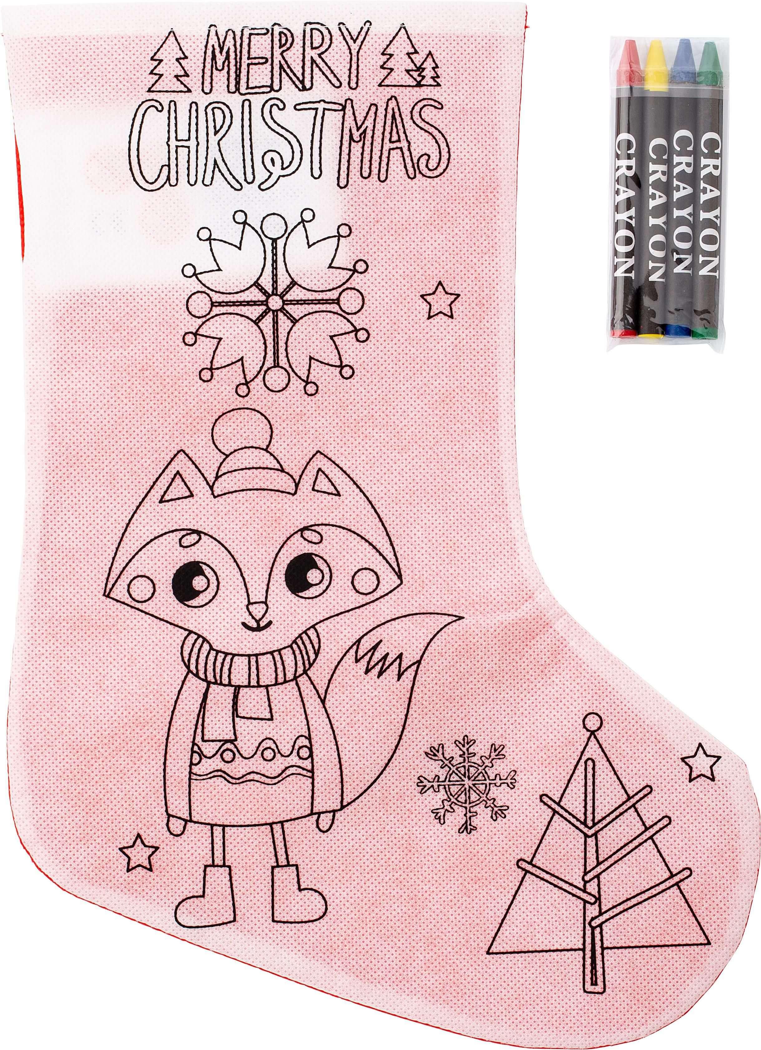 Meias de Natal nonwoven (80gr/m²), com uma face vermelha e impressão do outro lado, adequadas para colorir. Incluindo quatro lápis de cera (verde, vermelho, amarelo, e azul) em polybag.