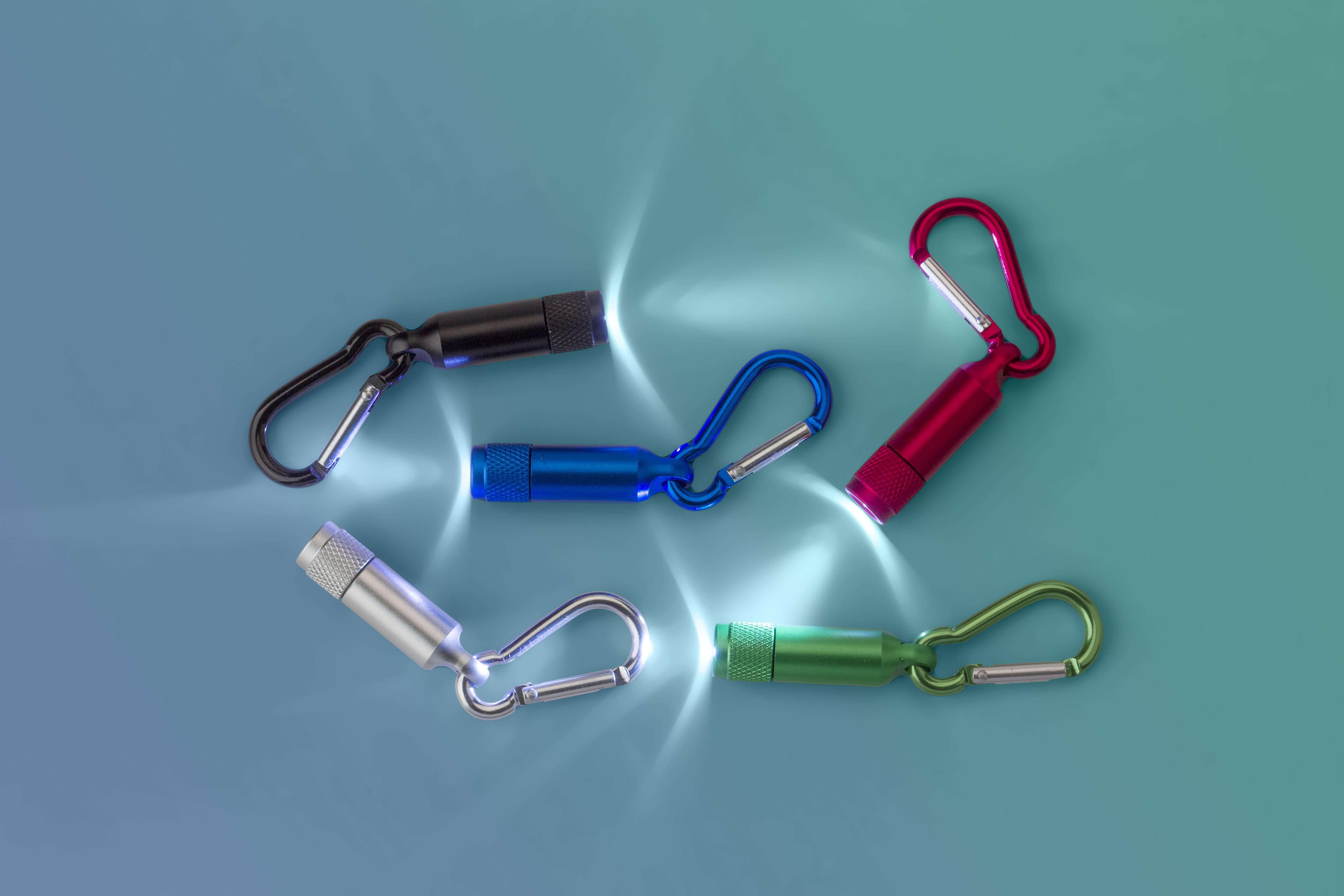Mini lanterna de aluminio com luz LED e mosquetão.