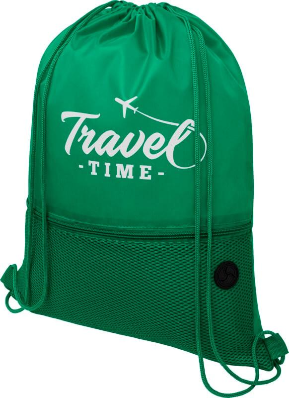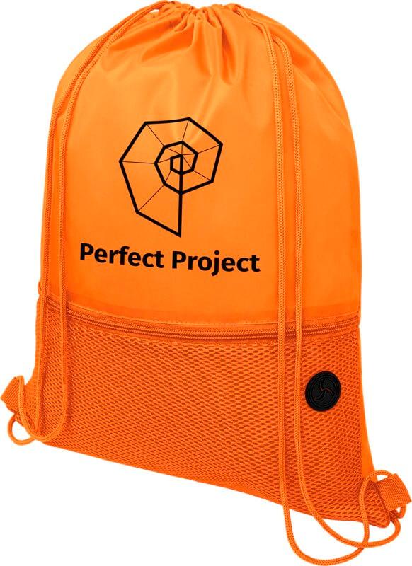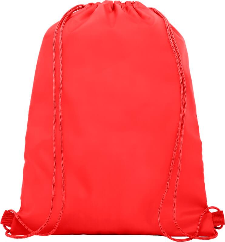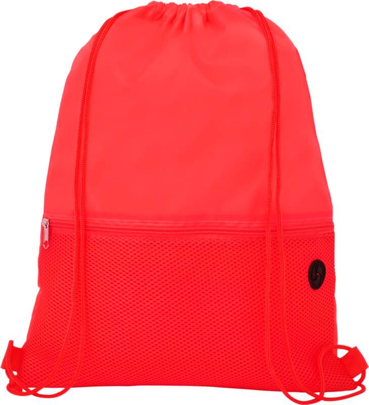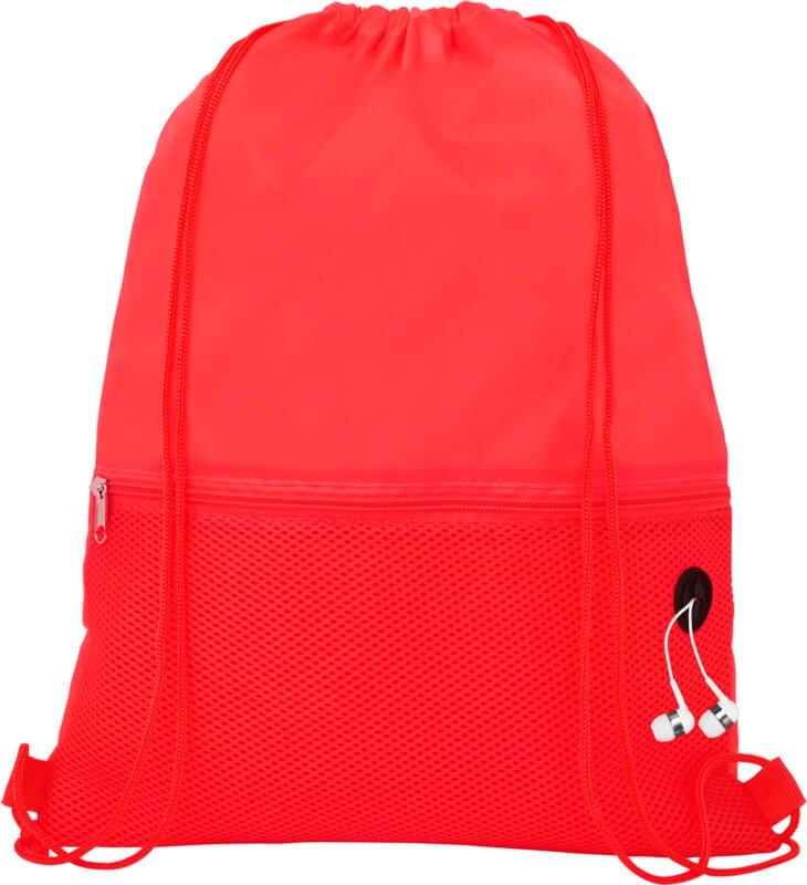 Mochila com cordões com compartimento principal com fecho de cordão em cores a condizer. Possui um bolso frontal em rede com fecho de correr e passagem para auriculares. Resistência até 5 kg de peso.