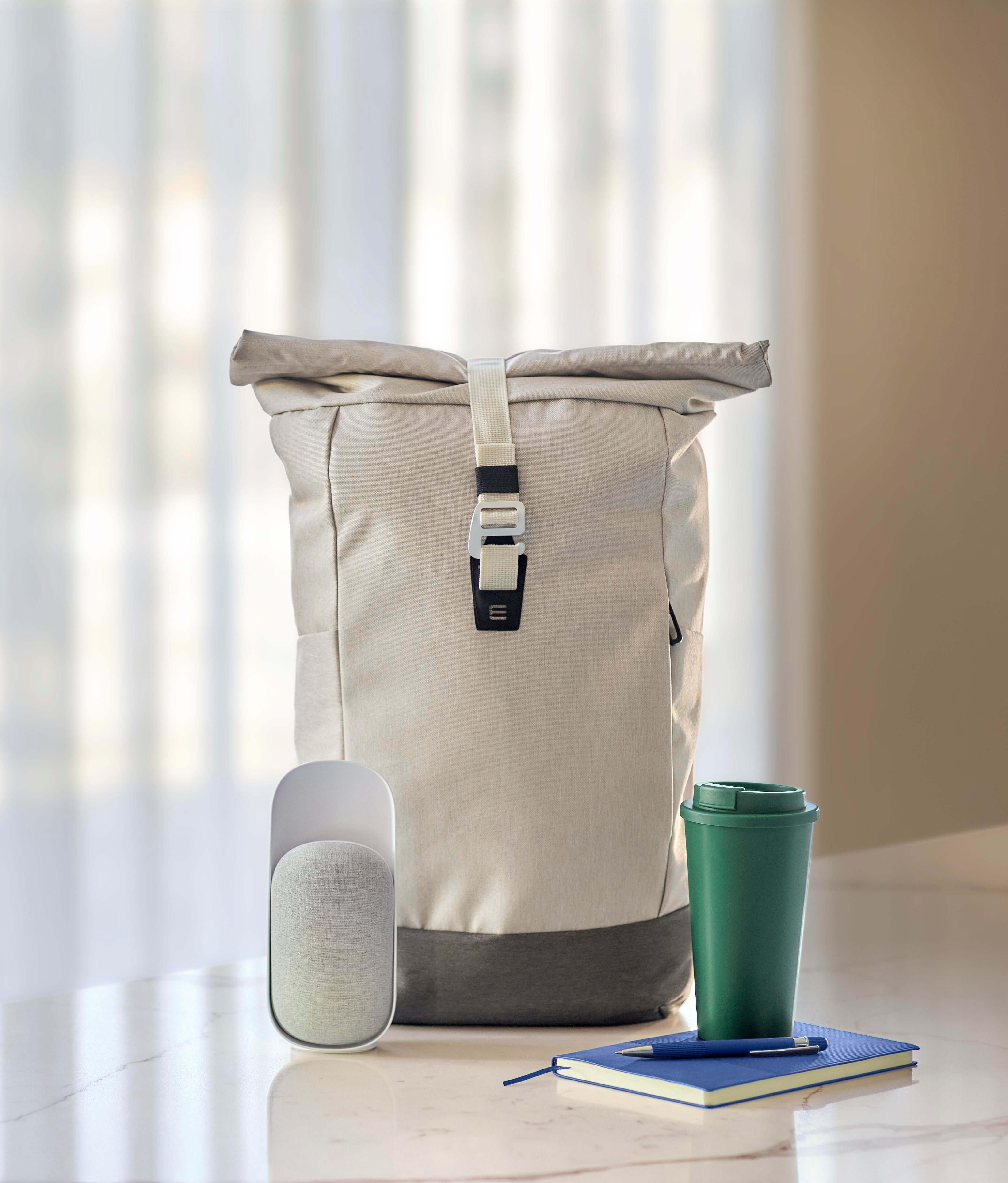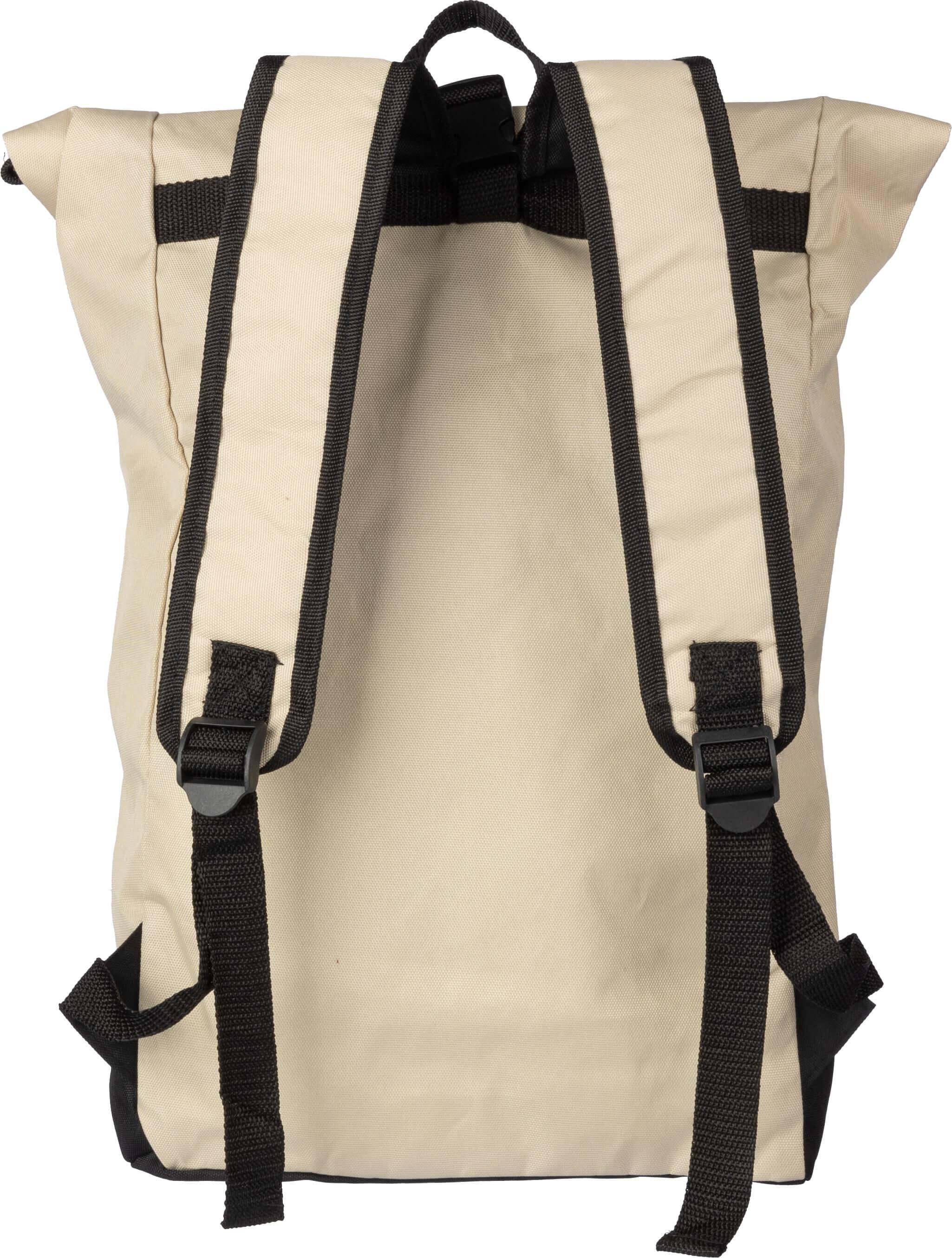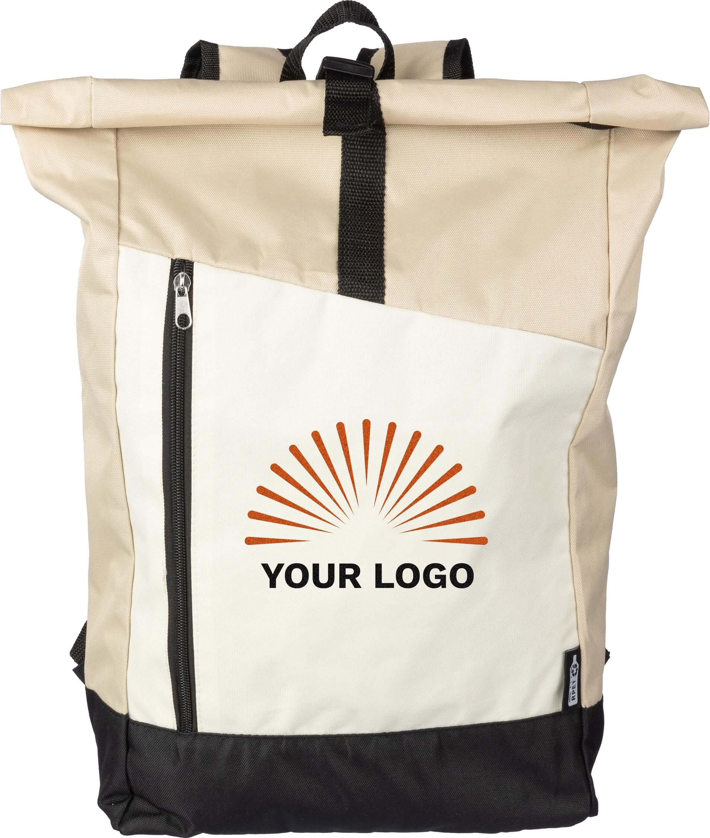 Mochila de enrolar em rPET (600D) com um grande compartimento com fecho de correr na parte superior e um grande compartimento com fecho de correr na parte da frente. A mochila tem alças ajustáveis e um fecho de fivela de plástico para a tampa de enrolar.