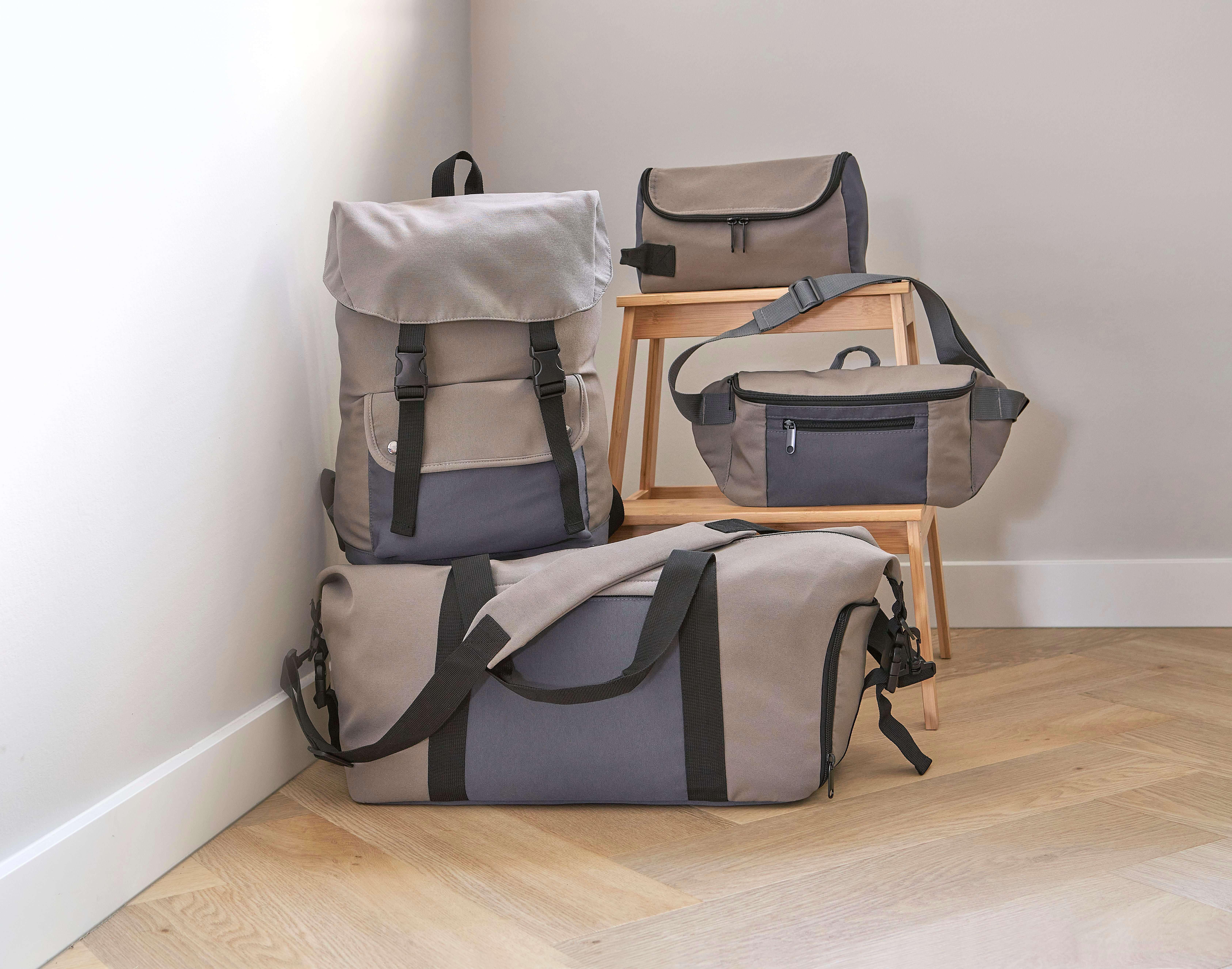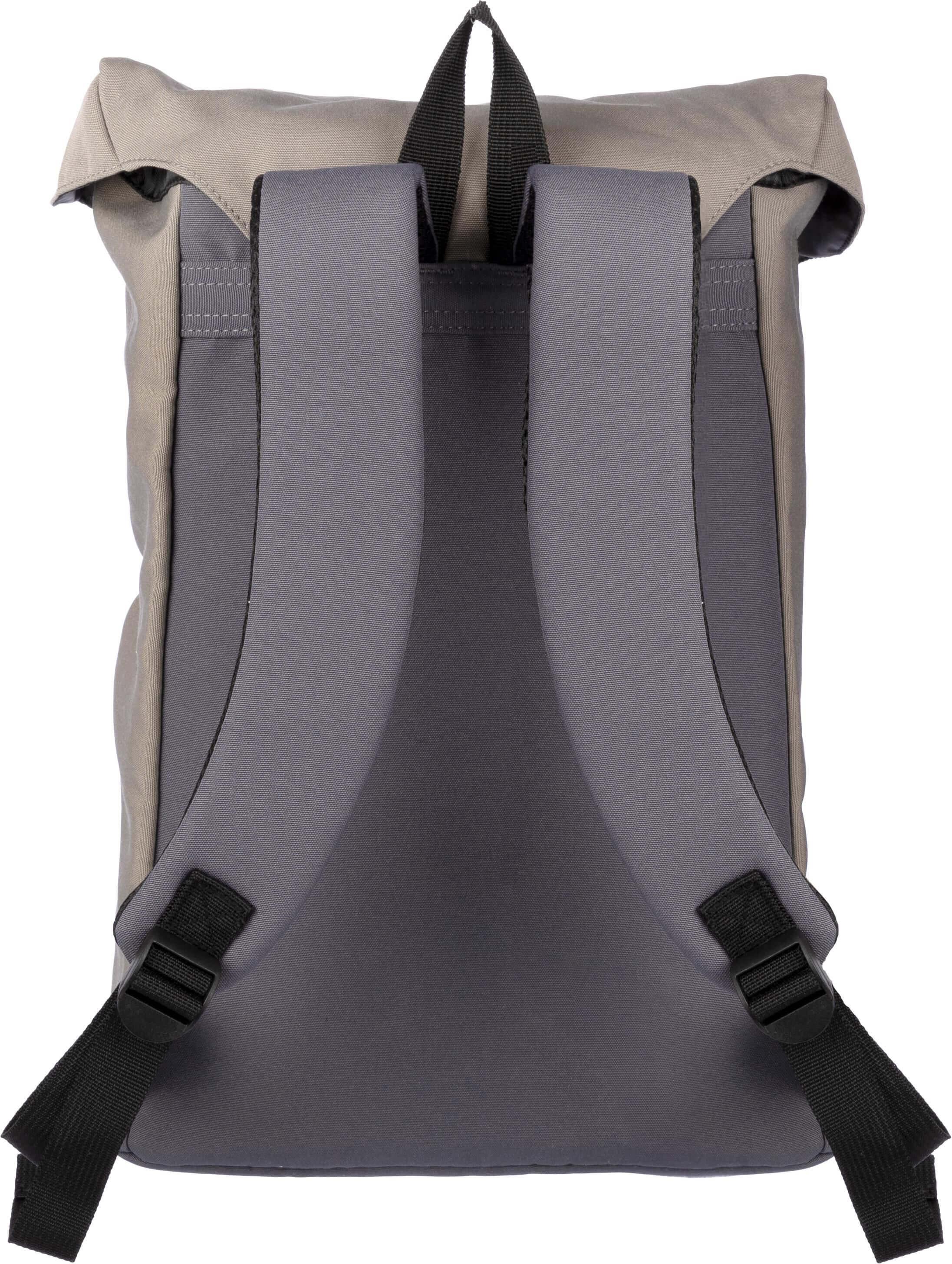 Mochila em poliéster (600D) com forro em PU (210D) e fundo e suporte em espuma PE (8 mm). Grande compartimento com cordão e fecho de fivela e bolsa para portátil (15 polegadas). Bolso na parte da frente com botões de metal. Alças ajustáveis.