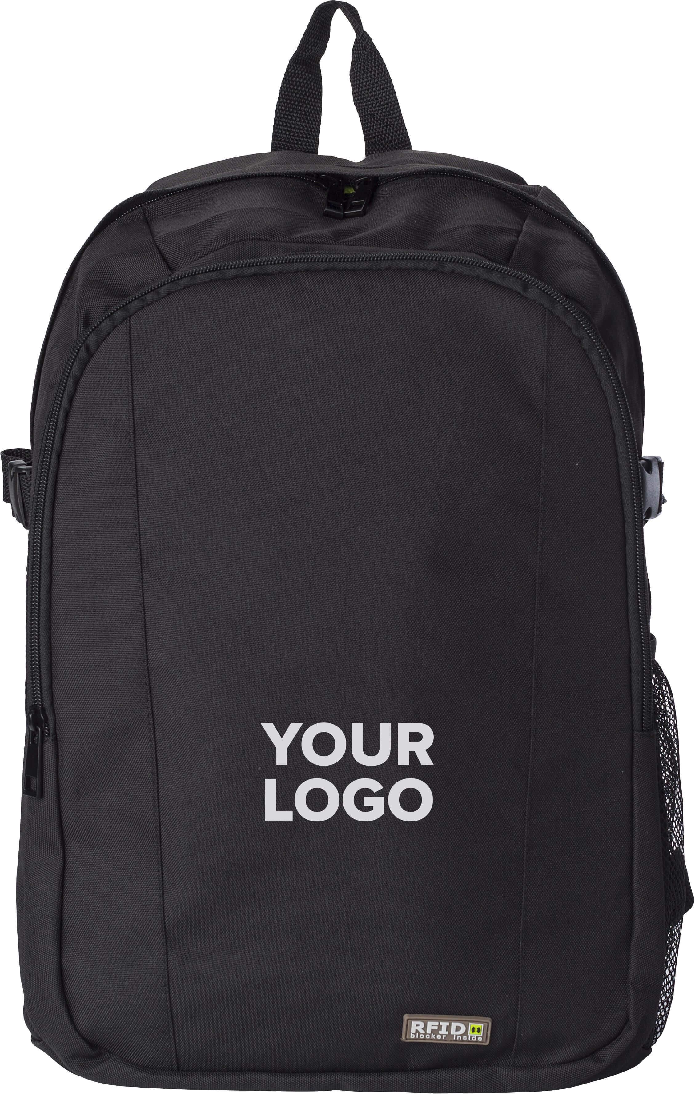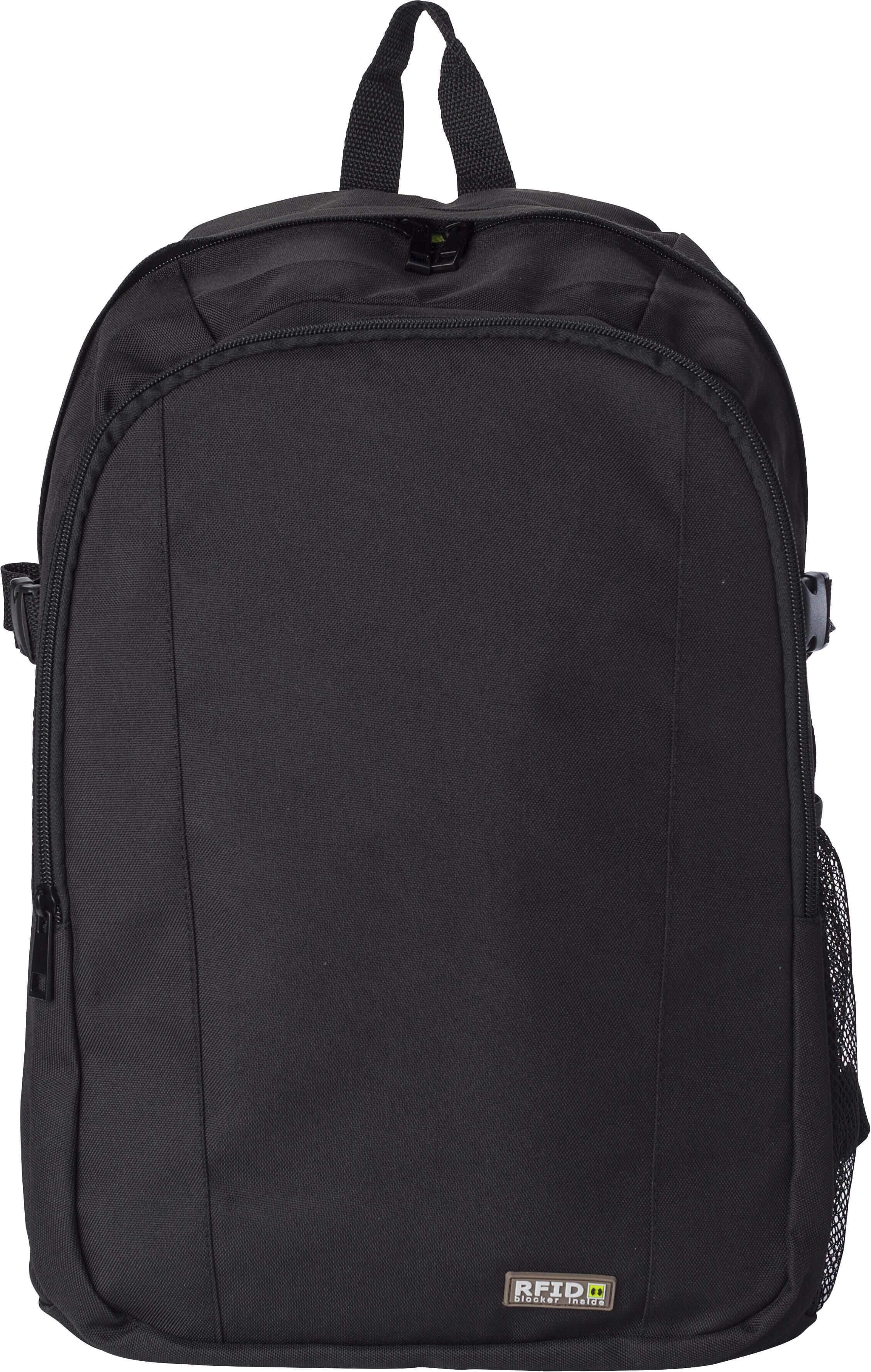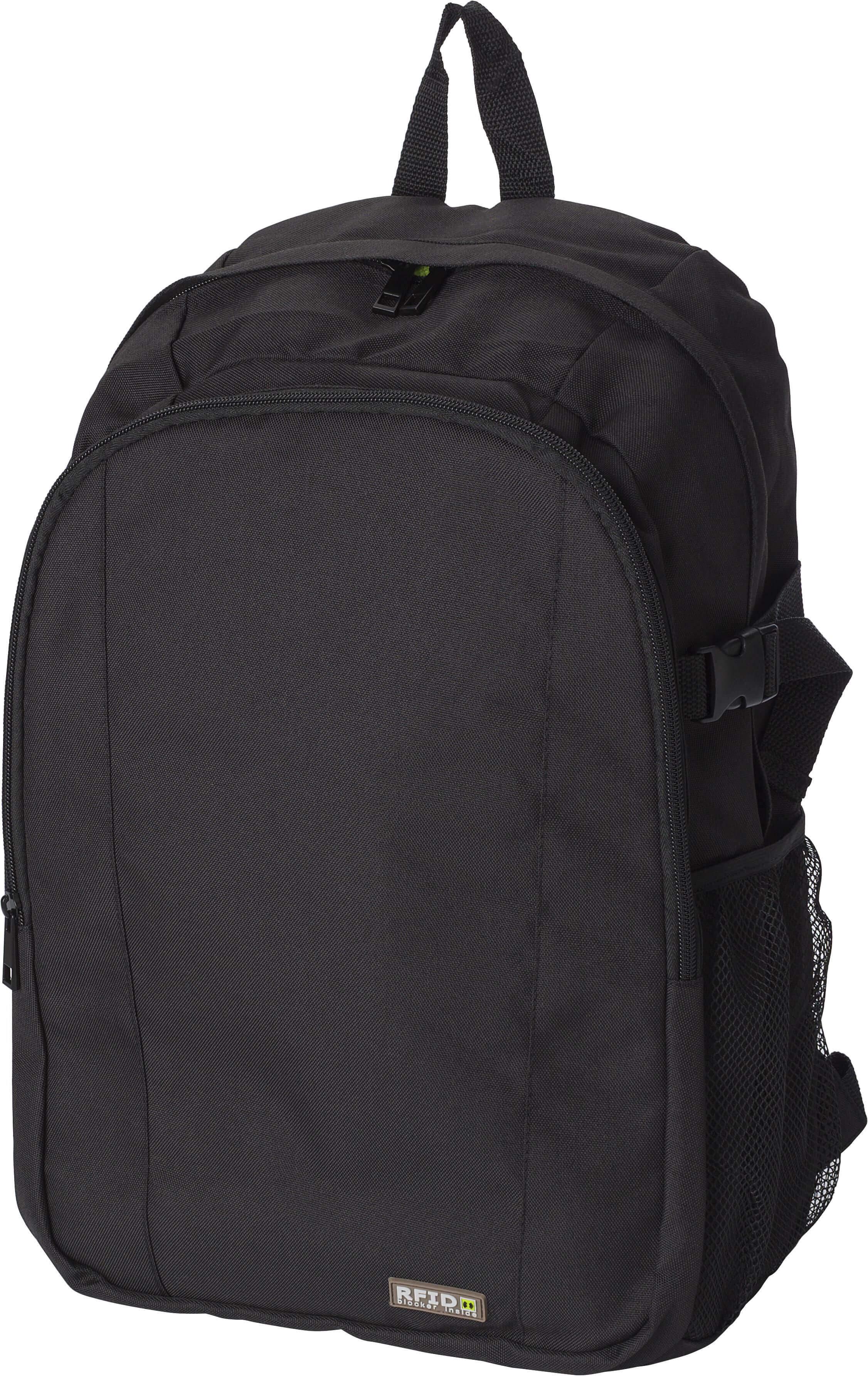 Mochila de poliéster (600D) com proteção RFID. Com um grande compartimento e fecho de correr, vários bolsos e espaço para o computador portátil (14 polegadas). Alças acolchoadas e ajustáveis.
