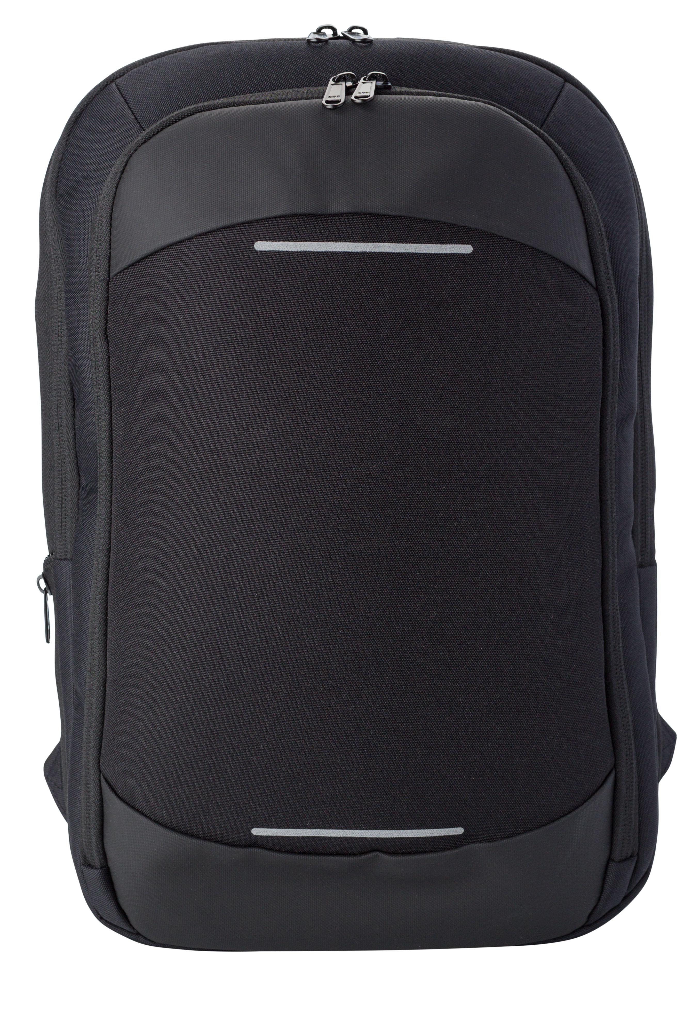 Mochila de poliéster (600D) com bolso frontal com fecho de correr e alças acolchoadas ajustáveis. Com um bolso secreto na parte de trás e faixas refletoras na frente.
