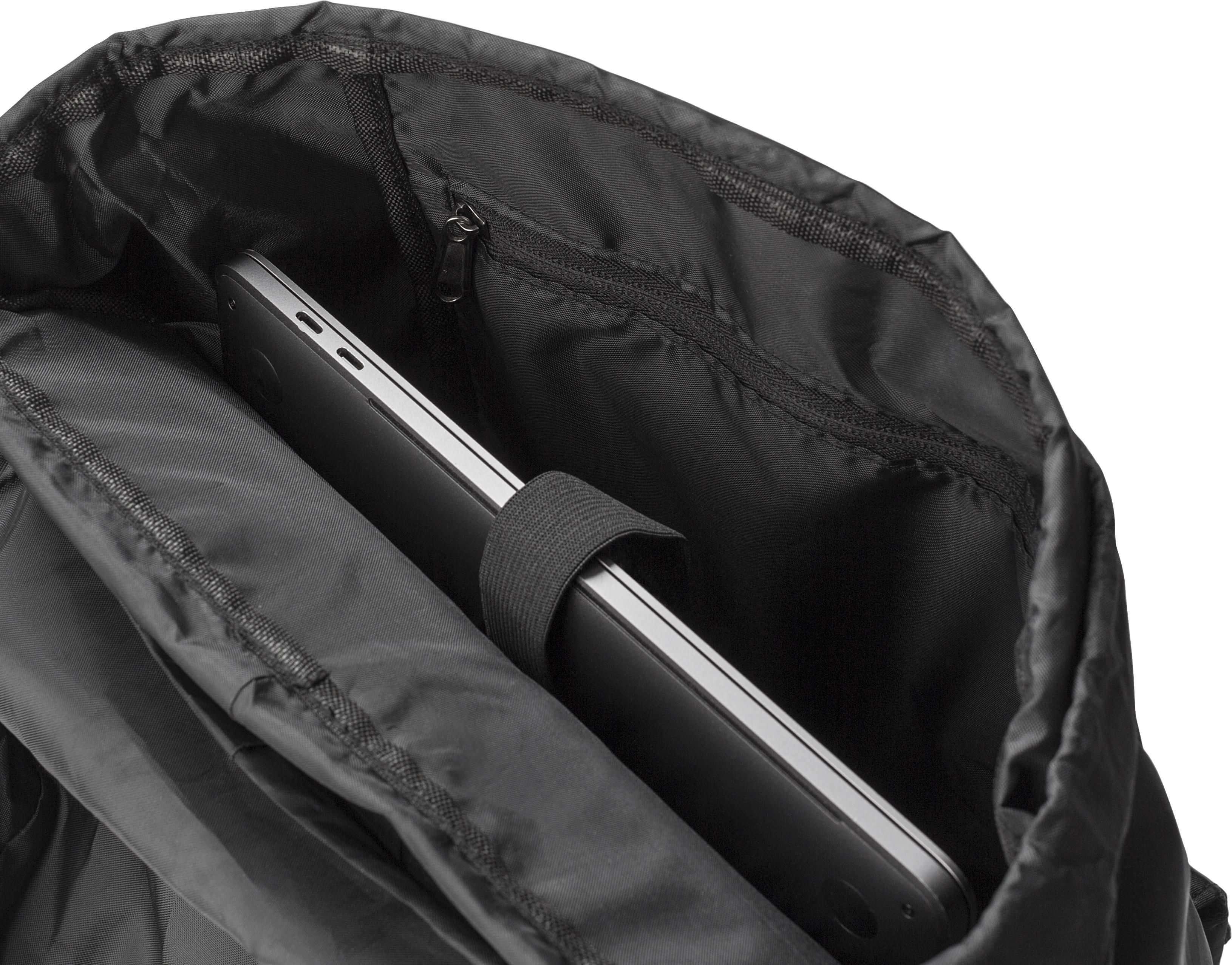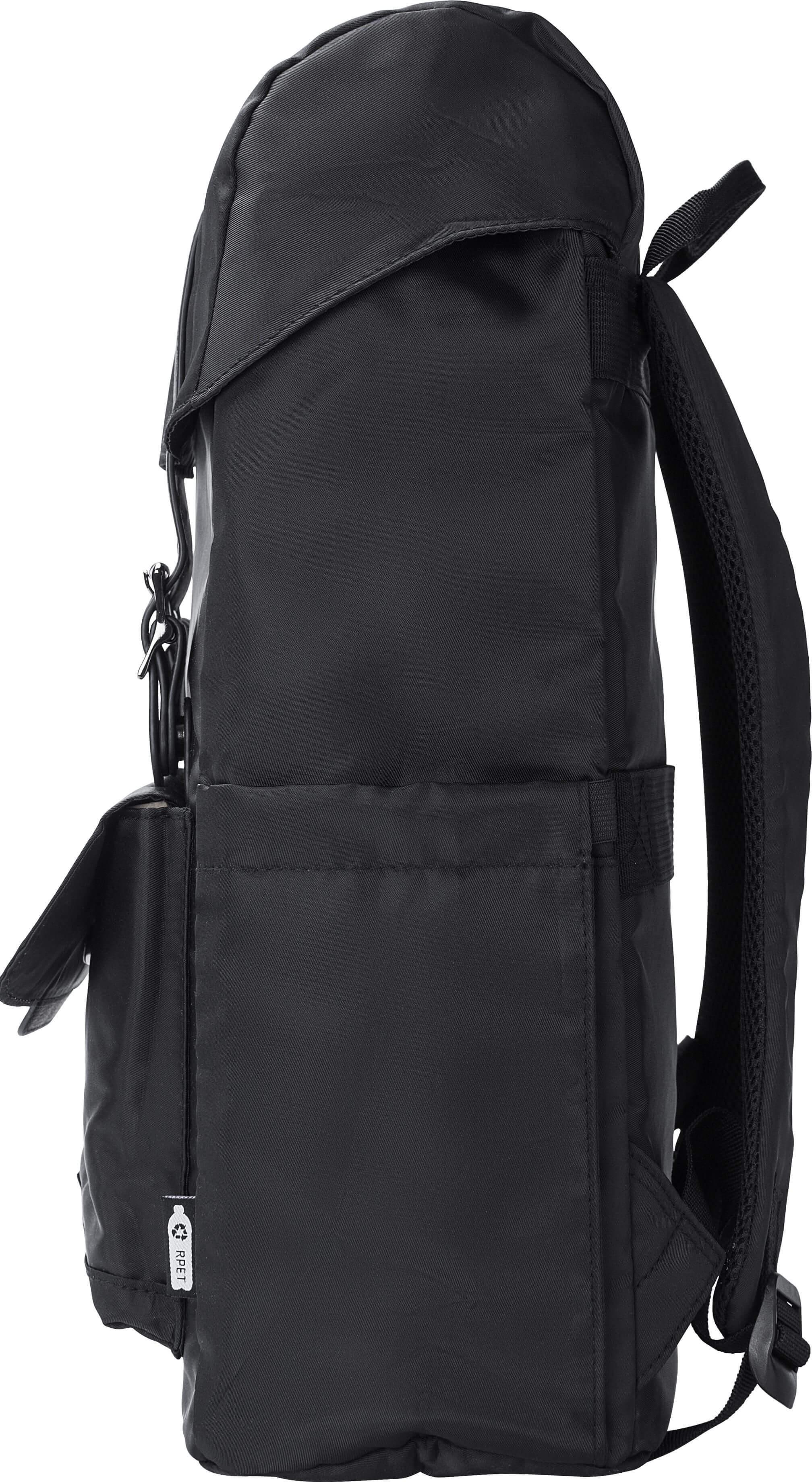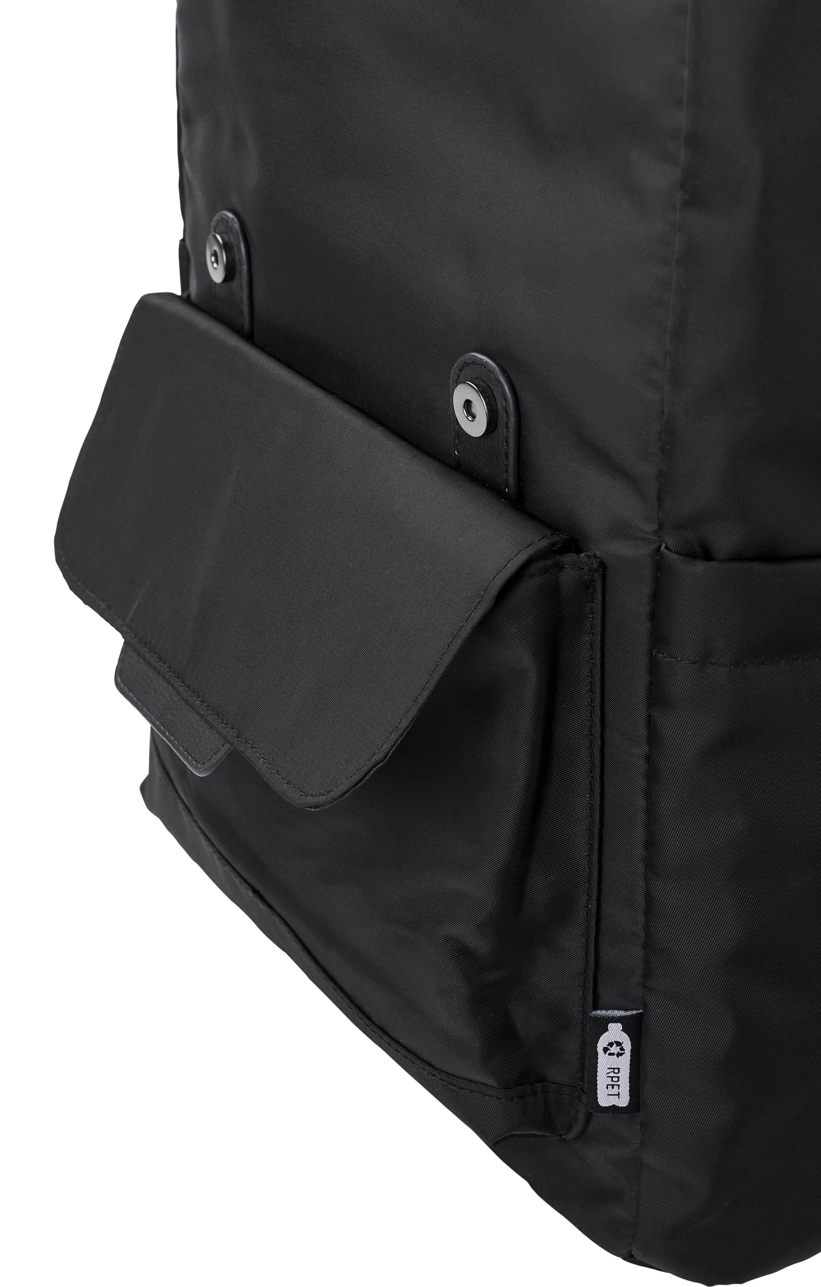 Mochila de aba em sarja de poliéster rPET (290T) com alças em PU. Possui dois bolsos laterais para garrafas e um bolso com fecho magnético na parte da frente. O interior tem dois bolsos, um bolso almofadado para portátil de 15” e fecho com cordão. Alça para trolley e forro repelente à água.