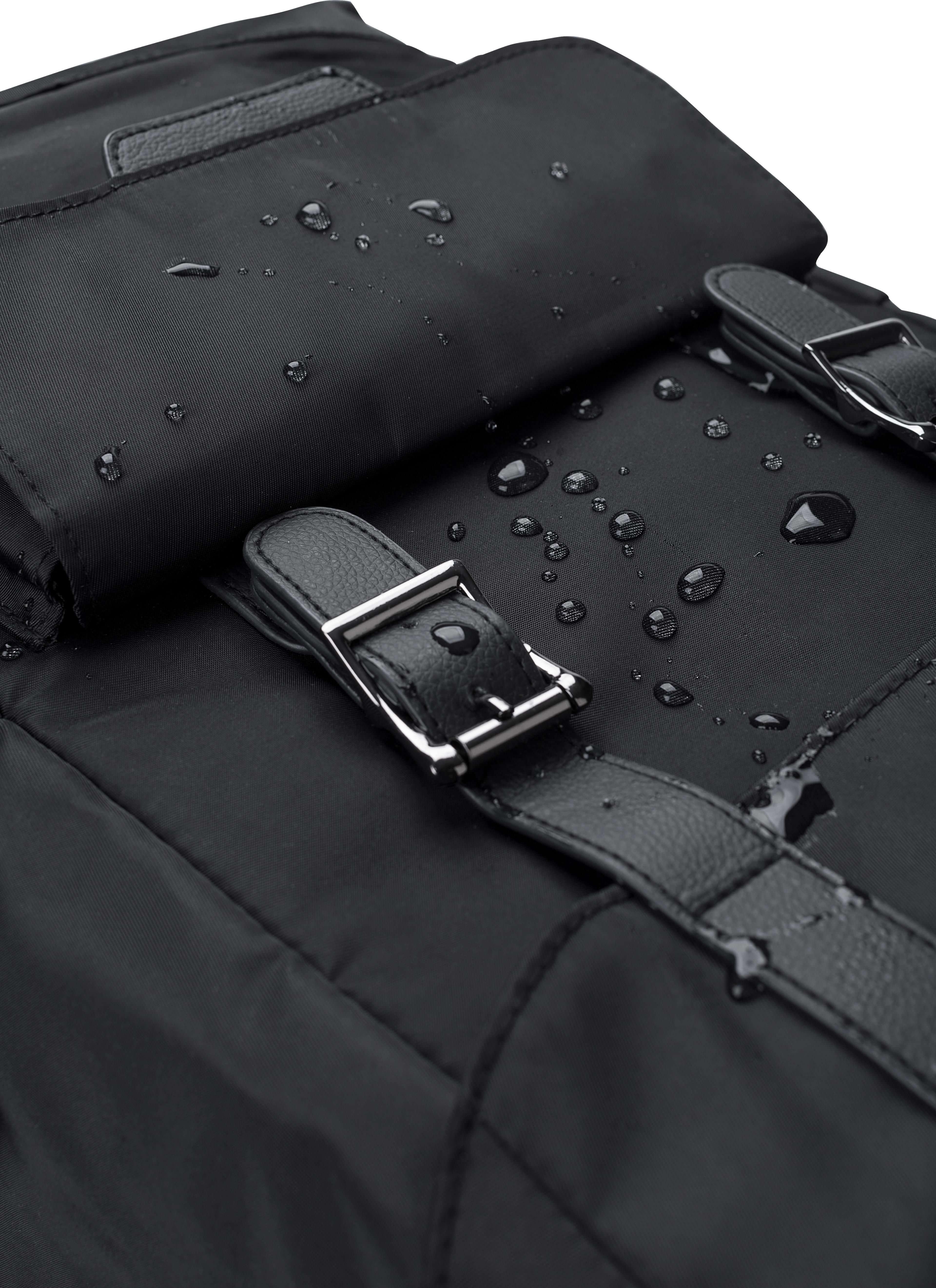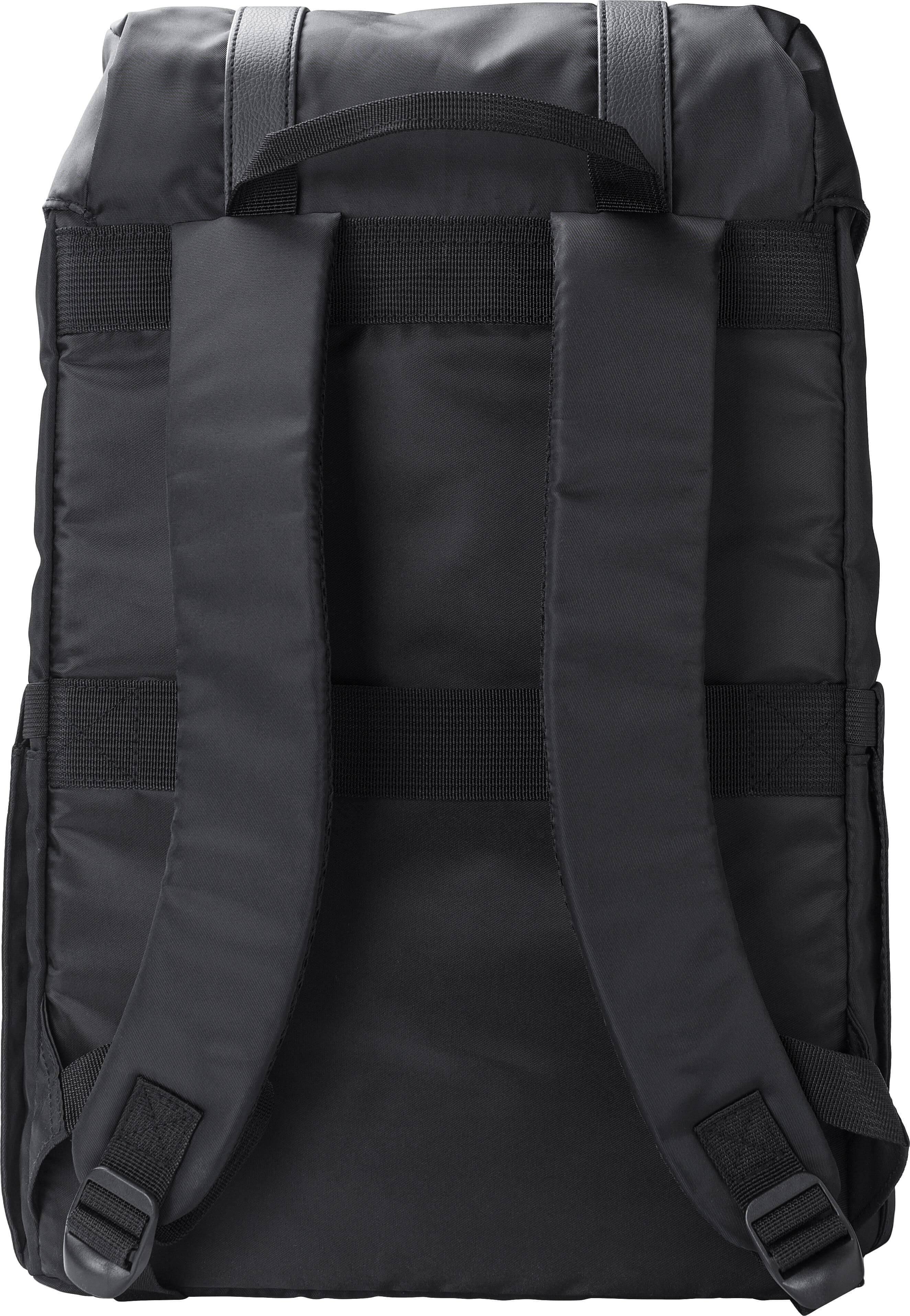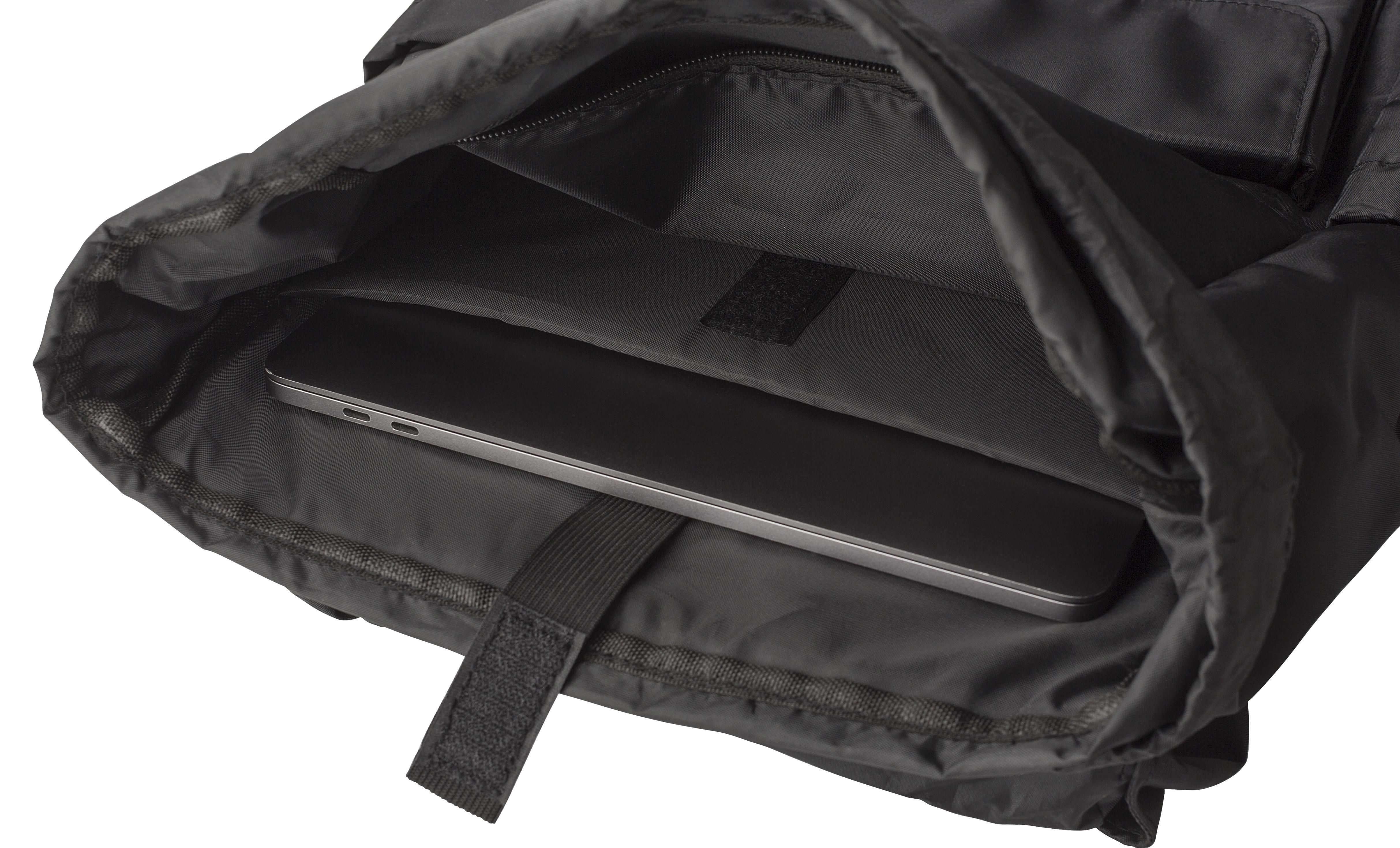 Mochila de aba em sarja de poliéster rPET (290T) com alças em PU. Possui dois bolsos laterais para garrafas e um bolso com fecho magnético na parte da frente. O interior tem dois bolsos, um bolso almofadado para portátil de 15” e fecho com cordão. Alça para trolley e forro repelente à água.