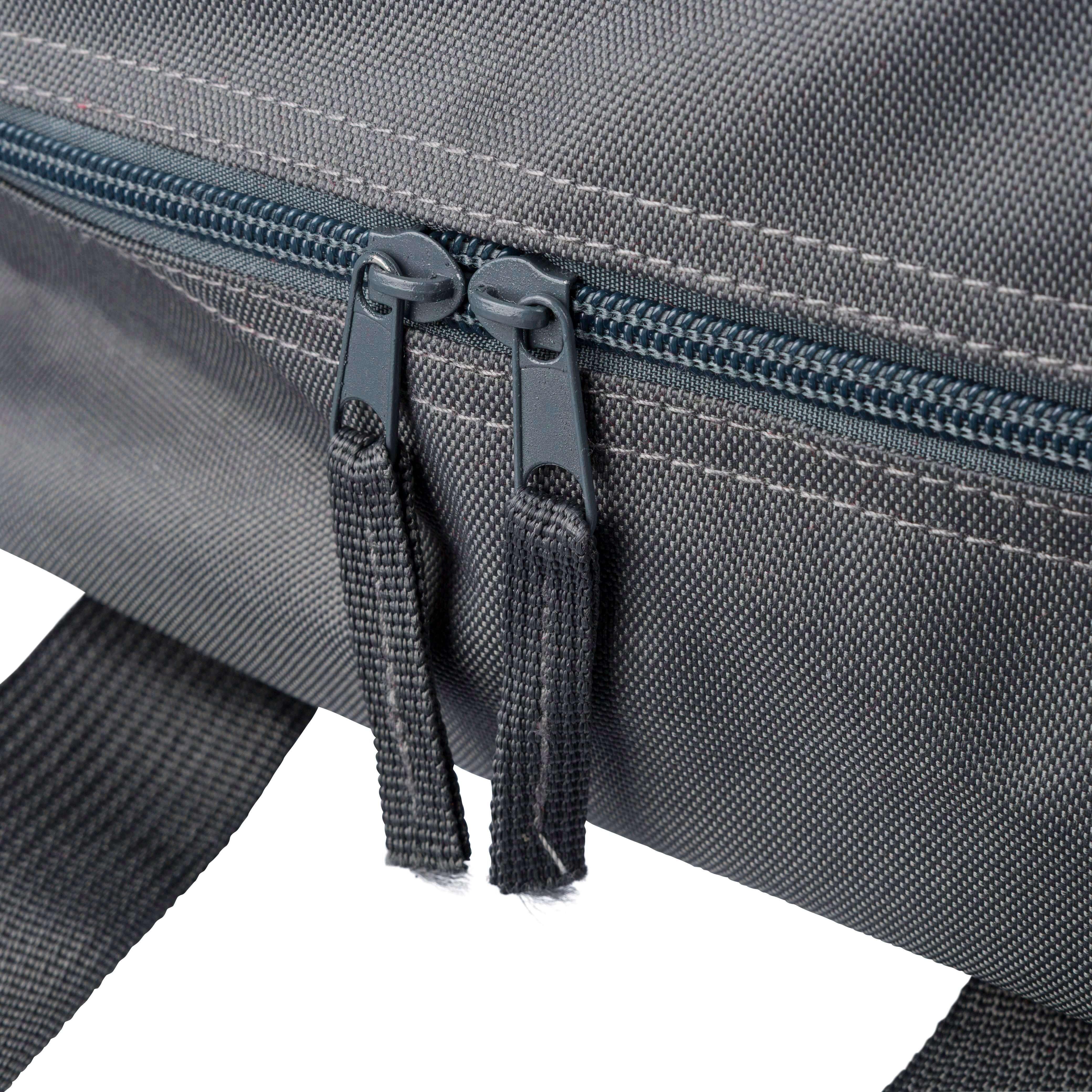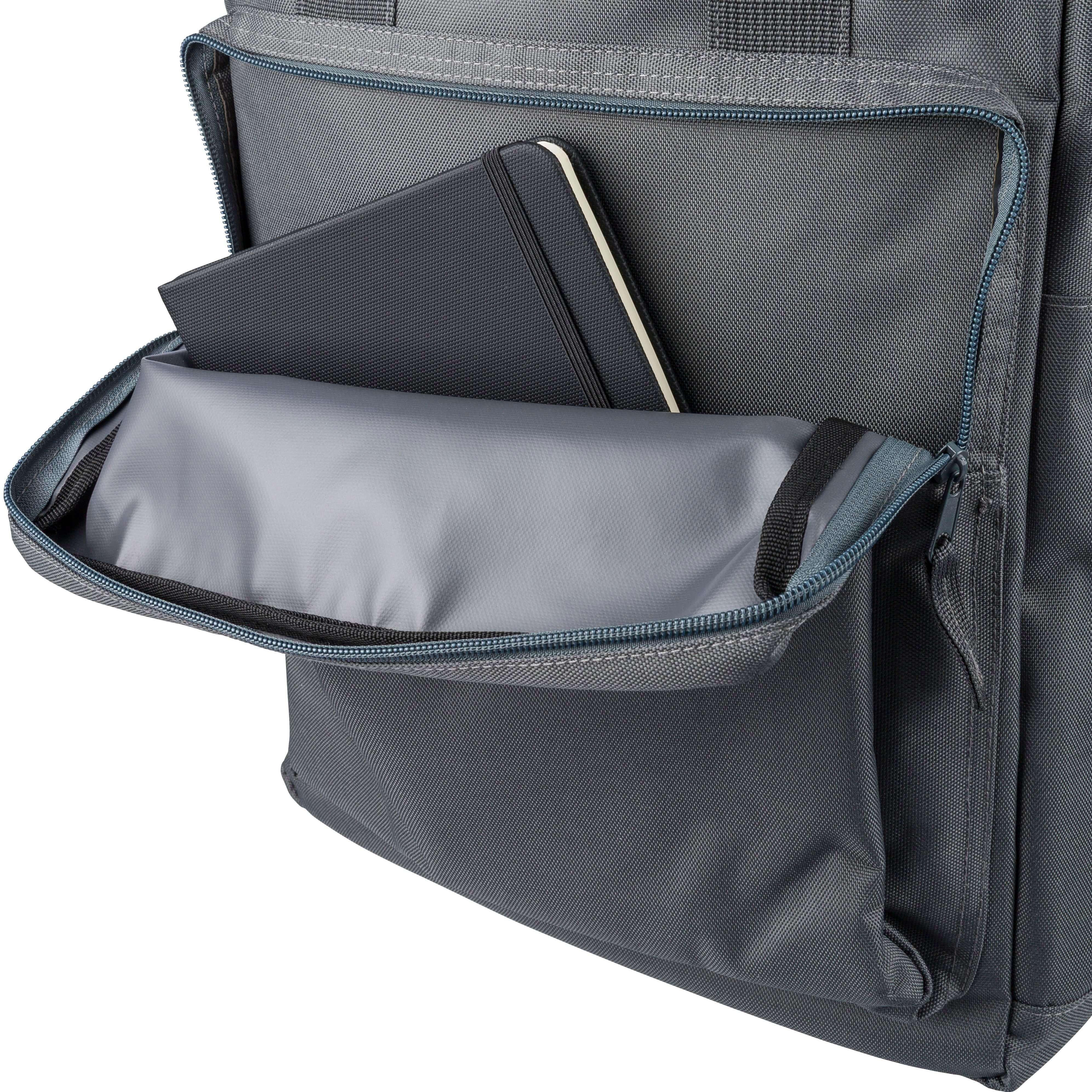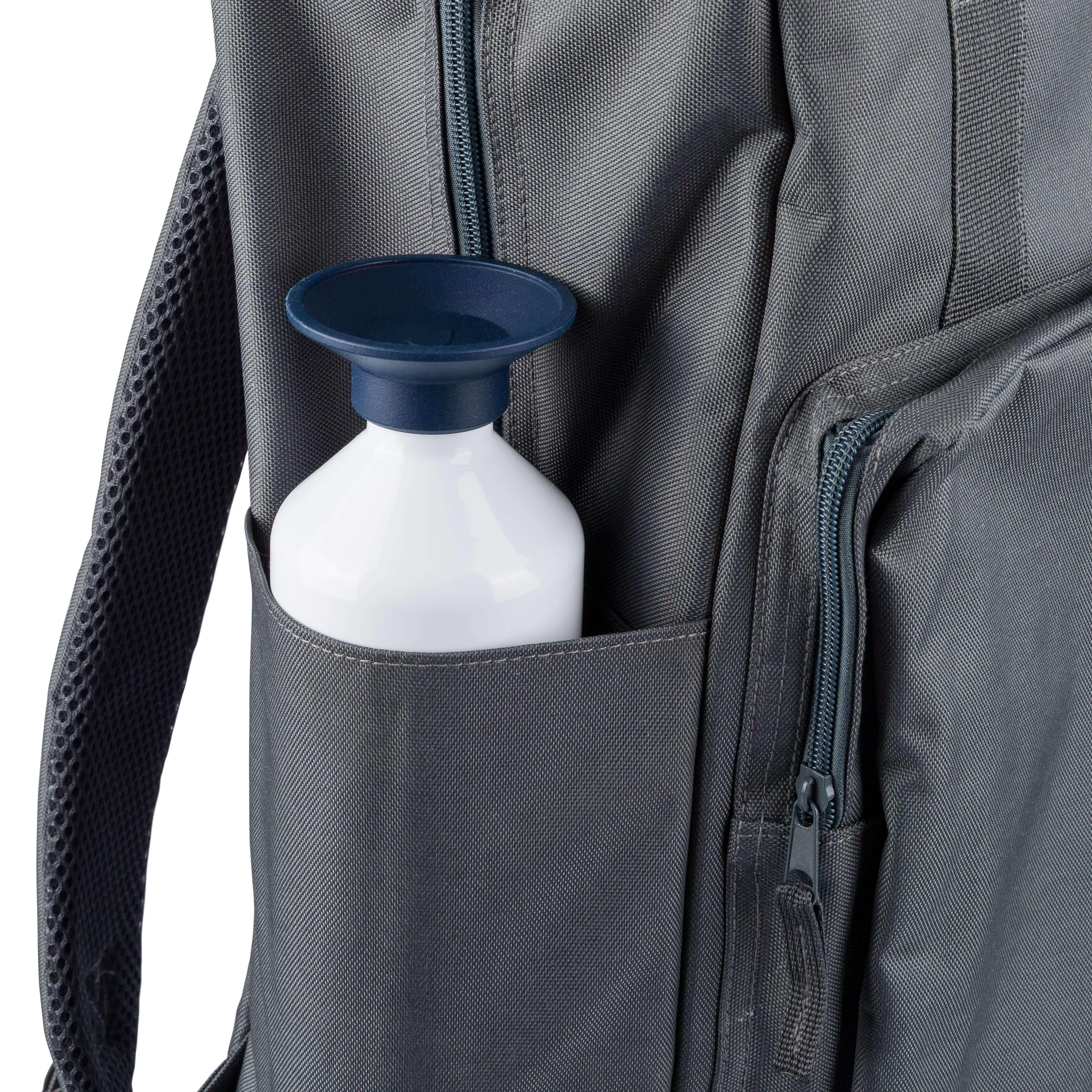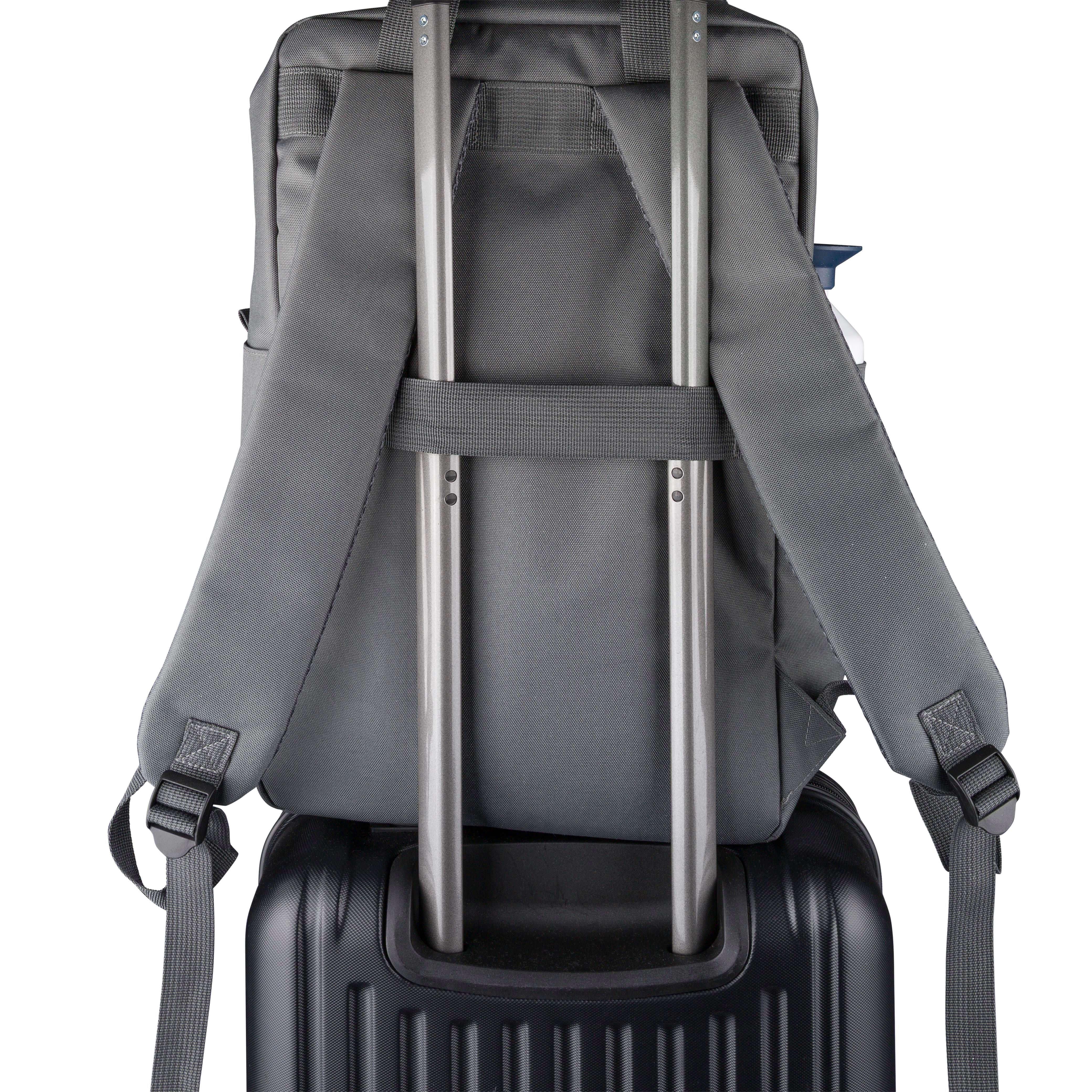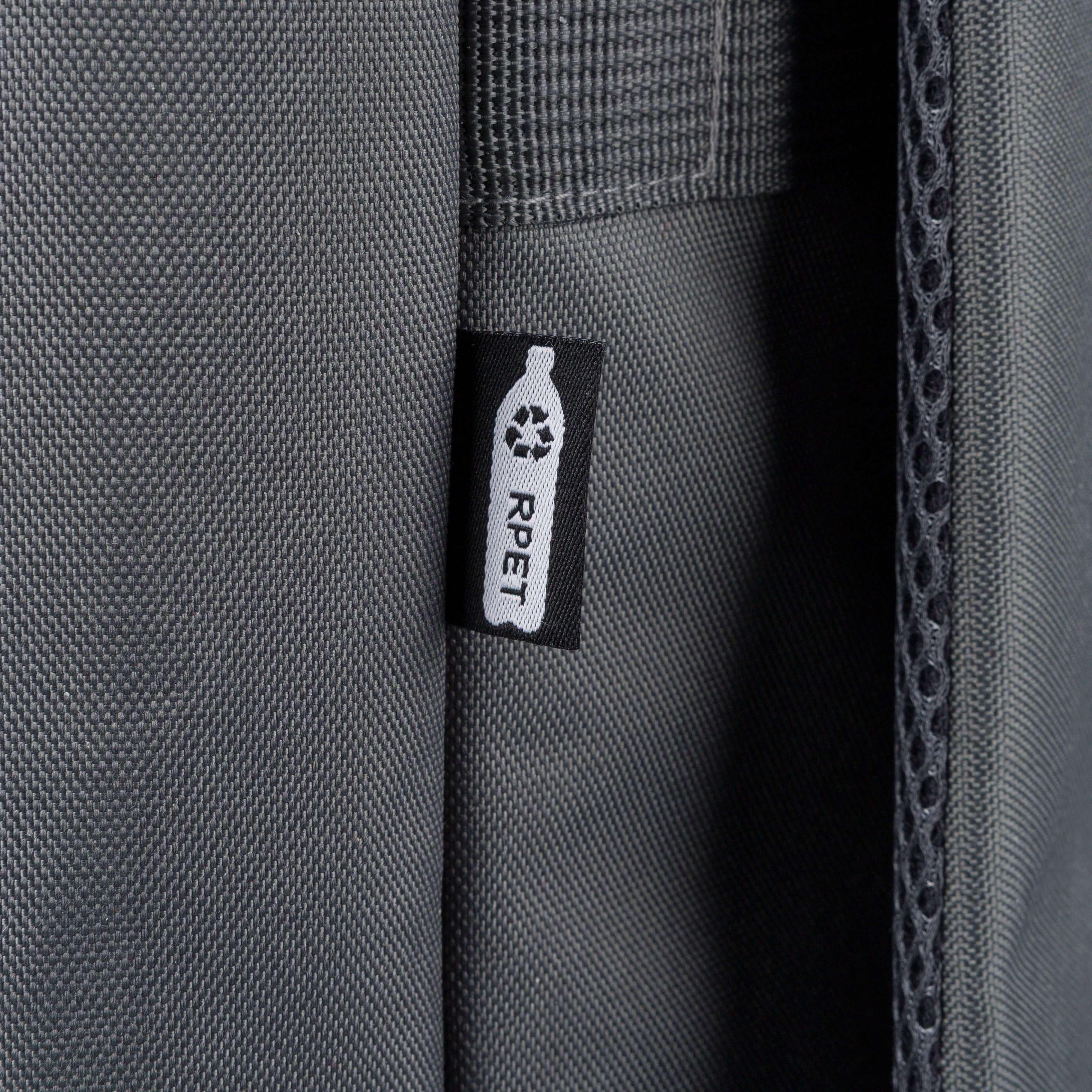 Mochila em poliéster 900D reciclado com forro 210D e etiqueta rPET na lateral. Possui um grande compartimento principal com fecho e bolso para computador portátil de 16 polegadas, um compartimento frontal mais pequeno com fecho, dois bolsos laterais e alça para trolley. Inclui alças superiores com fecho de botão e alças ajustáveis e ventiladas.